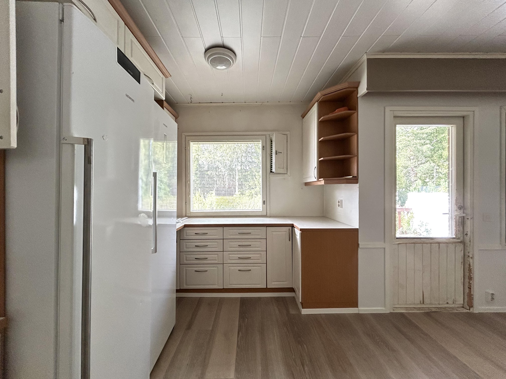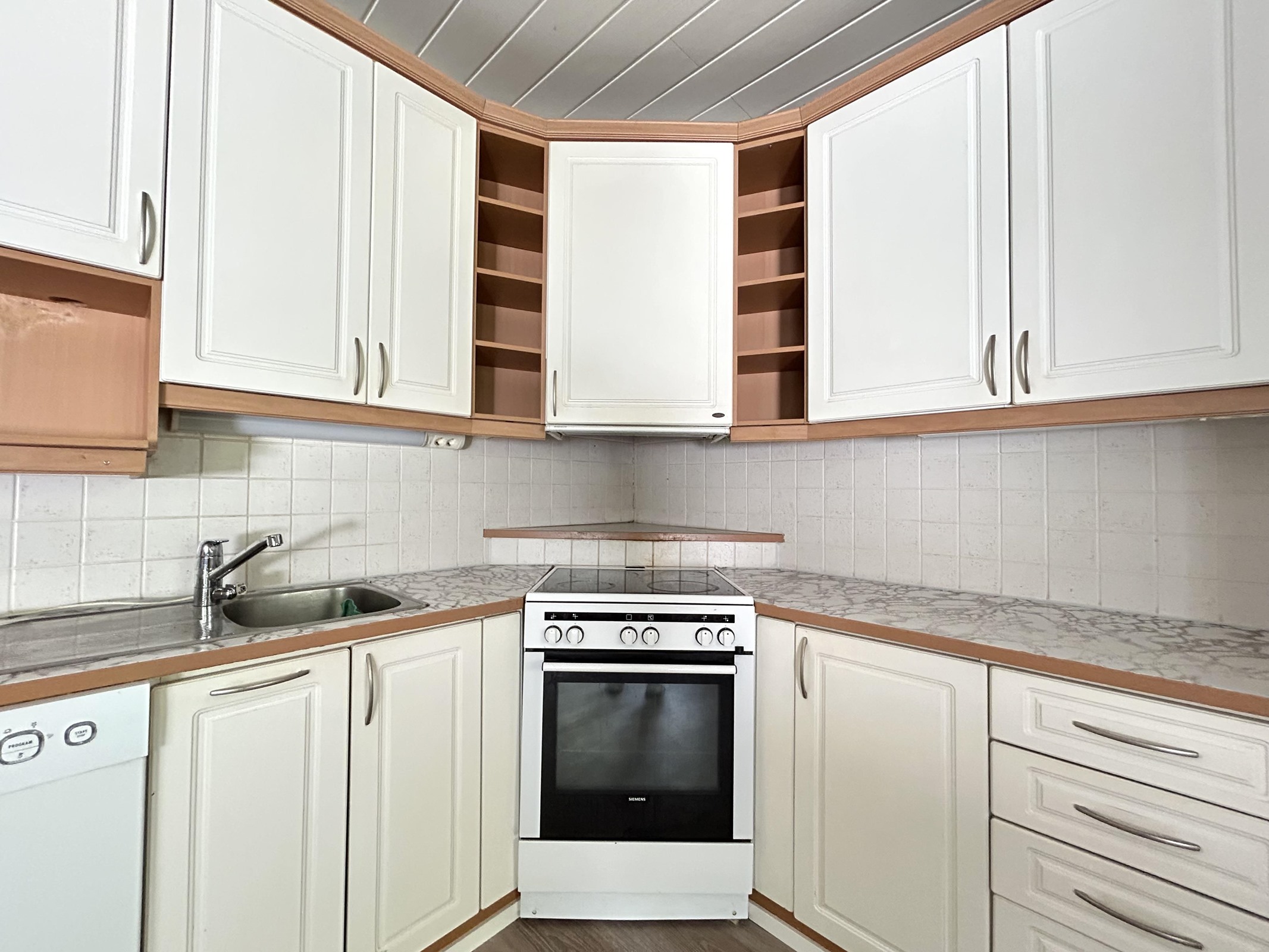 - Jääkaappi, pakastekaappi, keraaminen liesi, liesituuletin, astianpesukone, kaapistot, kiinteät valaisimet.