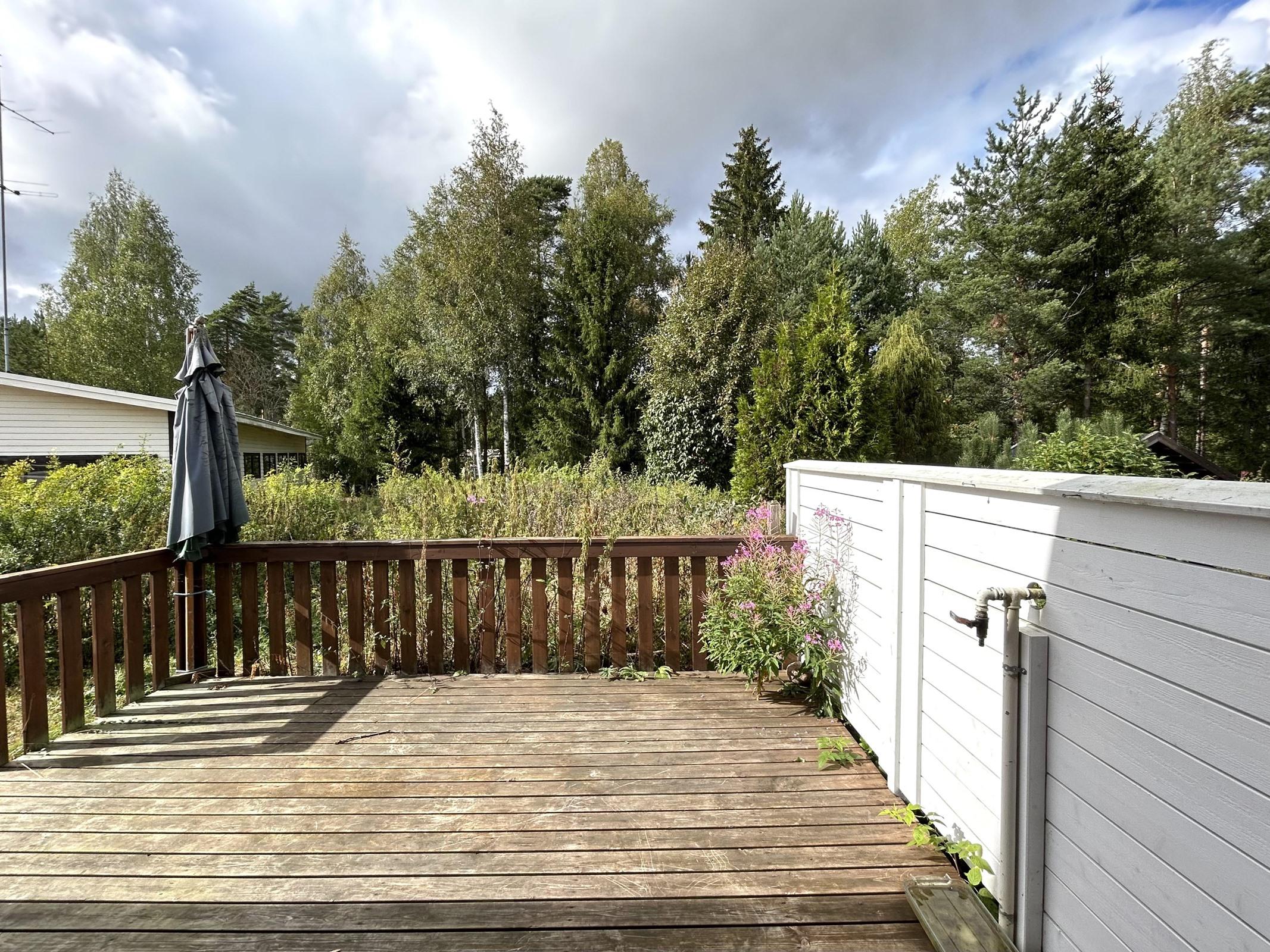 Oman pihan puolella tilava terassi. Kodin varusteluun kuuluu myös autokatos.