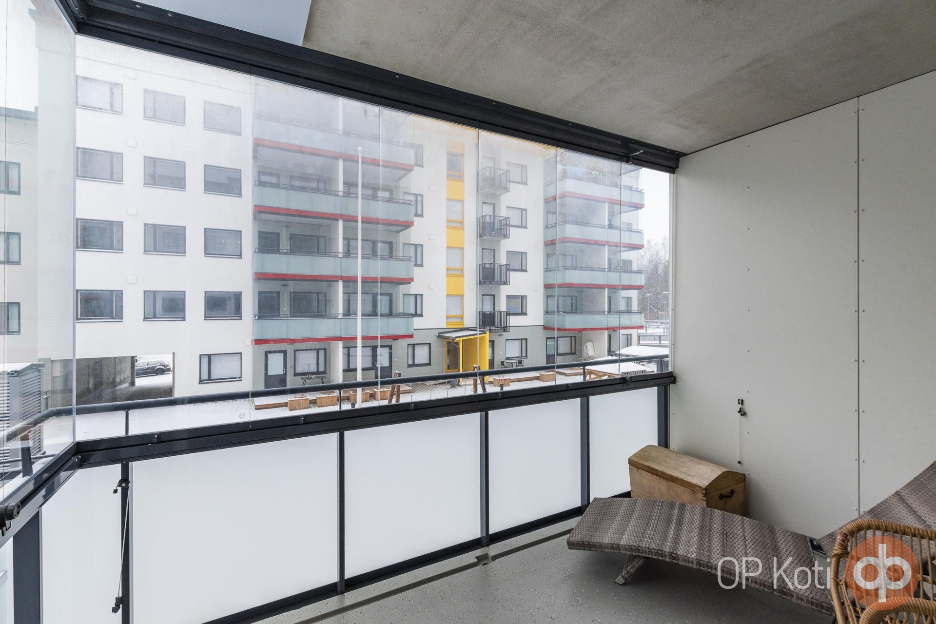 Tämän seesteisen ja sävyiltään hillityn kodin tilaratkaisut ovat toimivat. Keittiötila yhdistyy avaraan olohuoneeseen saumattomasti, olohuoneesta käynti lasitetulle parvekkeelle. Kaksi makuuhuonetta, toisen yhteydessä tilava vaatehuone. Kaunis kylpyhuone ja tunnelmallinen sauna. Erillinen wc lisää asumismukavuutta.