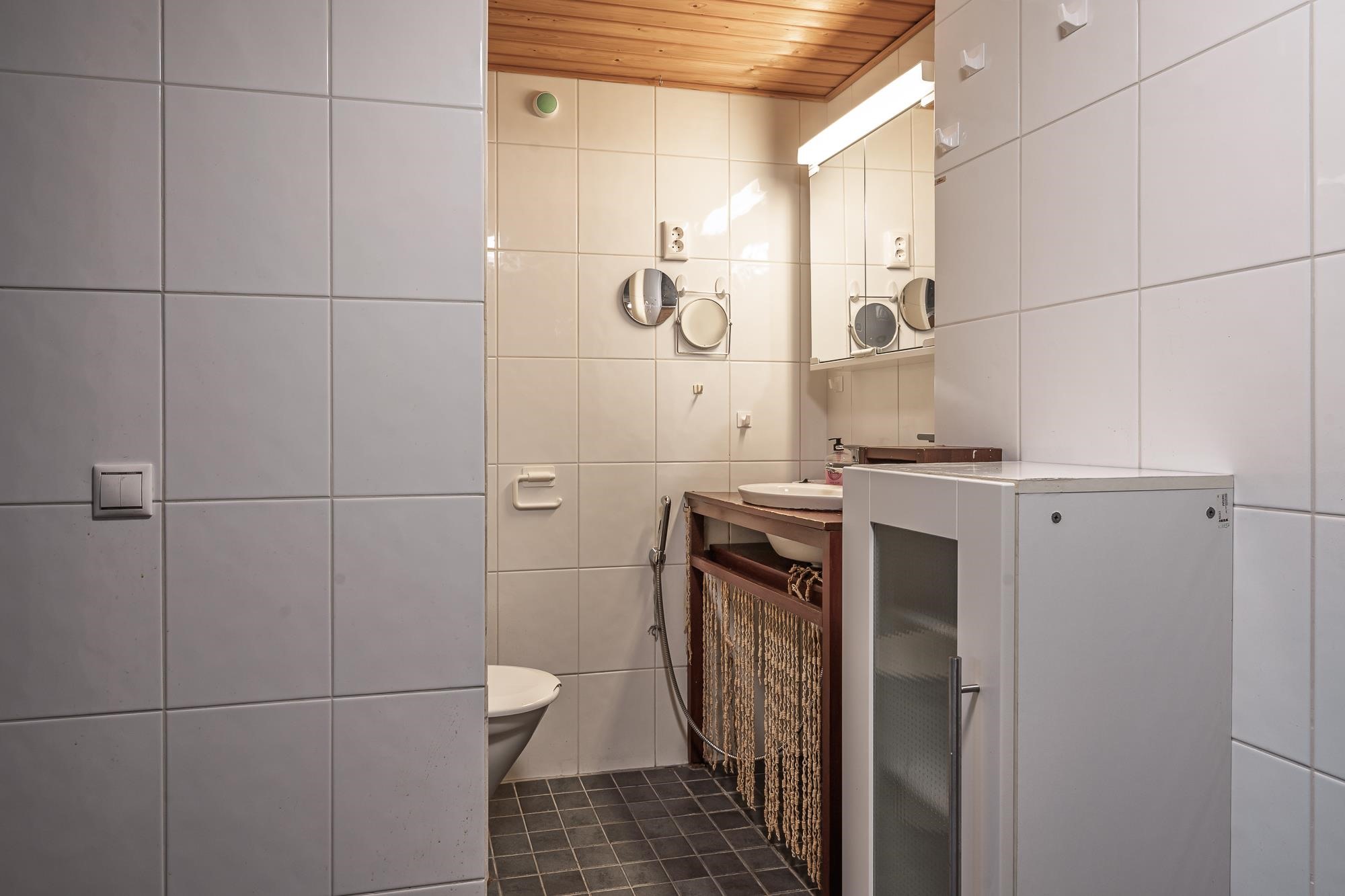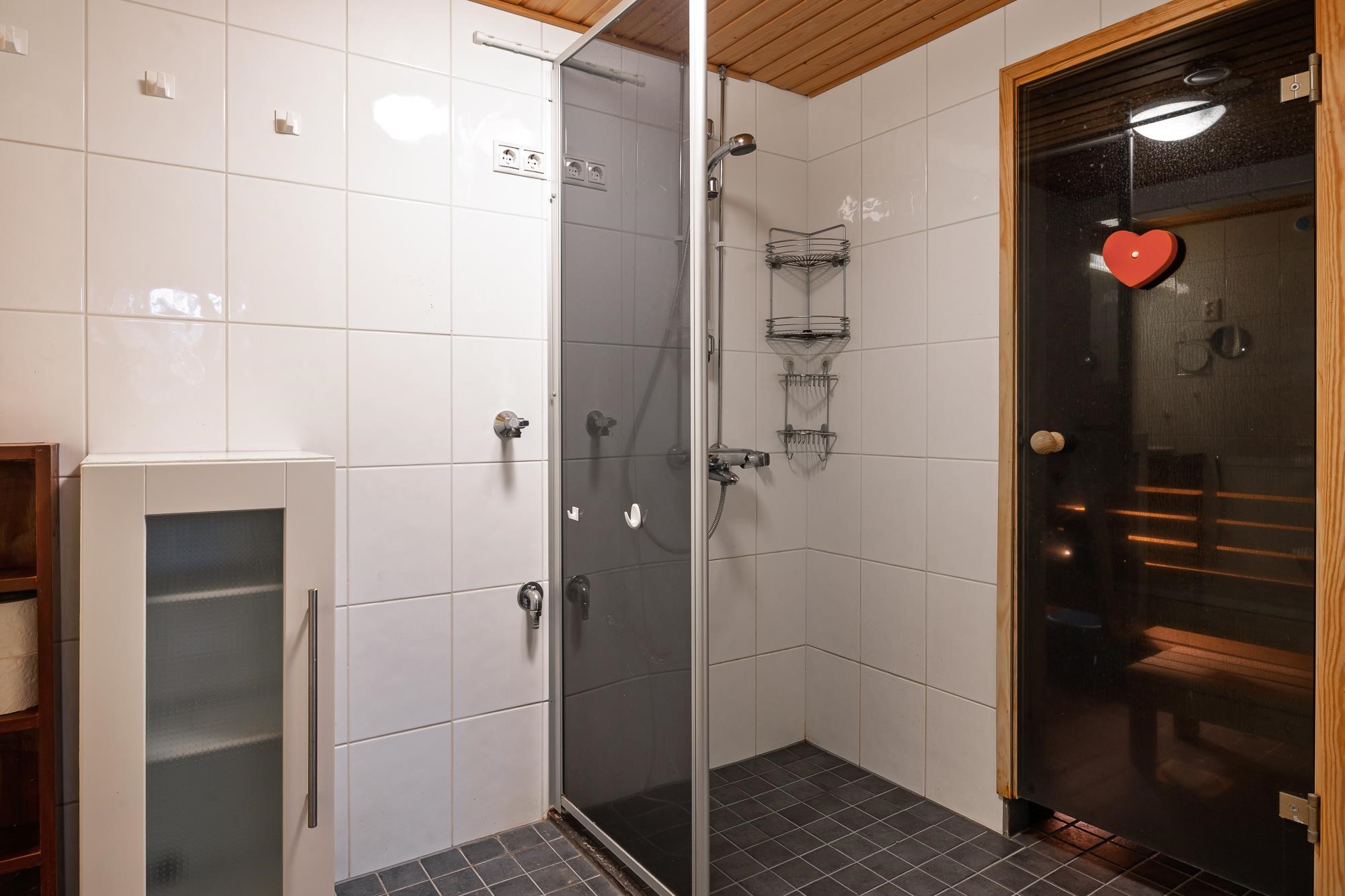 - Sauna, sähkökiuas, kylpyhuone, suihkuseinä, peilikaappi, pesukoneliitäntä, lattialämmitys, kiinteät valaisimet.