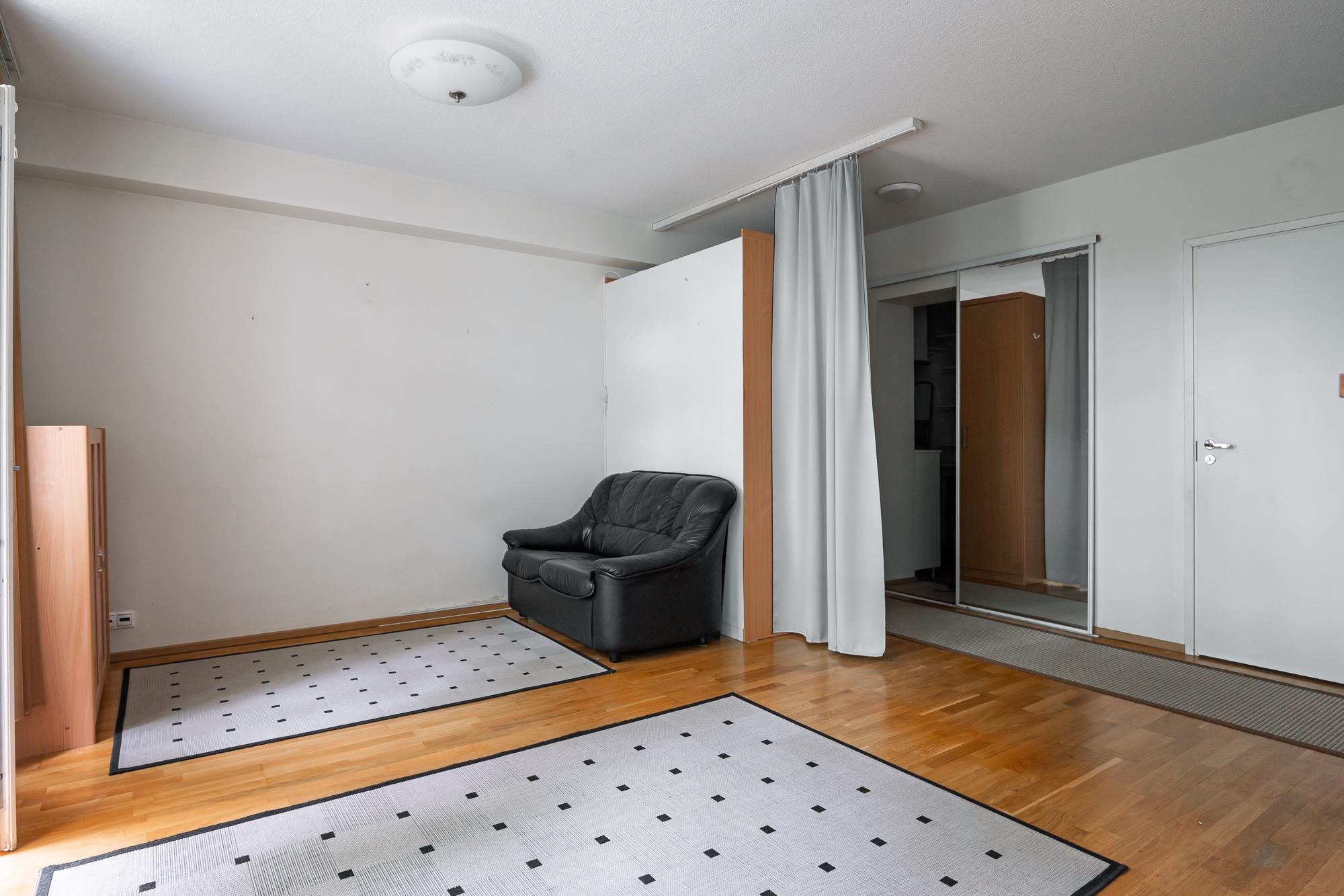 Keittiö: parketti, seinä maalattu. Olohuone: parketti, seinät maalattu. Makuuhuone 1: parketti, seinät maalattu. Sauna: paneloitu. Kylpyhuone: kaakeloitu.