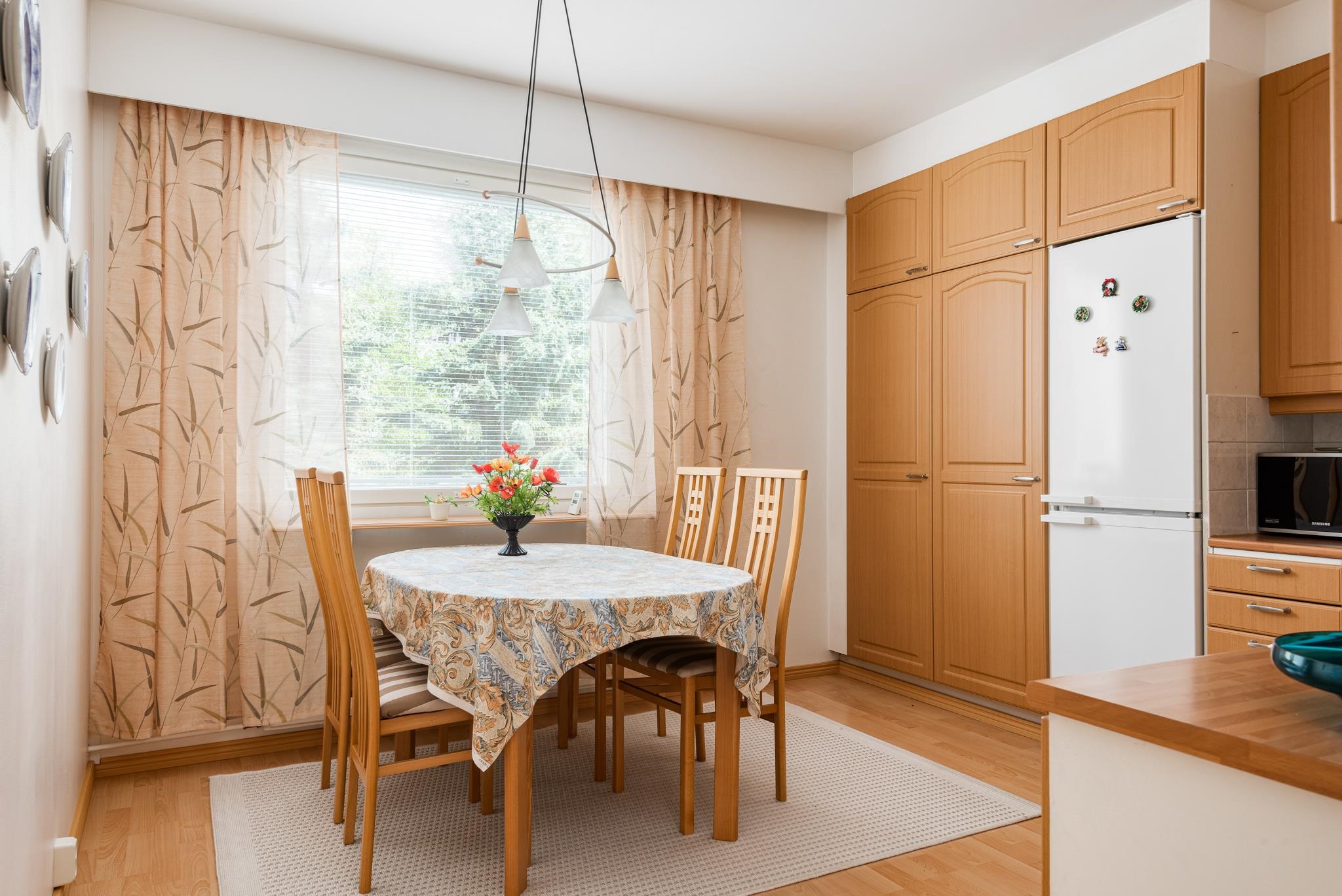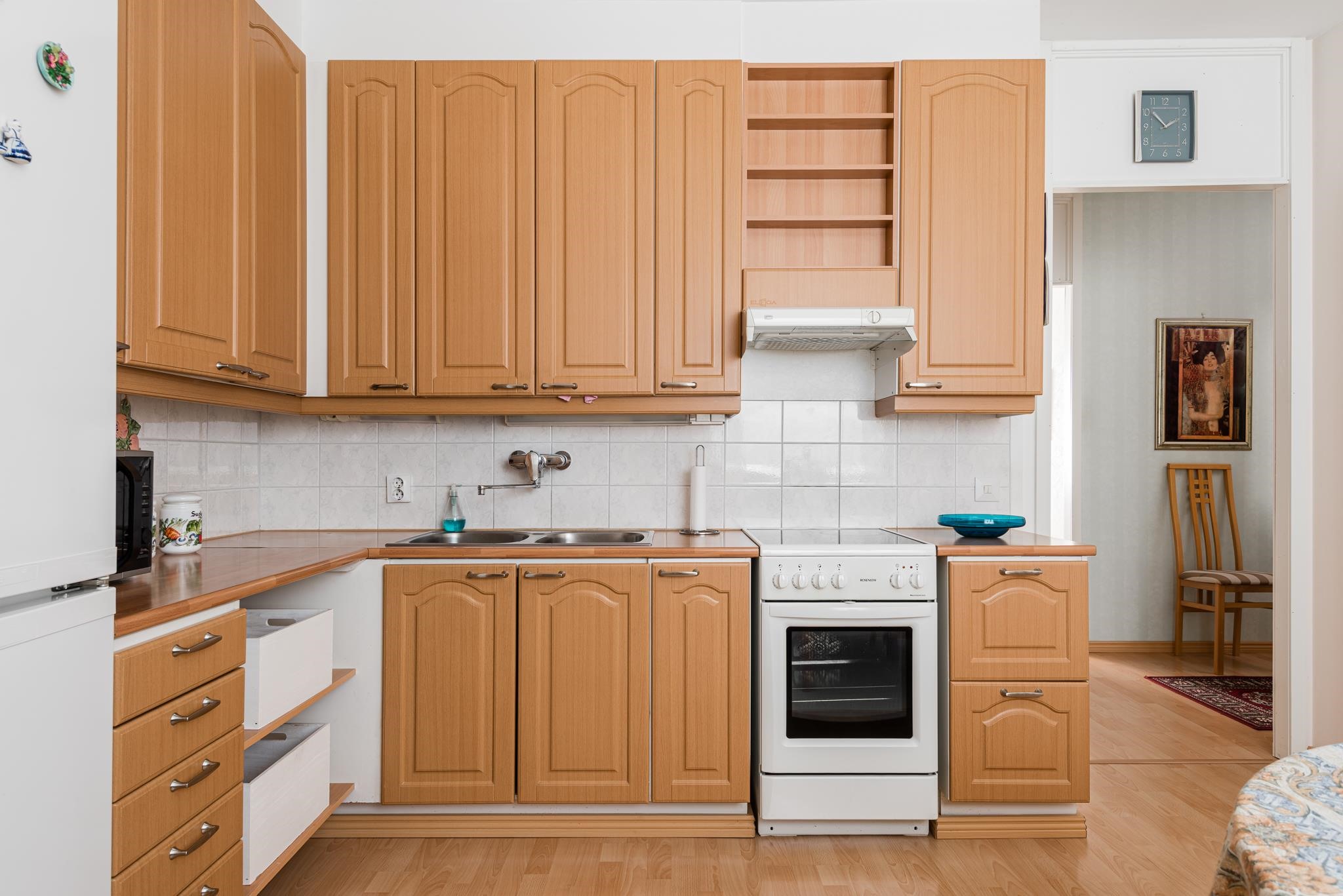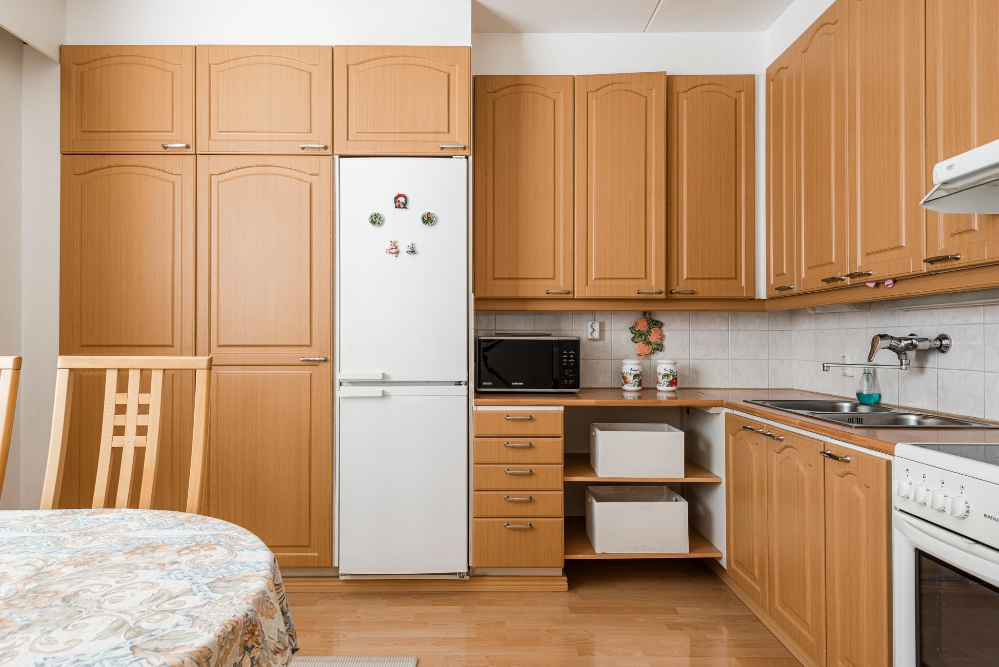 - Jääkaappipakastin, sähköliesi, kaapistot, kiinteät valaisimet.