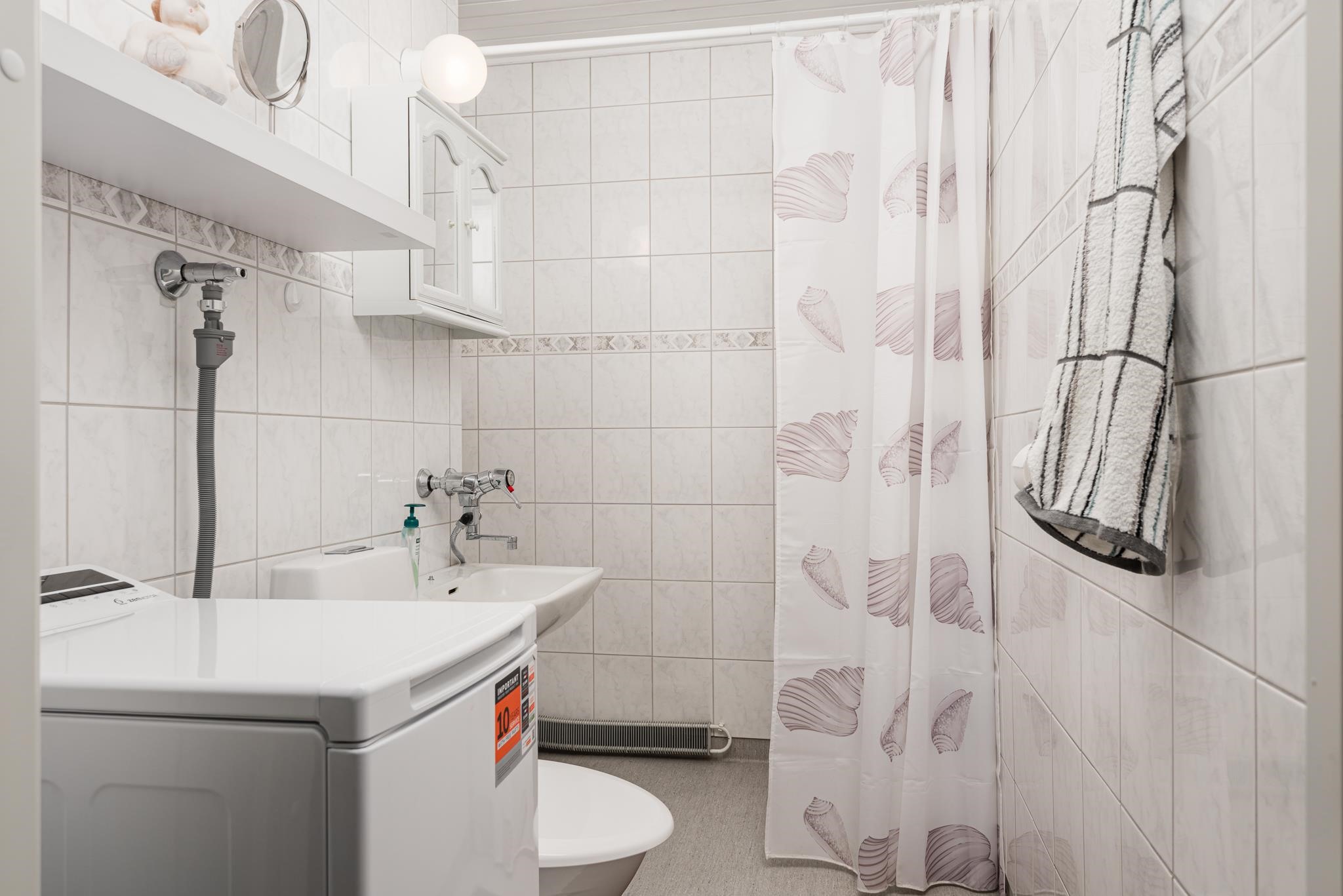 - Kylpyhuone, suihku, peilit, pesukoneliitäntä, kiinteät valaisimet. Seinäkaivo