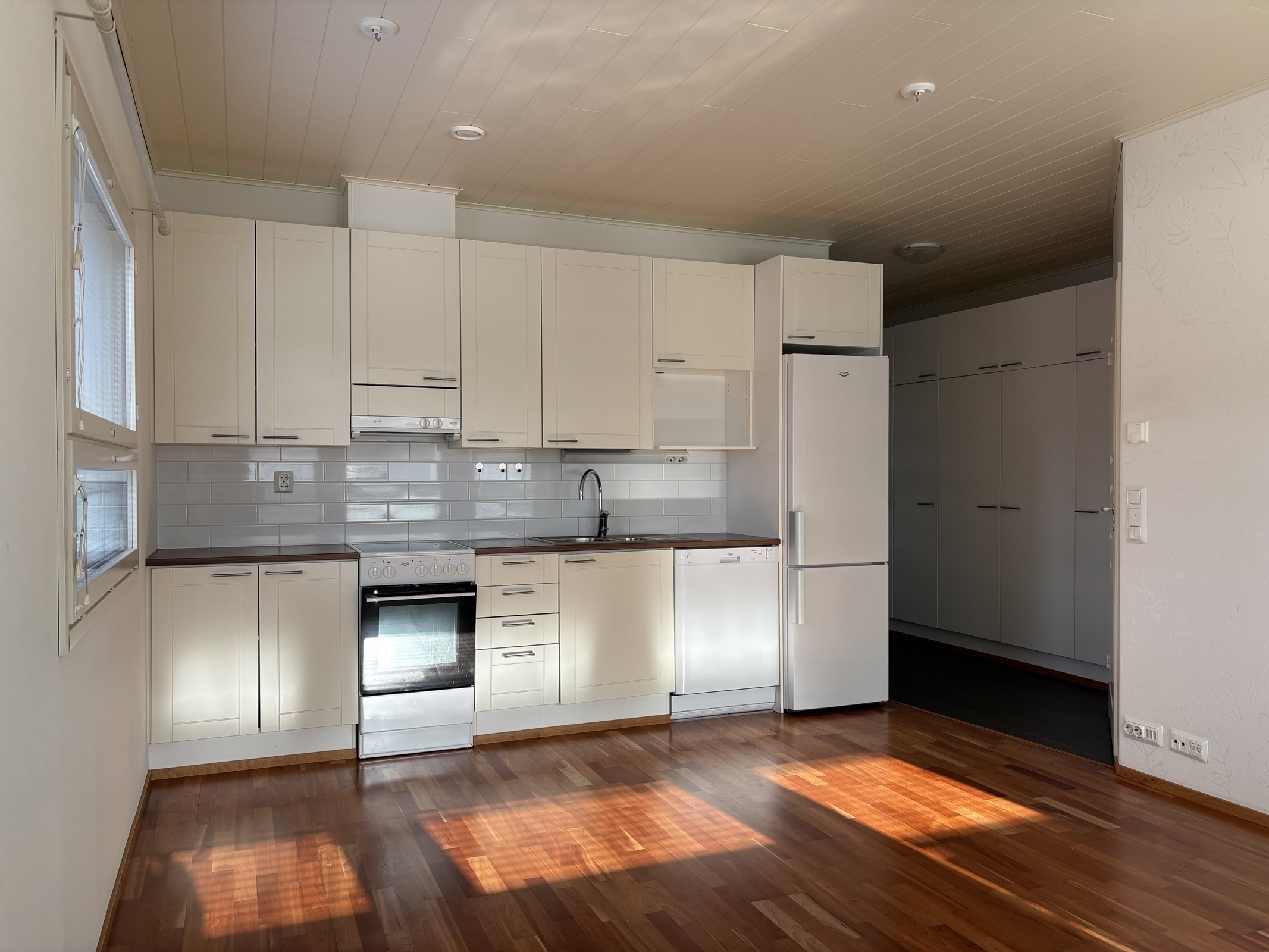 - Jääkaappipakastin, keraaminen liesi, liesituuletin, astianpesukone, kaapistot, kiinteät valaisimet.
