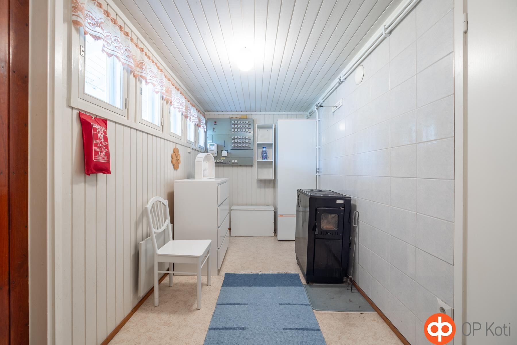 - Sähkö. Kodinhoitohuoneessa kamina.