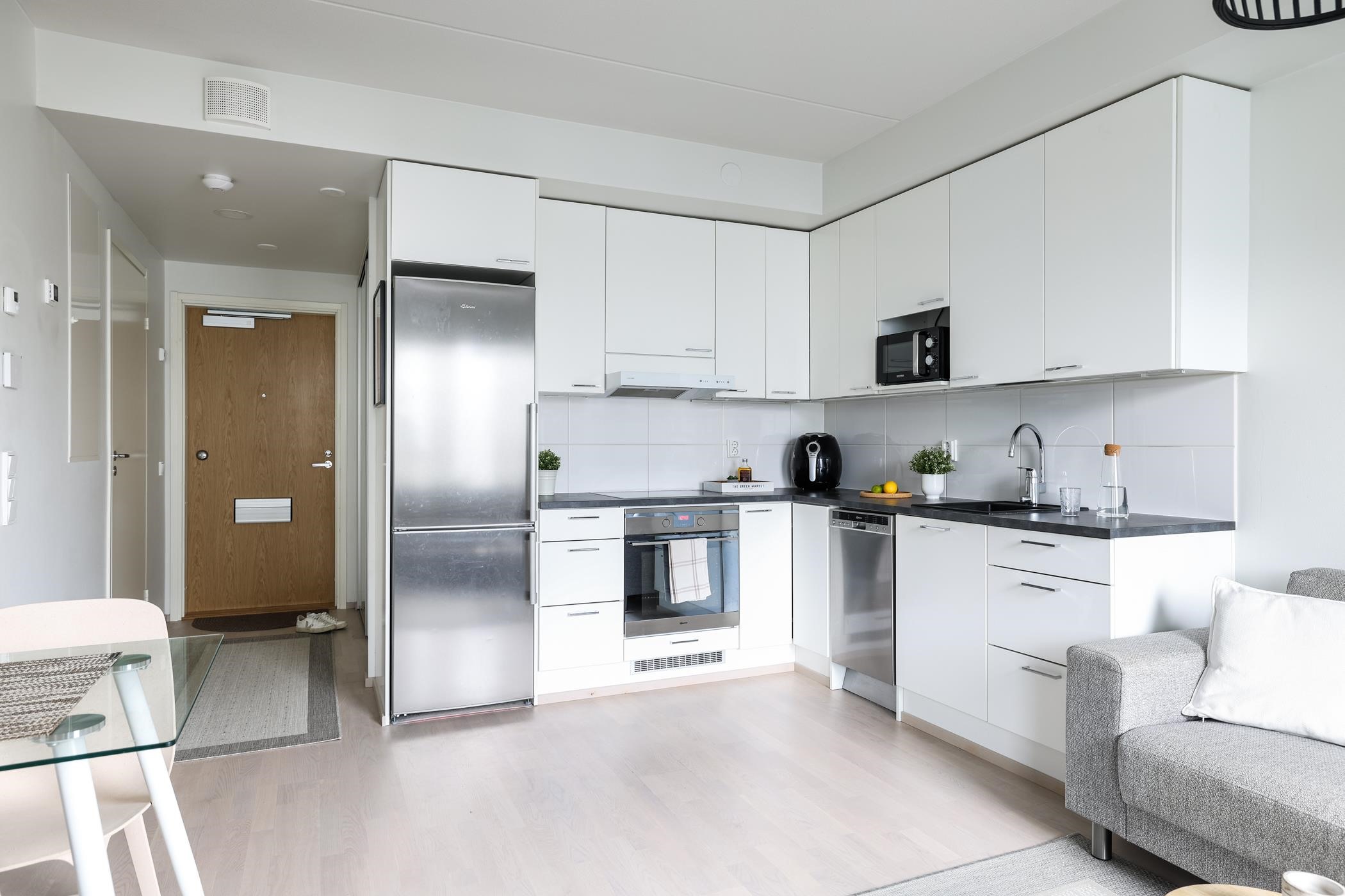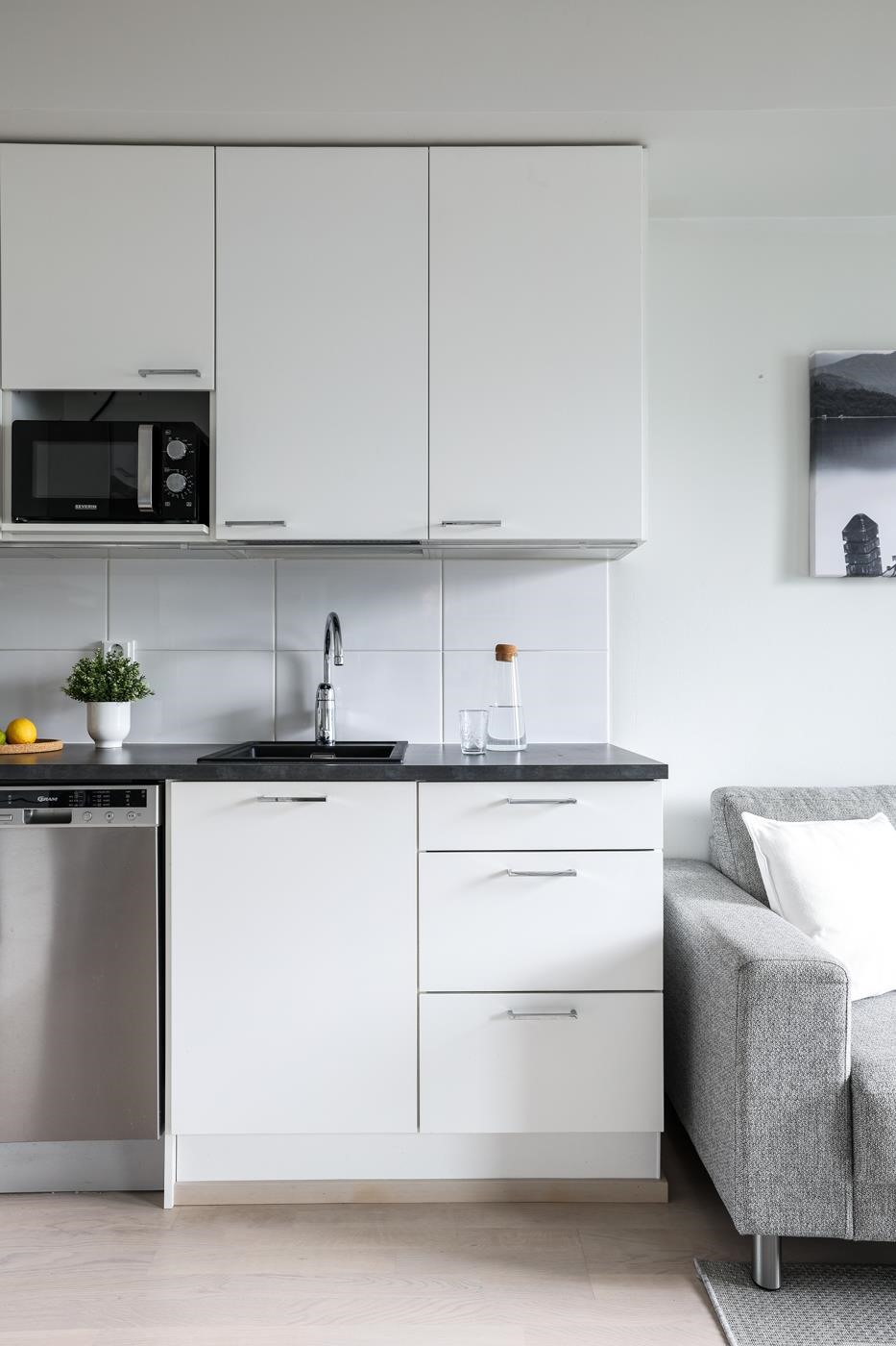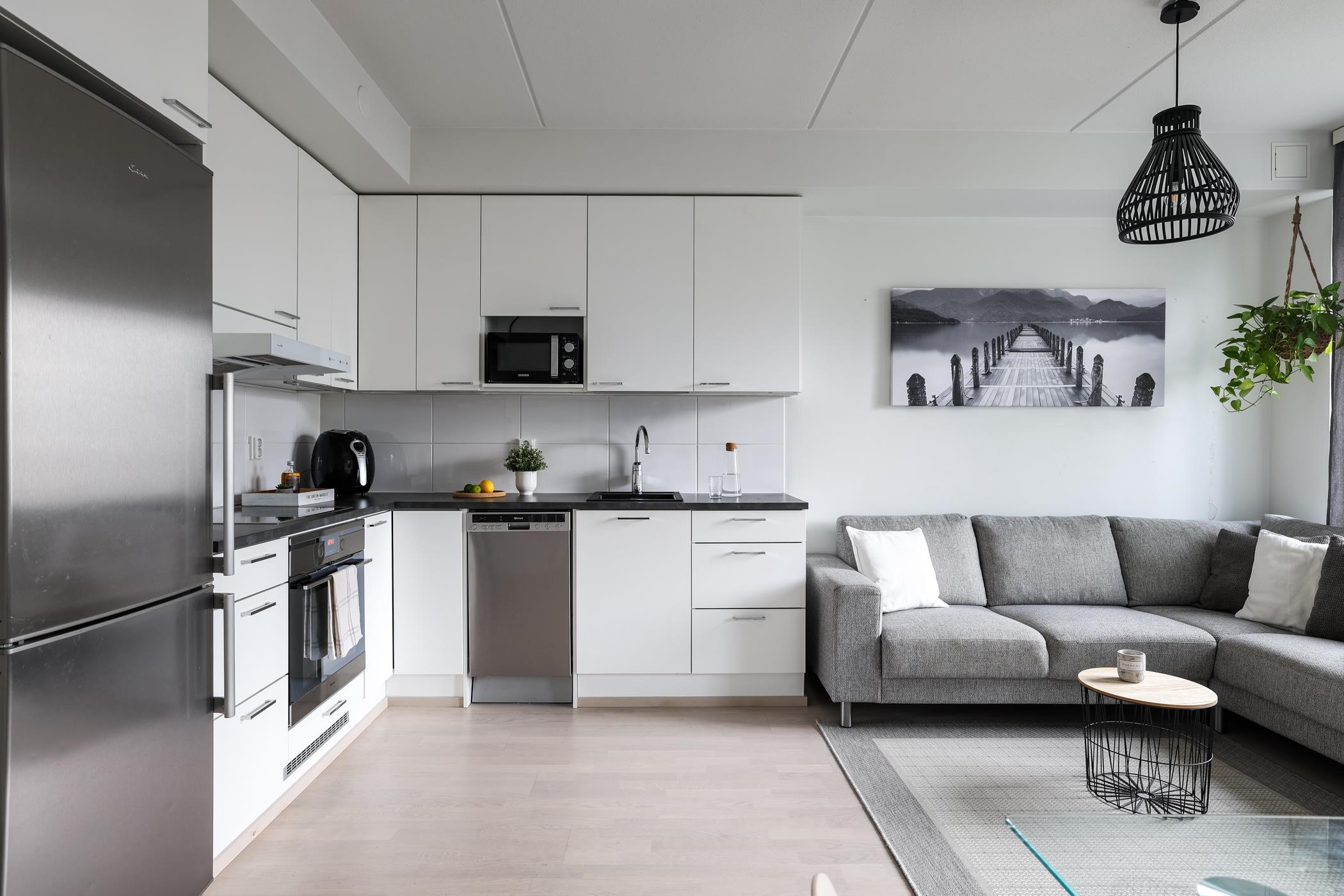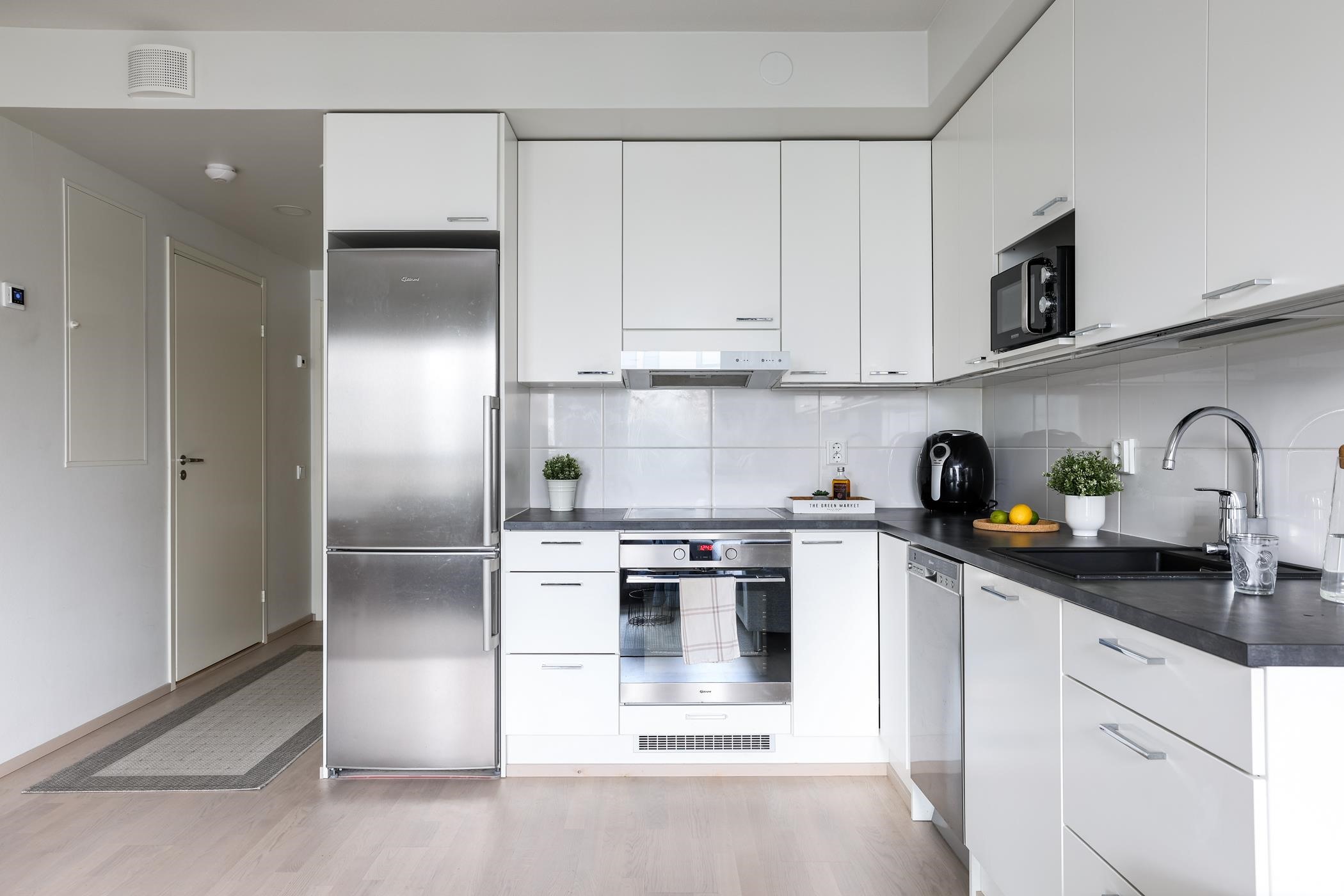 - Keittiössä on musta komposiittiallas, jääkaappipakastin, erillisuuni, induktioliesitaso (uusittu 2023), liesituuletin, joka on yhteydessä ilmanvaihtoon (CASA smart-system), astianpesukone, kaapistot sekä kiinteät valaisimet.