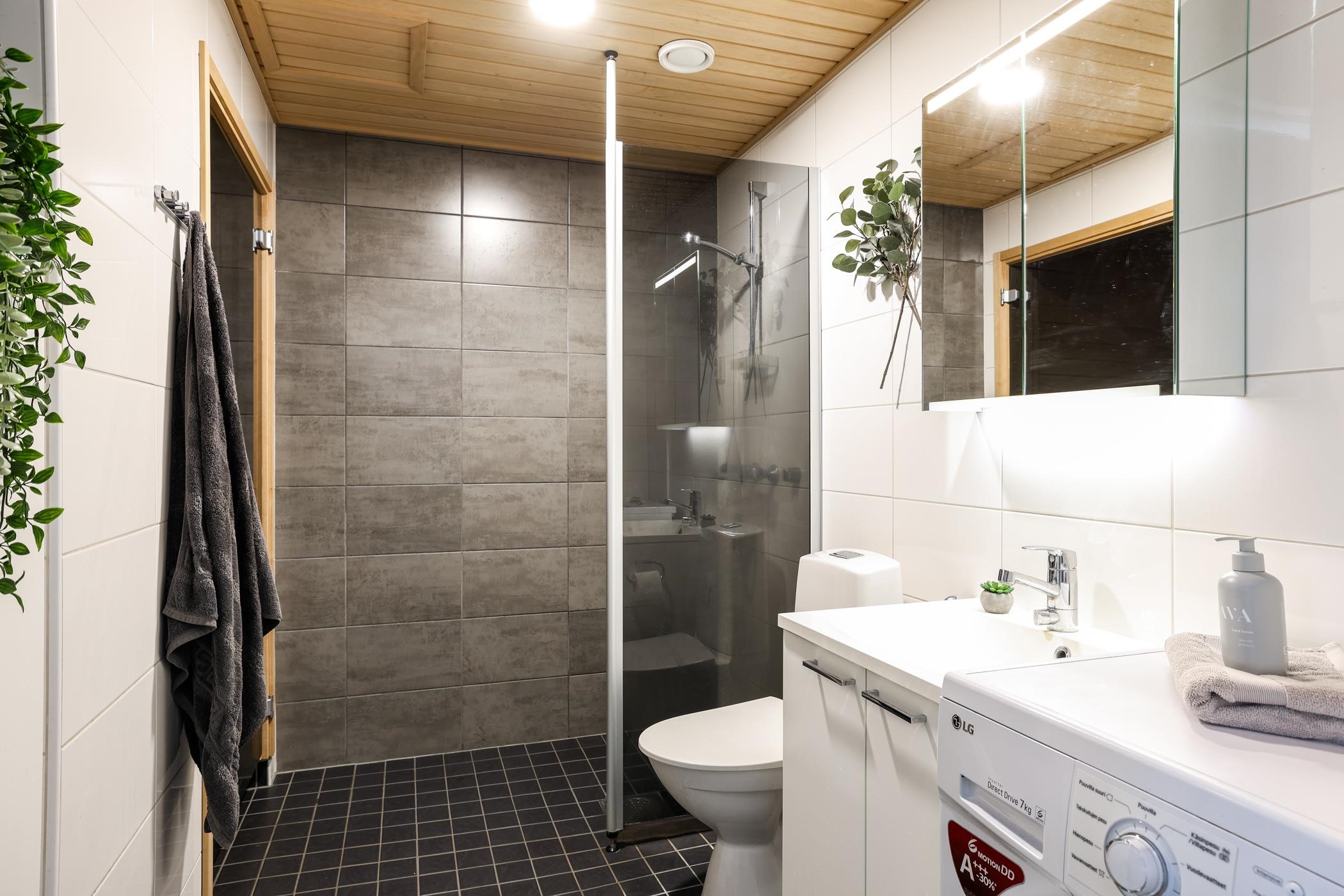 - Saunassa on sähkökiuas, kylpyhuoneessa on suihku ja suihkuseinä sekä peili- ja allaskaappi. Pyykkikaappi, pesukoneliitäntä, lattialämmitys ja kiinteät valaisimet.