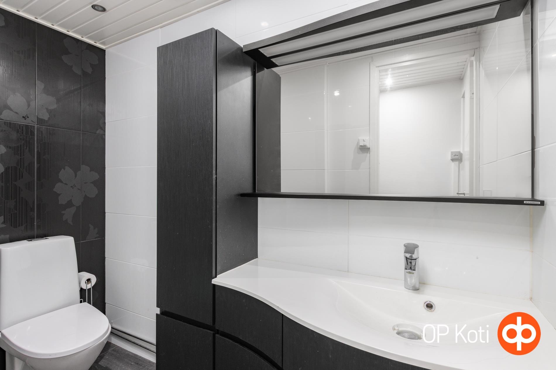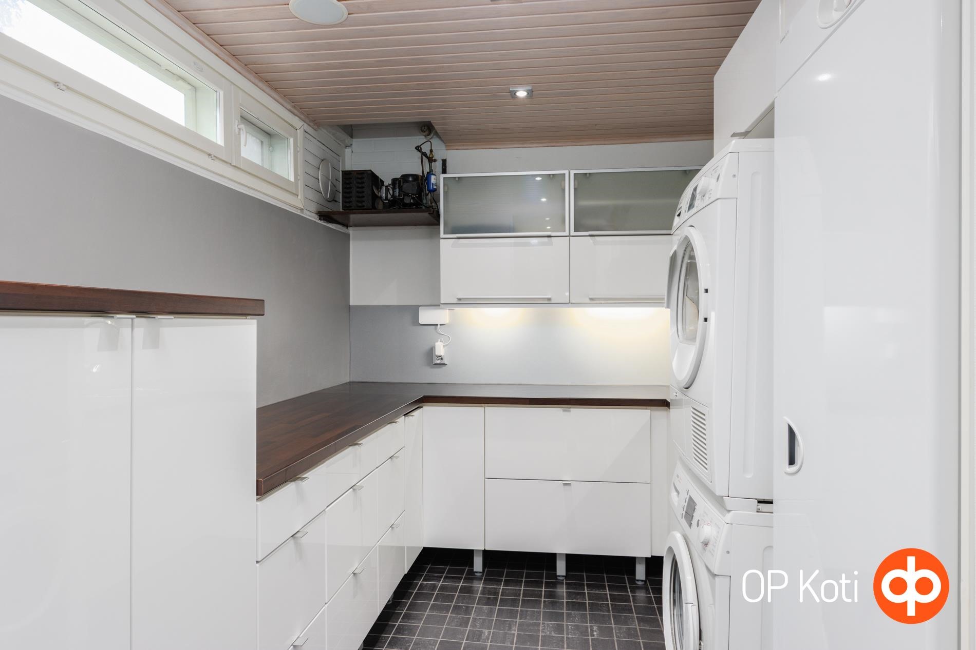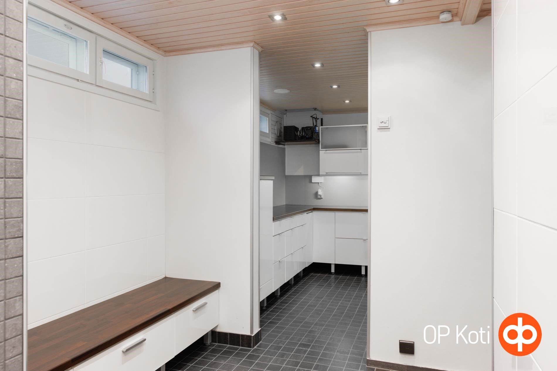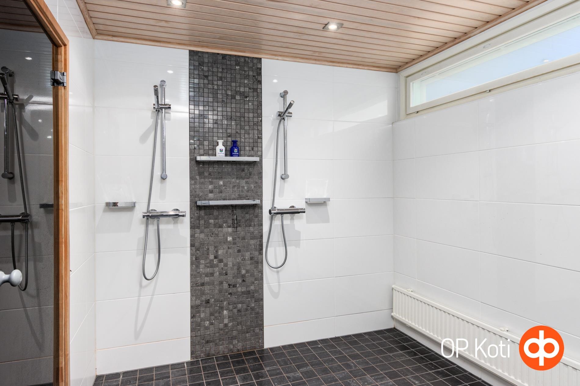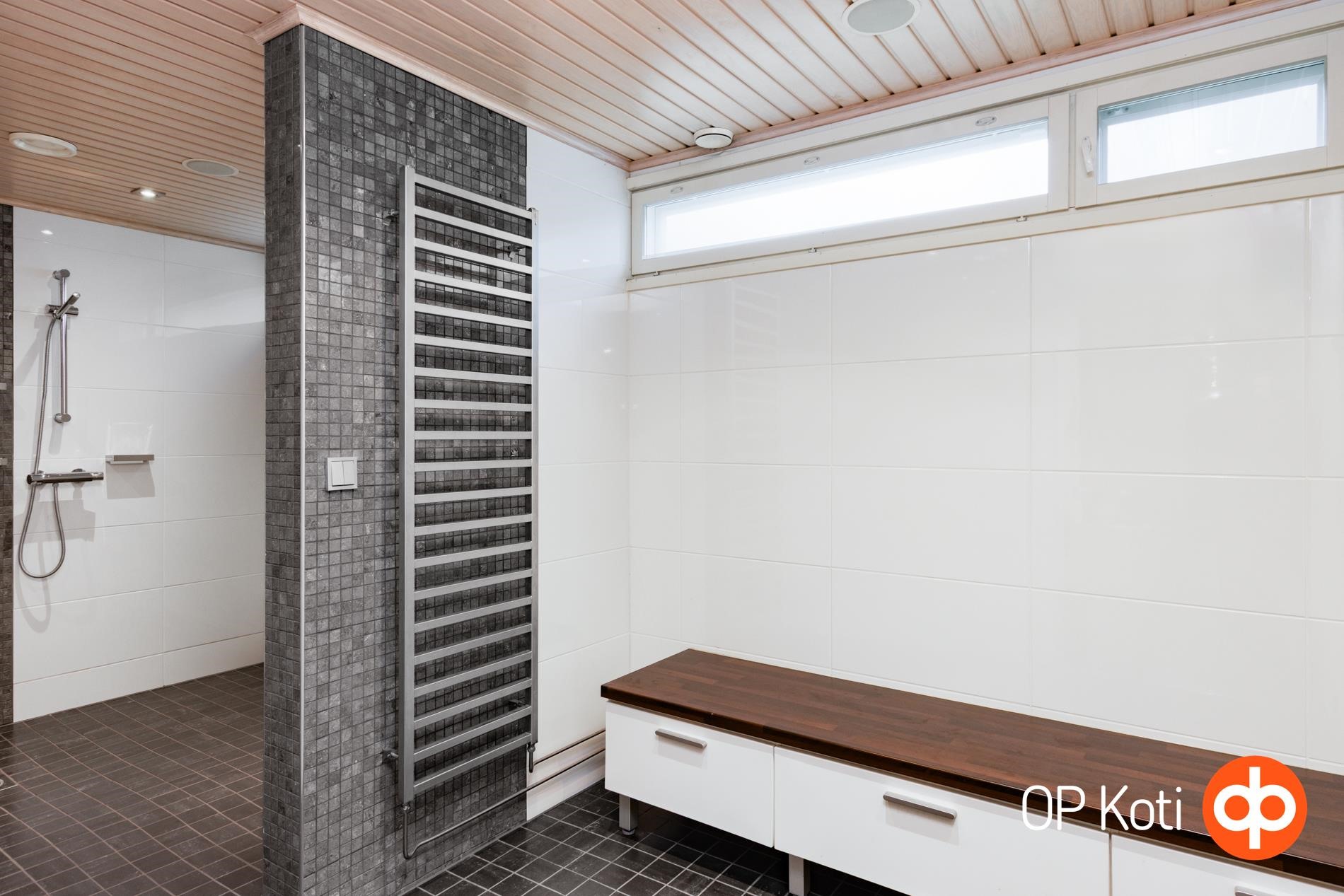 - Sauna, sähkökiuas heti valmis kiuas, kylpyhuone yksi kh alakerrassa, kaksi yläkerrassa, erillinen wc, suihku, peilikaappi, kaapit, allaskaappi, pesukoneliitäntä, lattialämmitys Alakerrassa lattialämmitys sähkö, kiinteät valaisimet. Uima-allas . Kuivauspatteri kylpyhuoneessa. Kaiuttimet ja imuri allasosastolla.