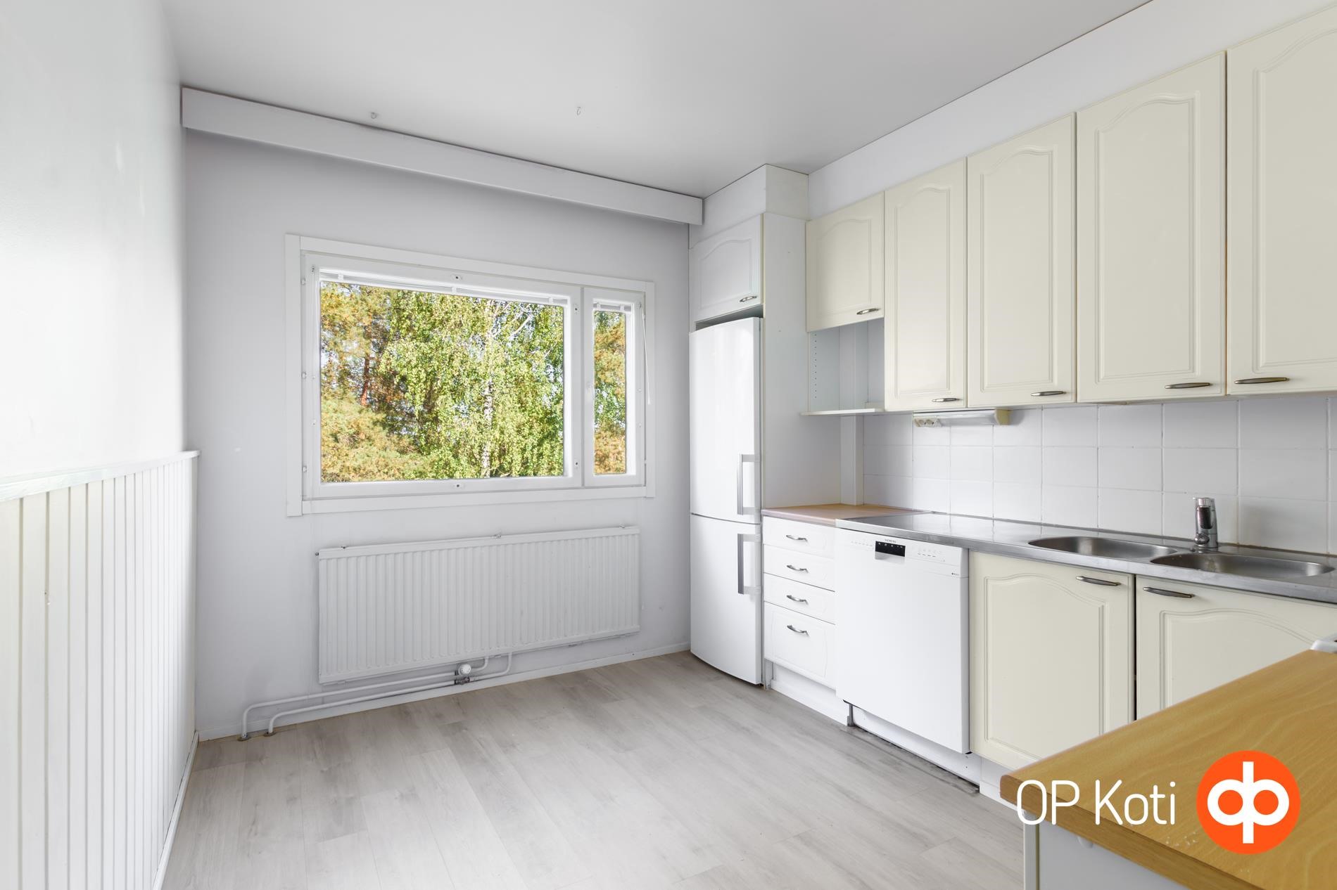 - Jääkaappipakastin, keraaminen liesi, liesituuletin, astianpesukone, kaapistot, kiinteät valaisimet.