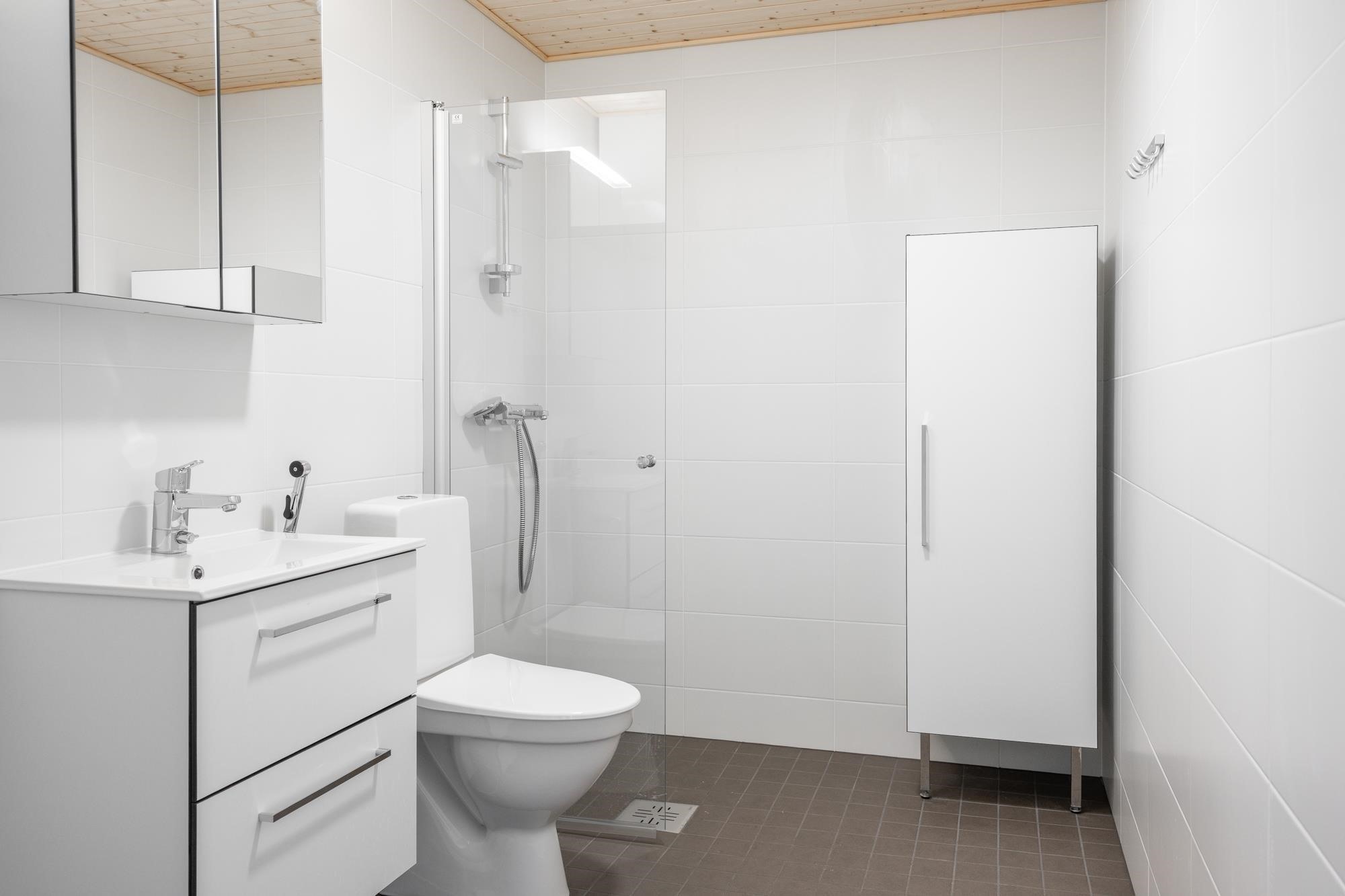 - Kylpyhuone, suihkuseinä, peilikaappi, allaskaappi, kiinteät valaisimet.