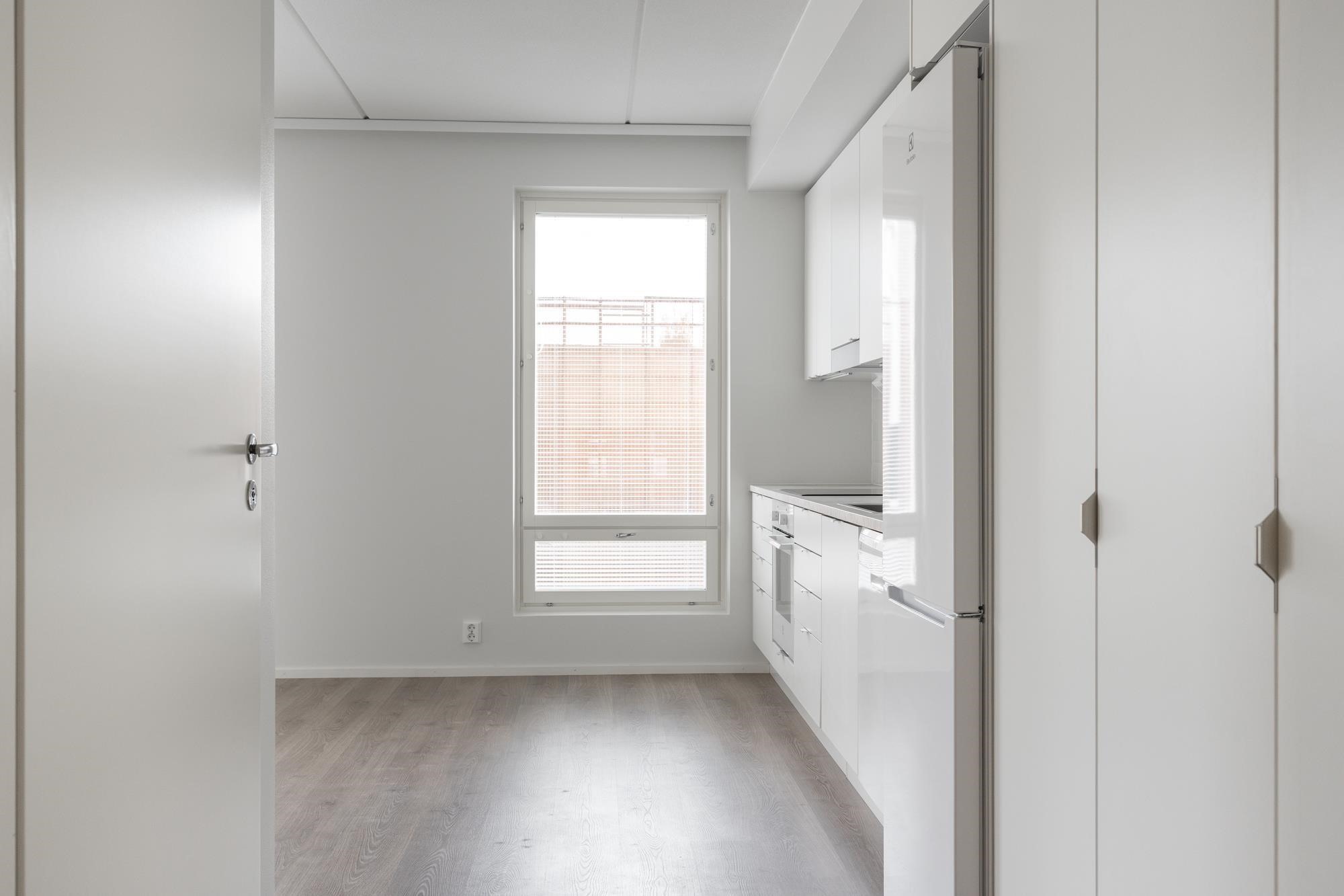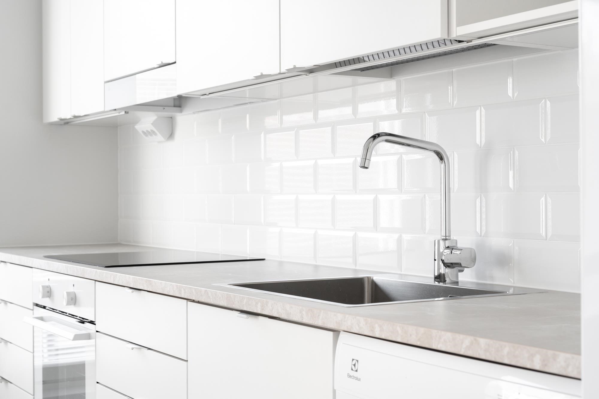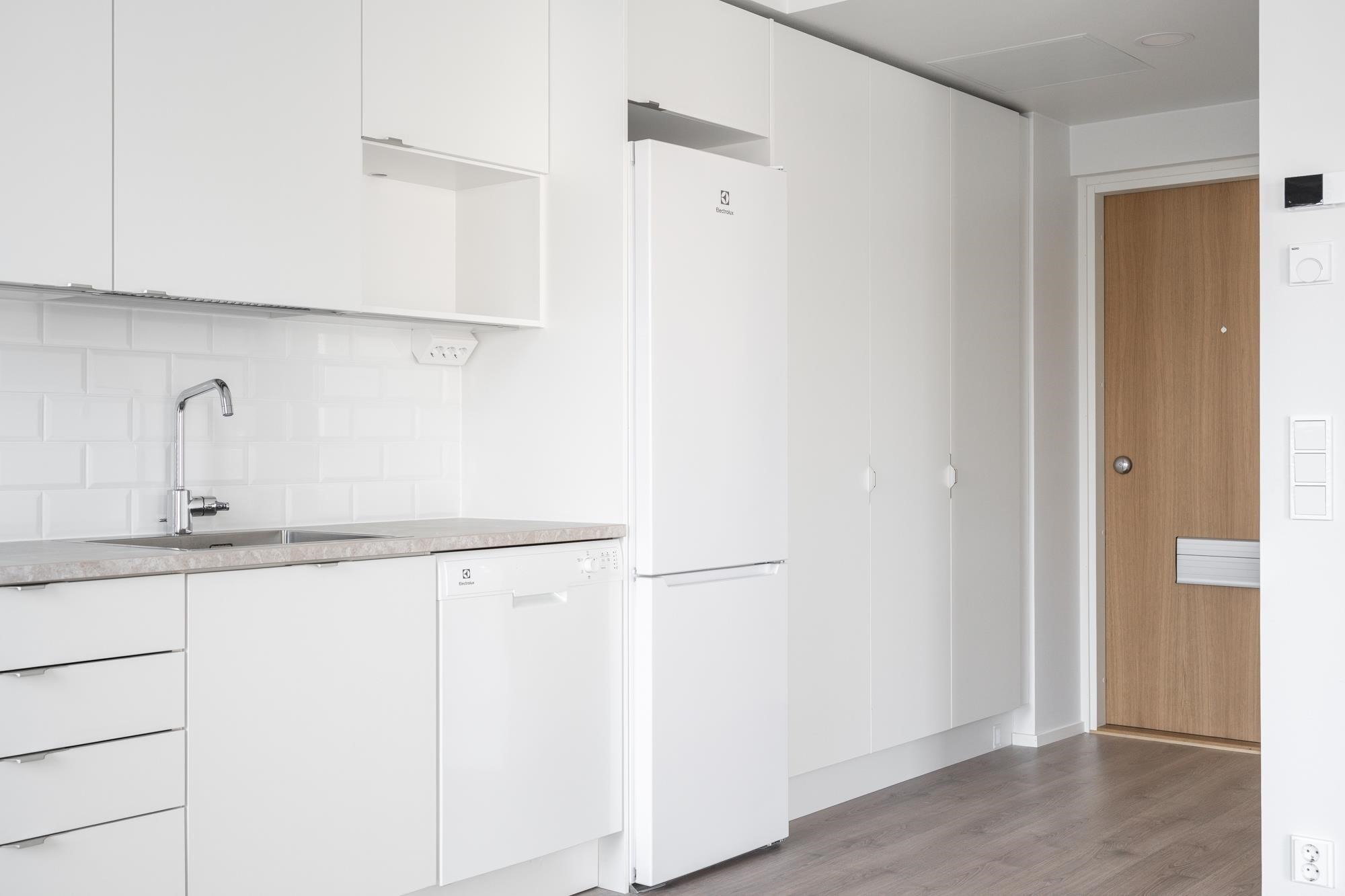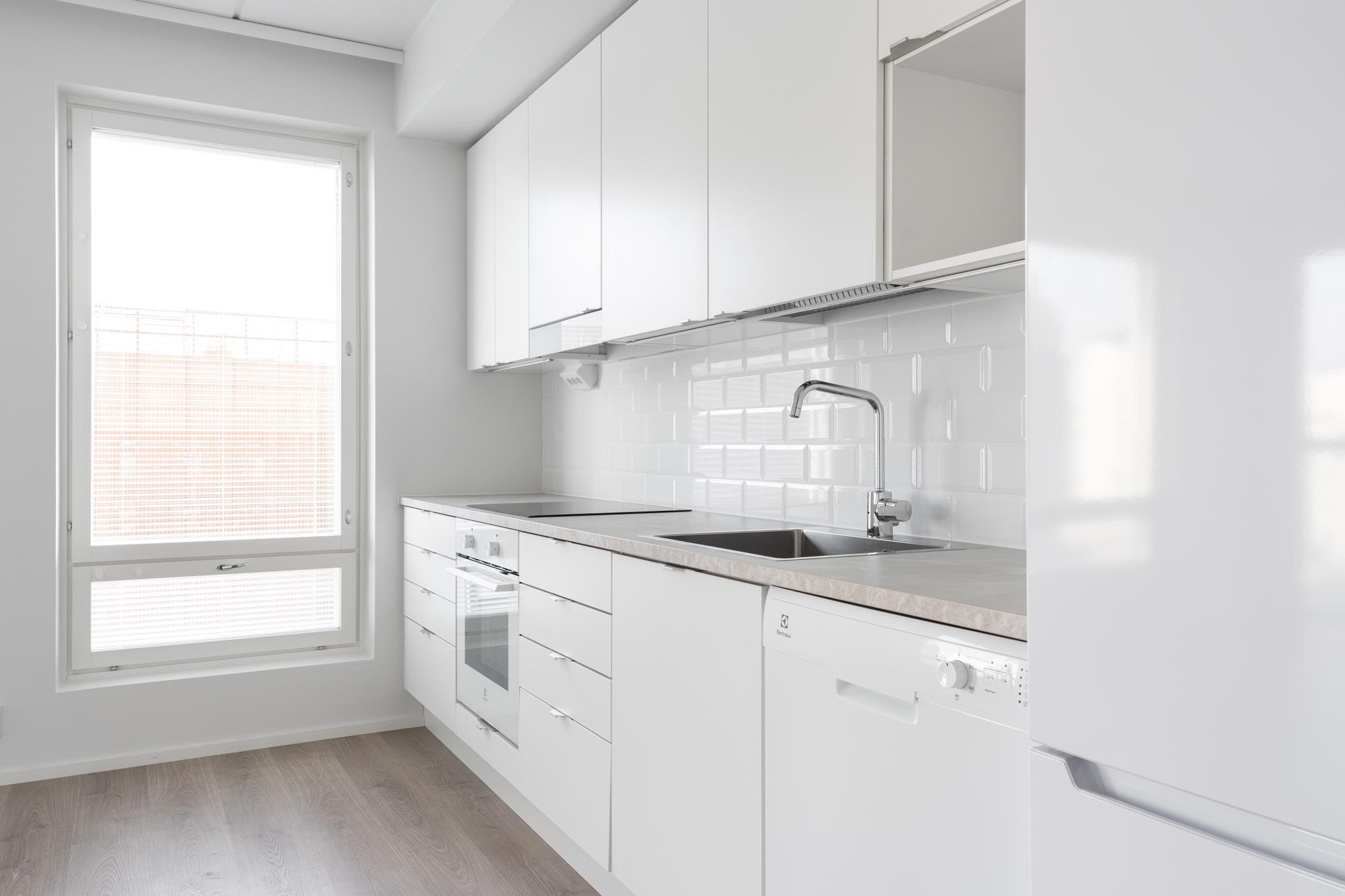 - Jääkaappipakastin, erillisuuni, liesitaso, astianpesukone, kaapistot, kiinteät valaisimet.