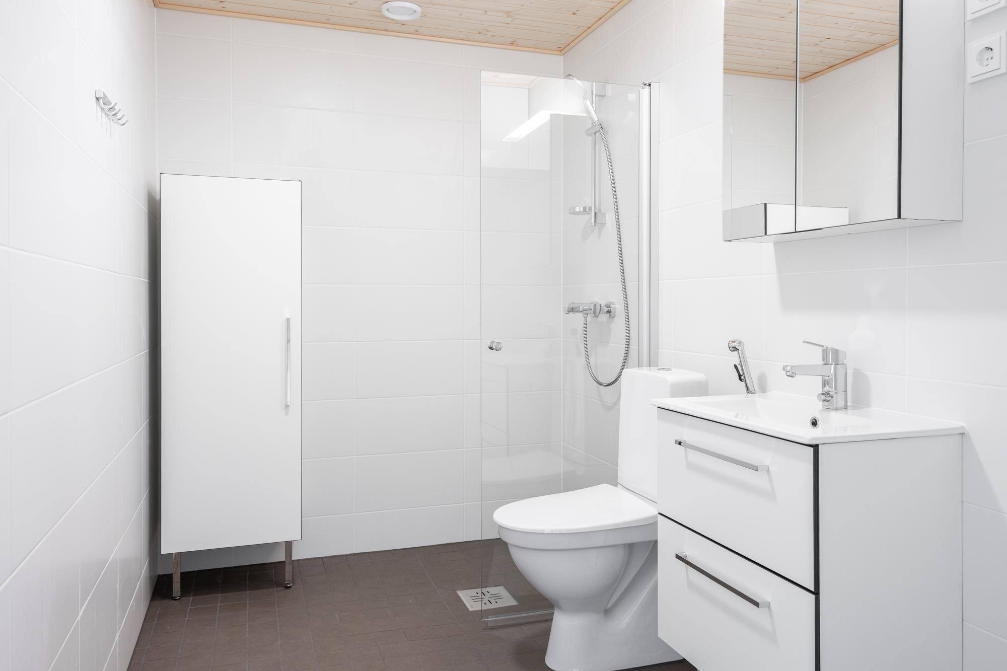 - Kylpyhuone, suihkuseinä, peilikaappi, allaskaappi, kiinteät valaisimet.