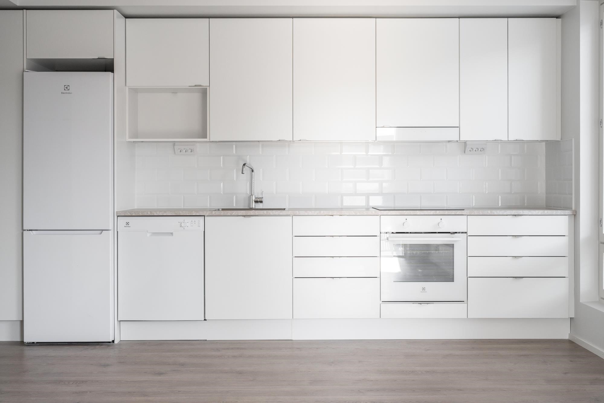 - Jääkaappipakastin, erillisuuni, liesitaso, astianpesukone, kaapistot, kiinteät valaisimet.
