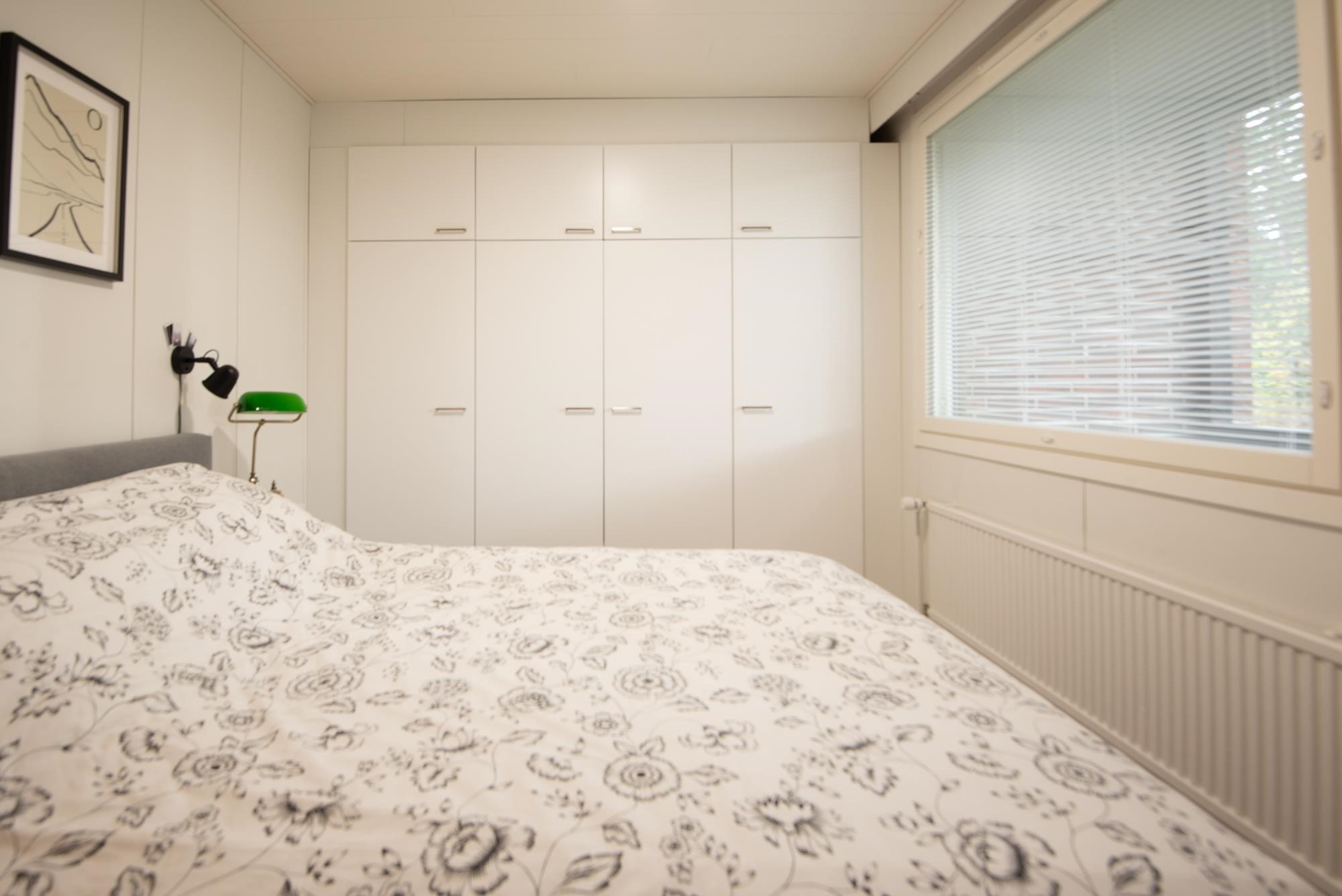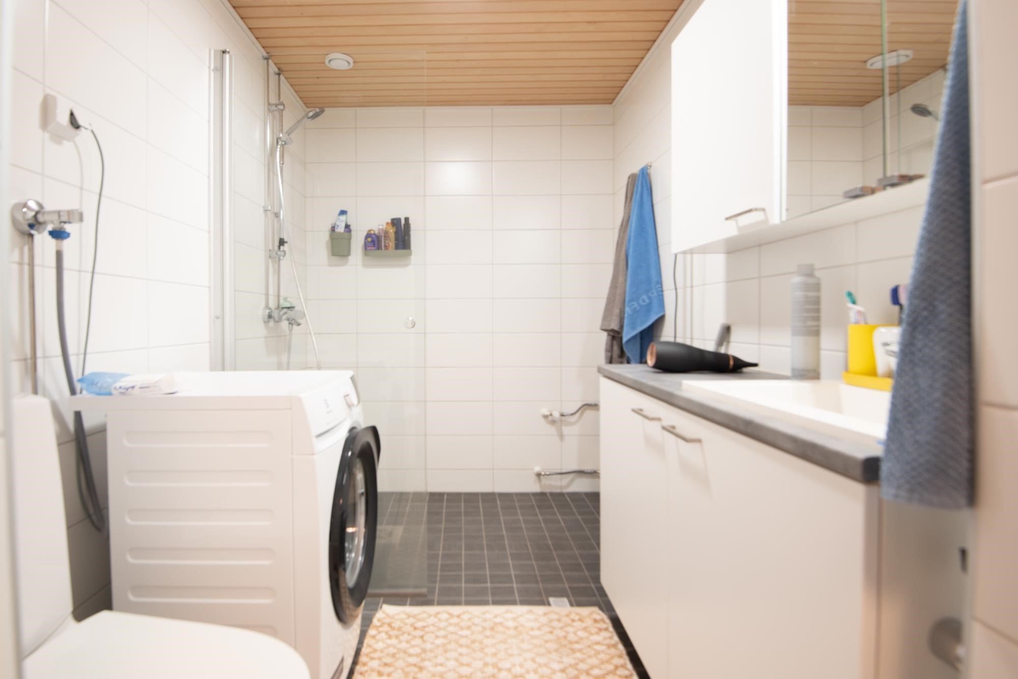 - Kylpyhuone, suihkuseinä, kaapit, allaskaappi, pesukoneliitäntä, lattialämmitys.