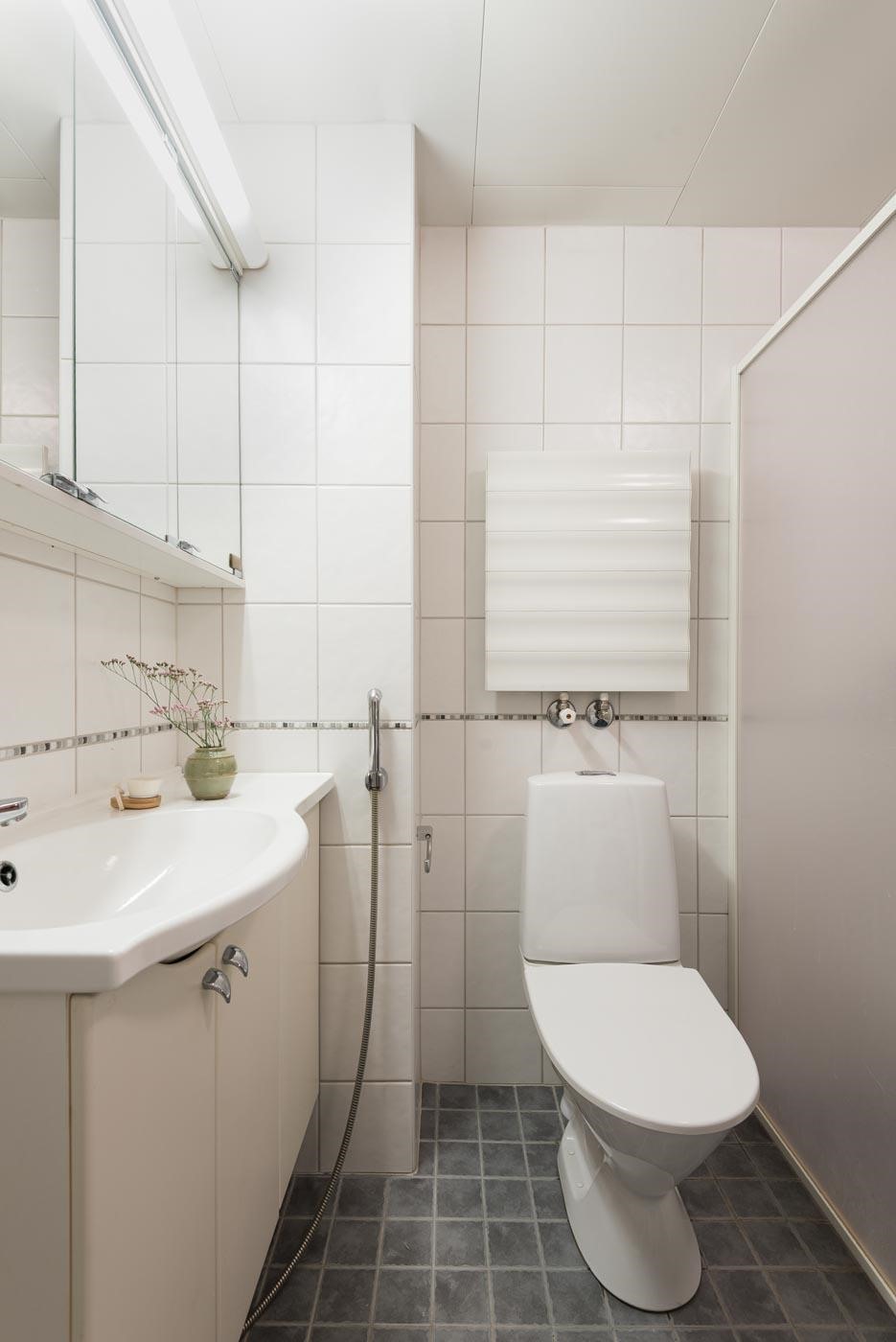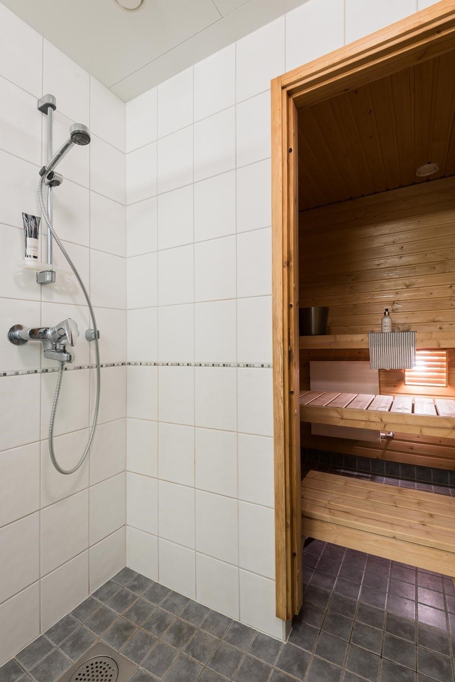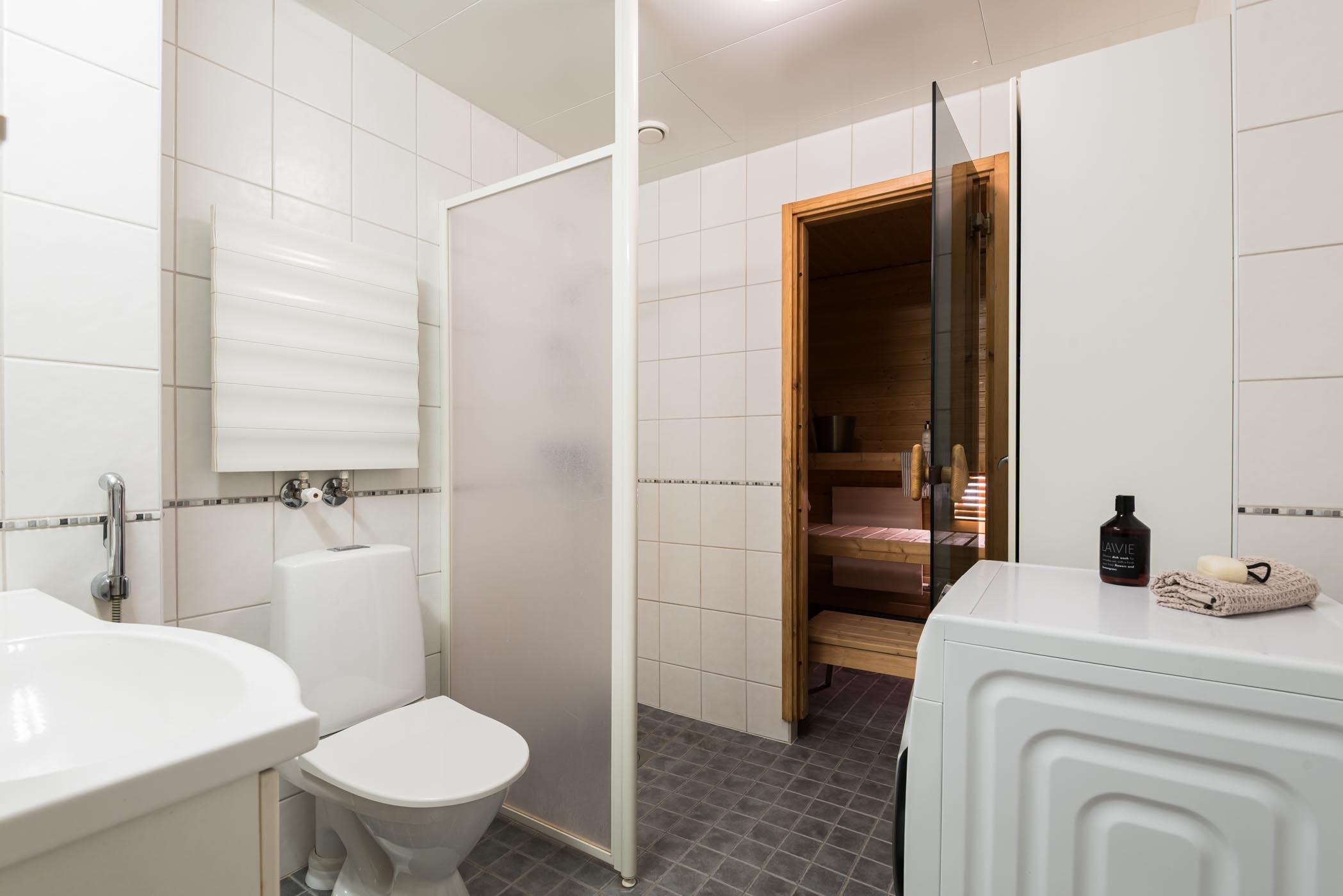 - Saunassa on sähkökiuas. Kylpyhuoneessa on suihku, suihkuseinä, peilikaappi, pyykkikaappi/ liinavaatekaappi, allaskaappi, pesukoneliitäntä, lattialämmitys (mukavuuslämmitys), kiinteät valaisimet, lämmin pyyhekuivain ja bidee.