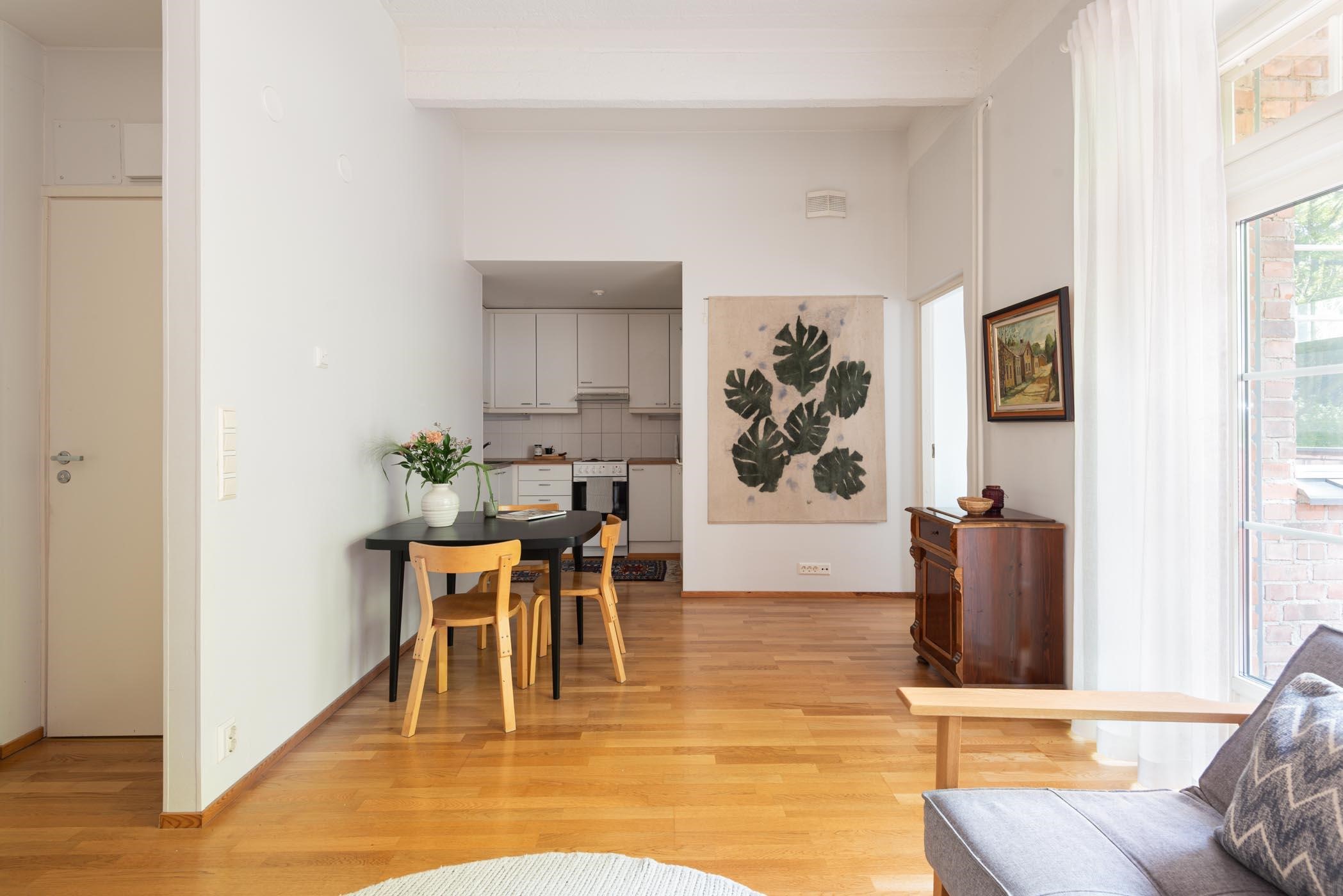- Avokeittiön varusteisiin kuuluvat jääkaappipakastin, lattialiesi ja liesituuletin.