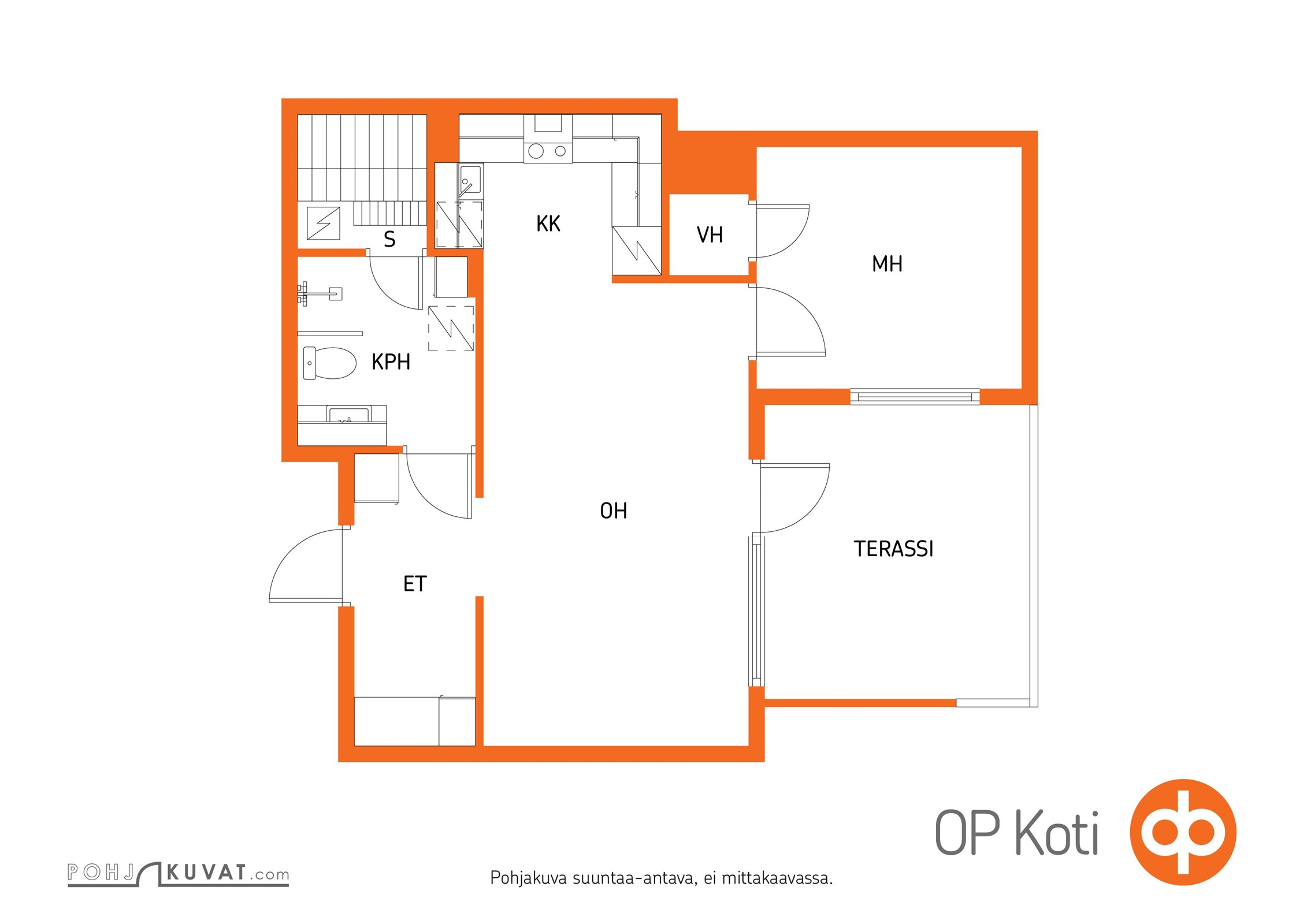 - 2h, avokeittiö, kph/wc, s, terassipiha