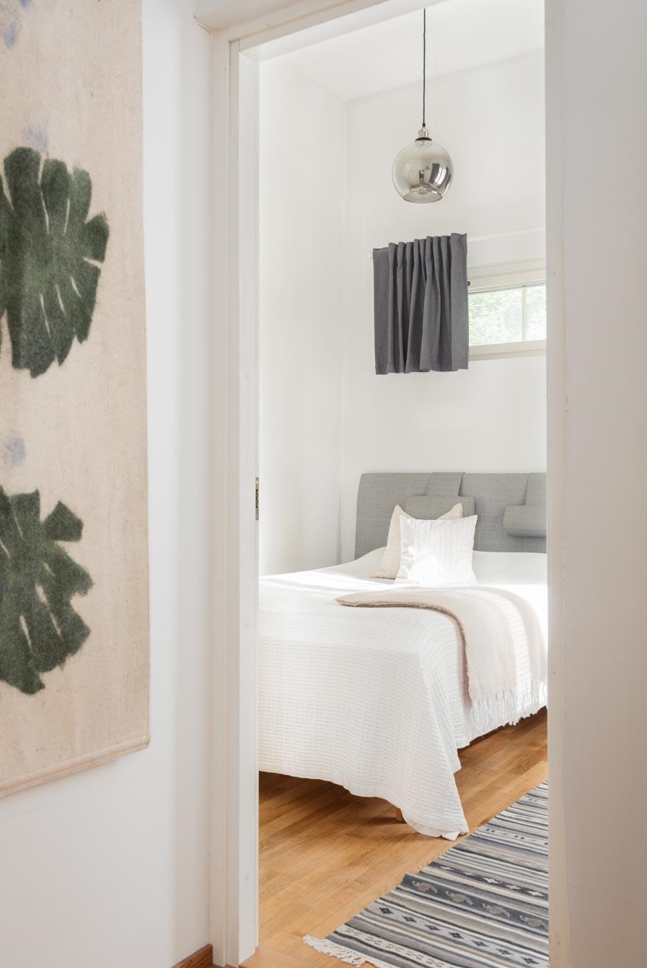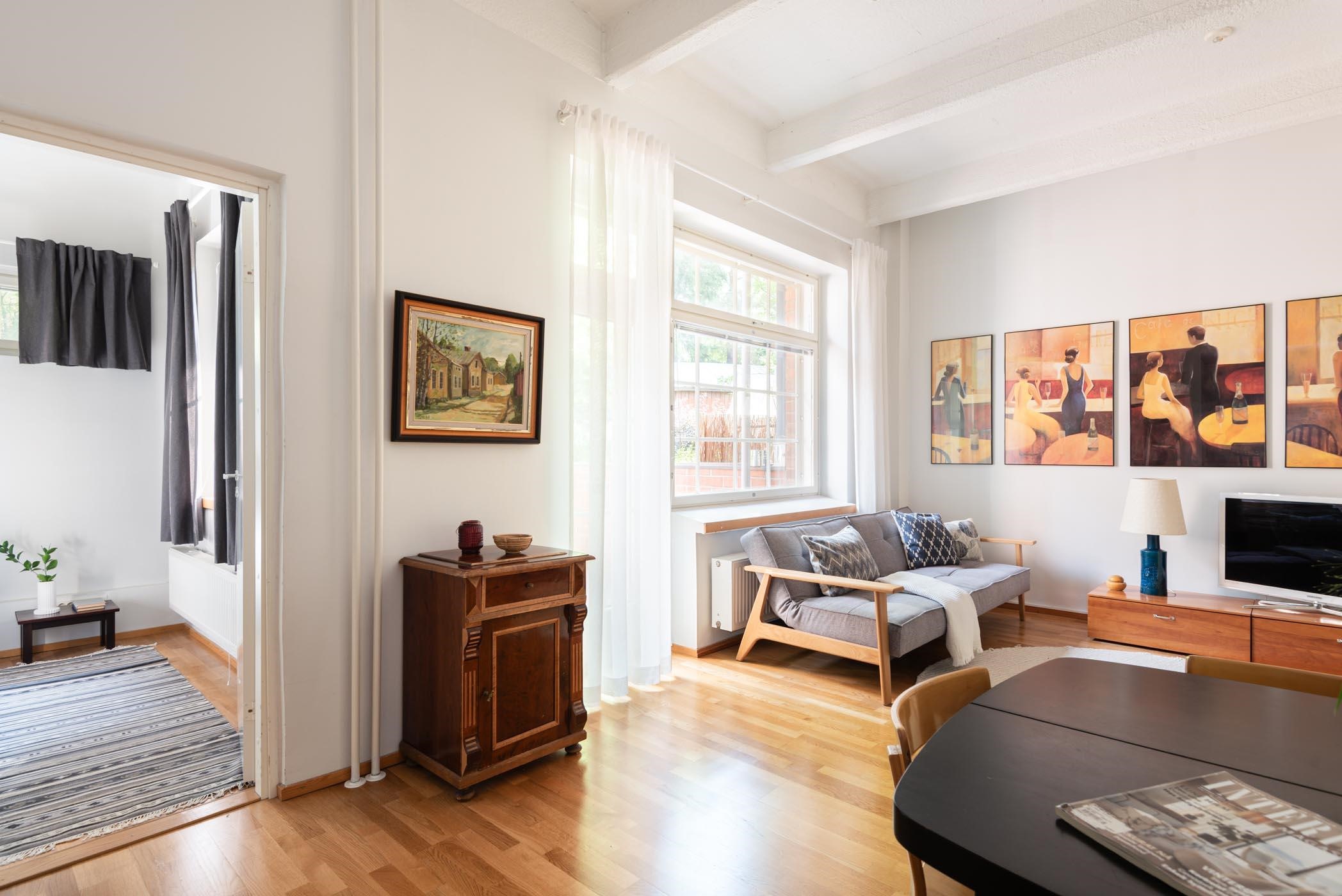 Keittiön, olohuoneen, eteisen ja makuuhuoneen lattiat ovat parkettia ja seinät maalatut. Kylpyhuone on laatoitettu.