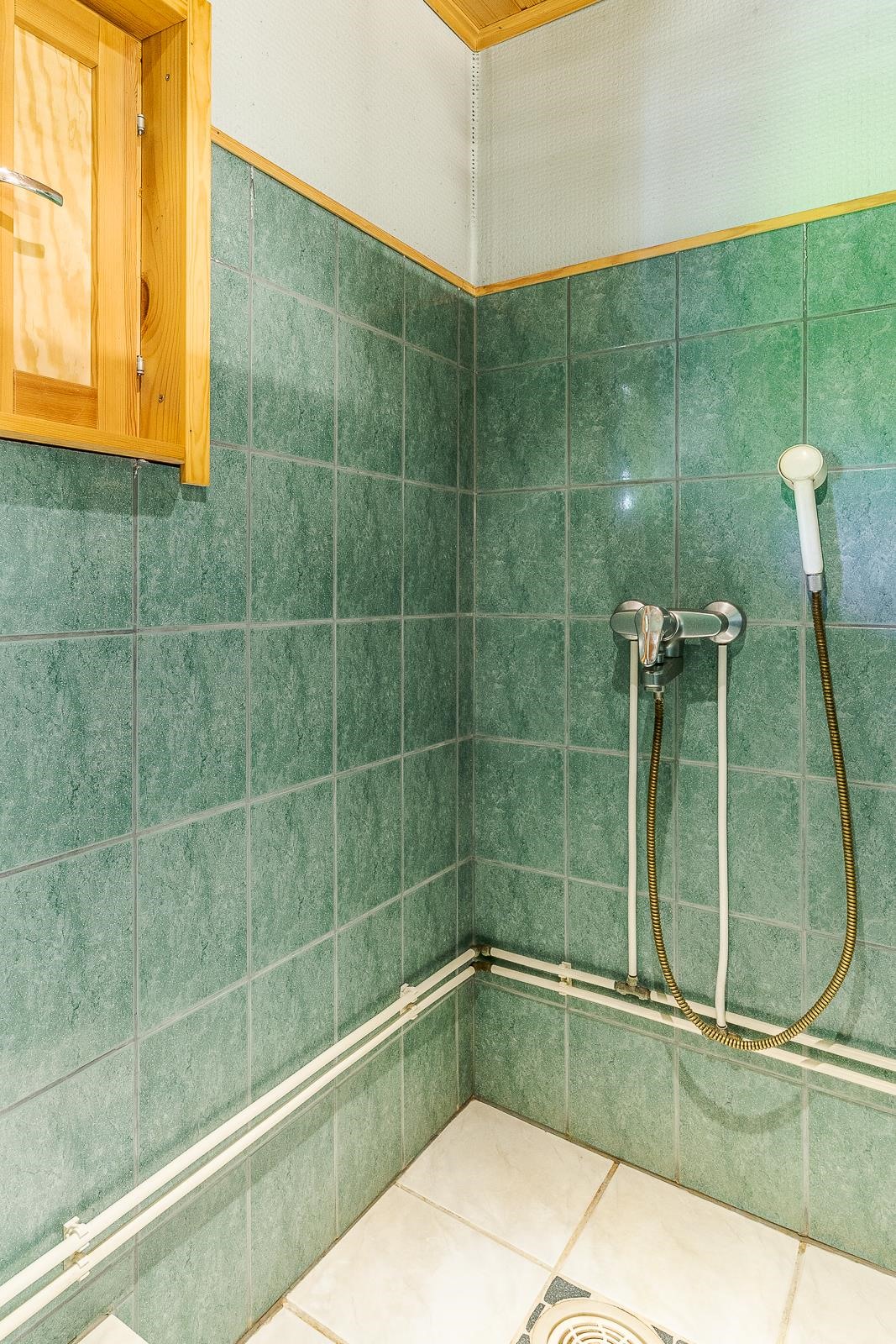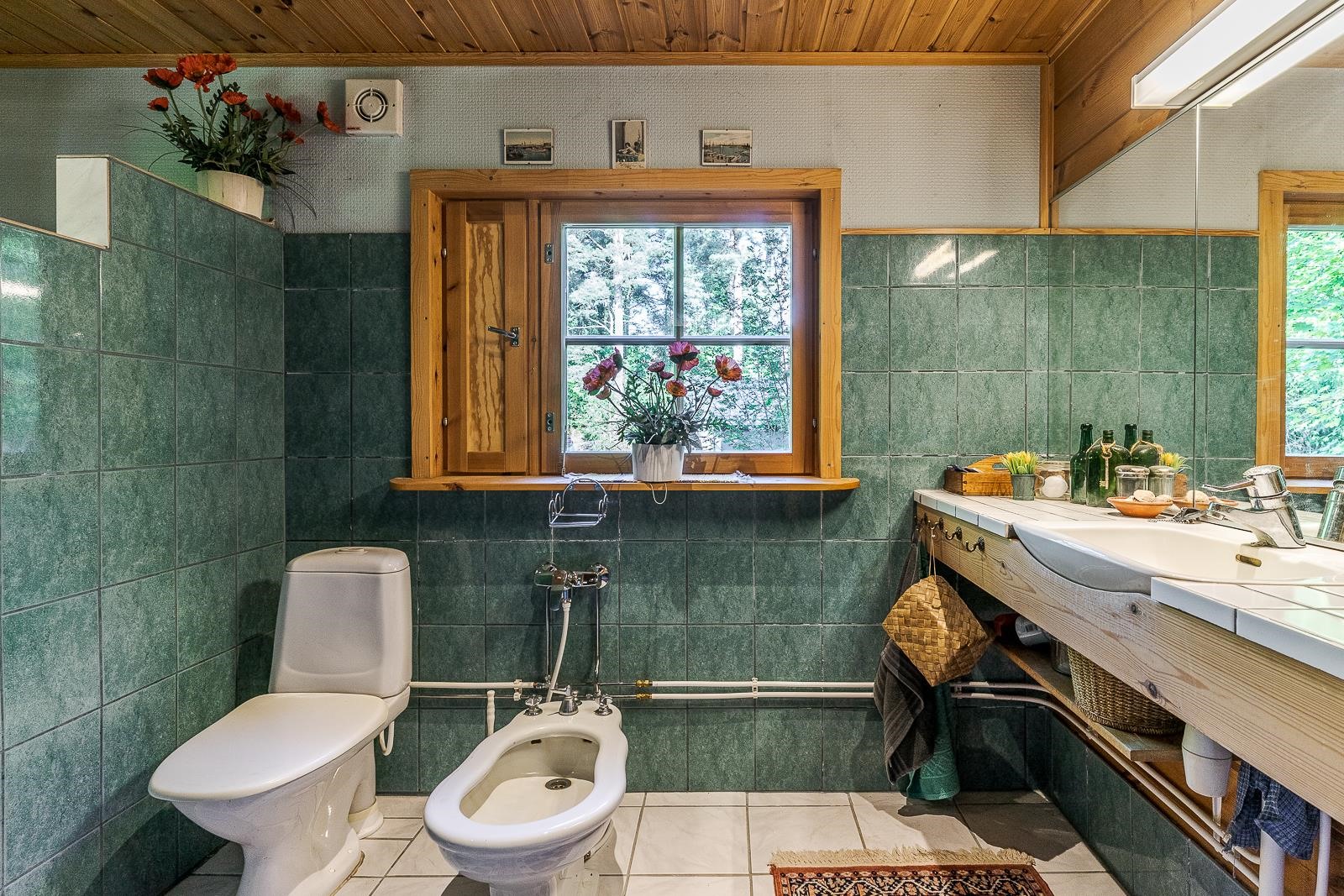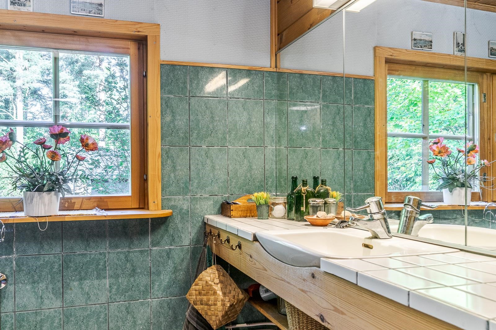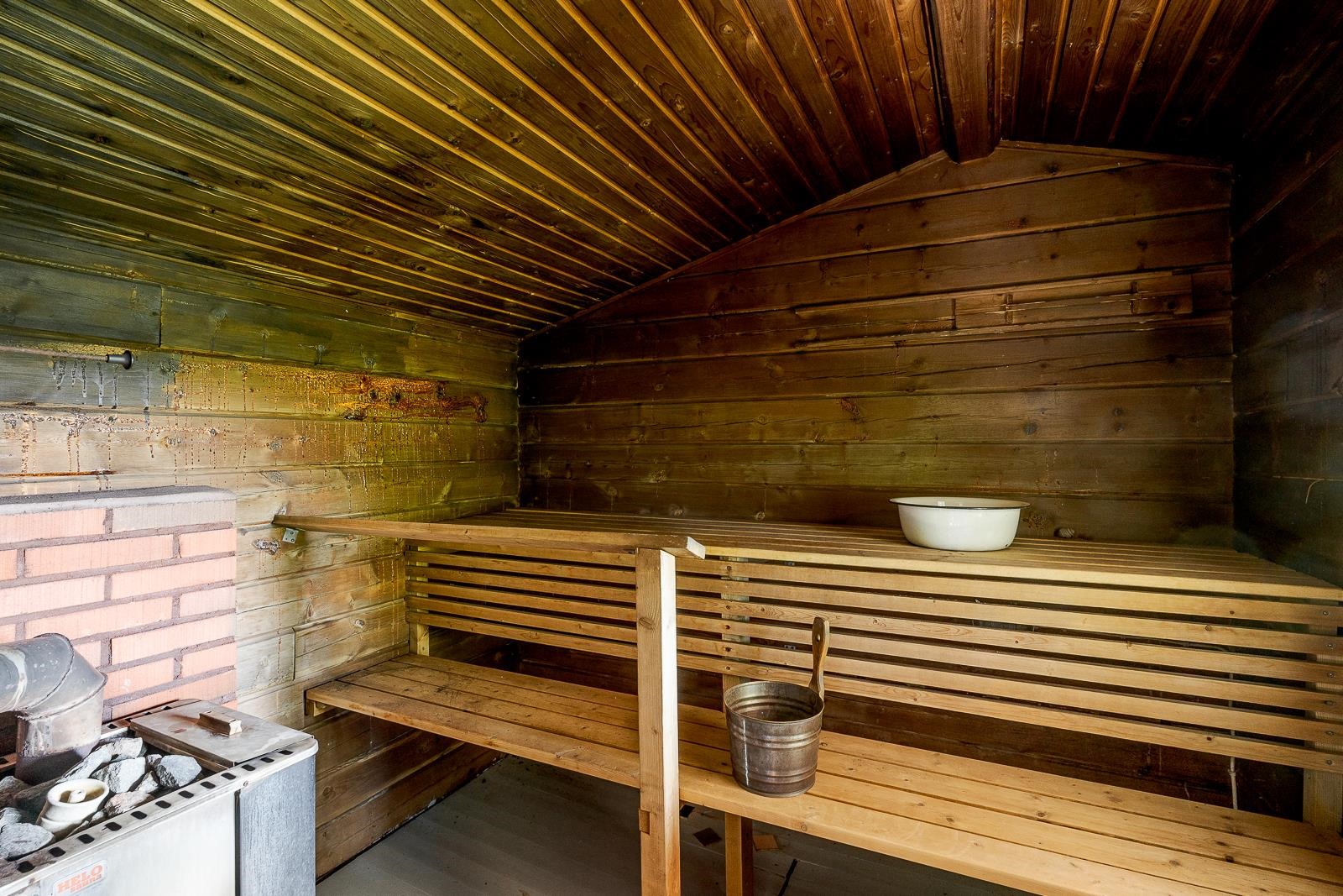 - Sauna: erillinen rakennus puukiukaalla. Kylpyhuone, erillinen wc, suihku, suihkuseinä, peilit, peilikaappi, kaapit, lattialämmitys, kiinteät valaisimet.