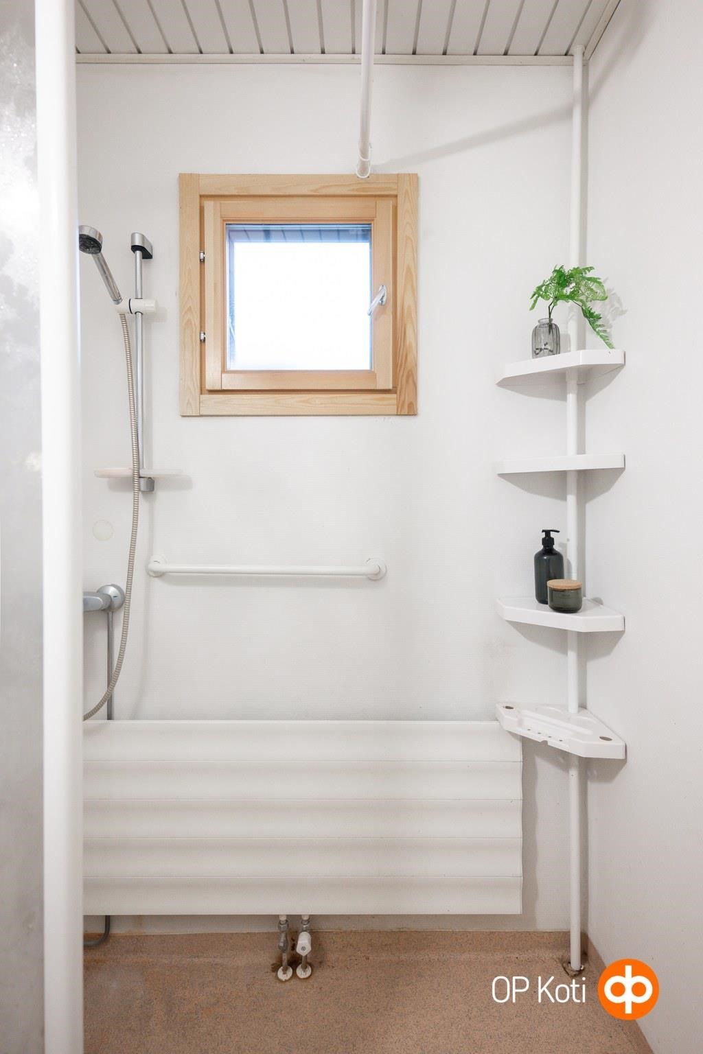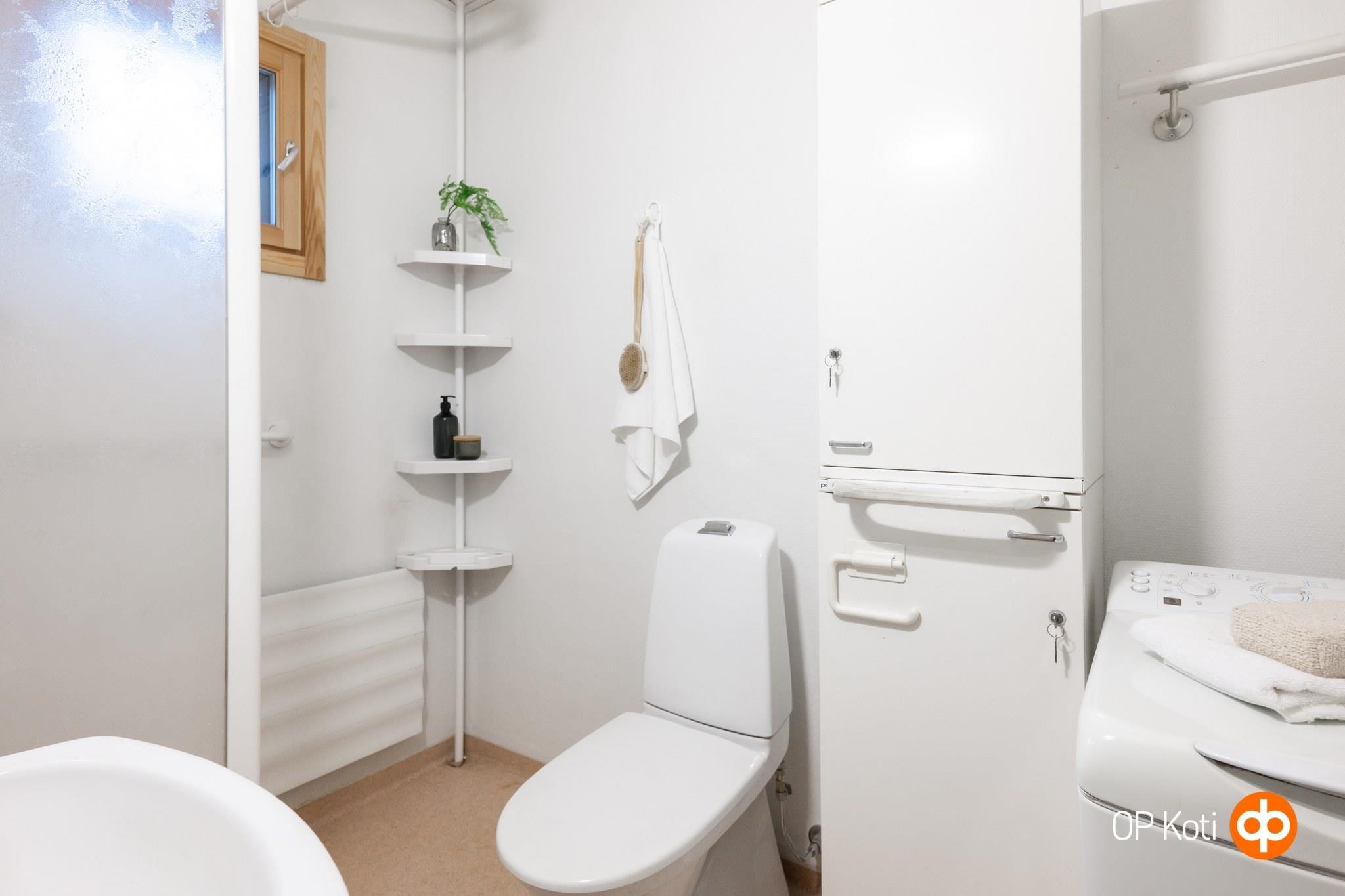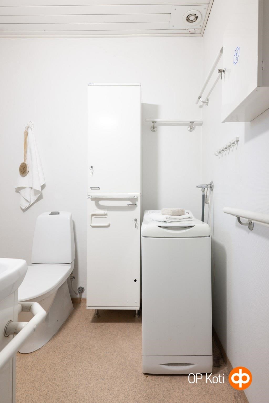 - Kylpyhuone, suihku, suihkuseinä, peilikaappi, allaskaappi, pesukoneliitäntä, kiinteät valaisimet. Kylpyhuone on alkuperäisessä kunnossa.