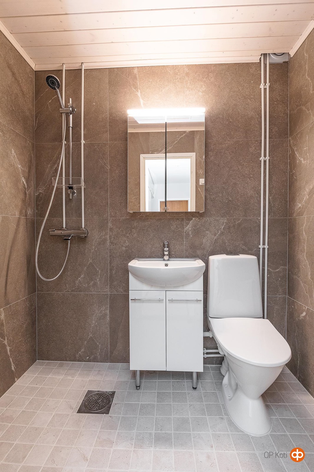 - Kylpyhuone, suihku, peilikaappi, allaskaappi, pesukoneliitäntä, kiinteät valaisimet, pide-suihku allaskaapissa. Kauttaaltaan 2025 remontoitu upea ja käyttämätön kylpyhuone, jossa ajan vaatimukset täyttävä vesieriste. Hyvällä maulla valitut laatoitukset ja kiintokalusteet. Hieno toiminnallinen kokonaisuus. Hyvä paikka pesukoneelle. Kylpyhuoneeseen asennettu määräykset täyttävä vikavirta pistorasia
