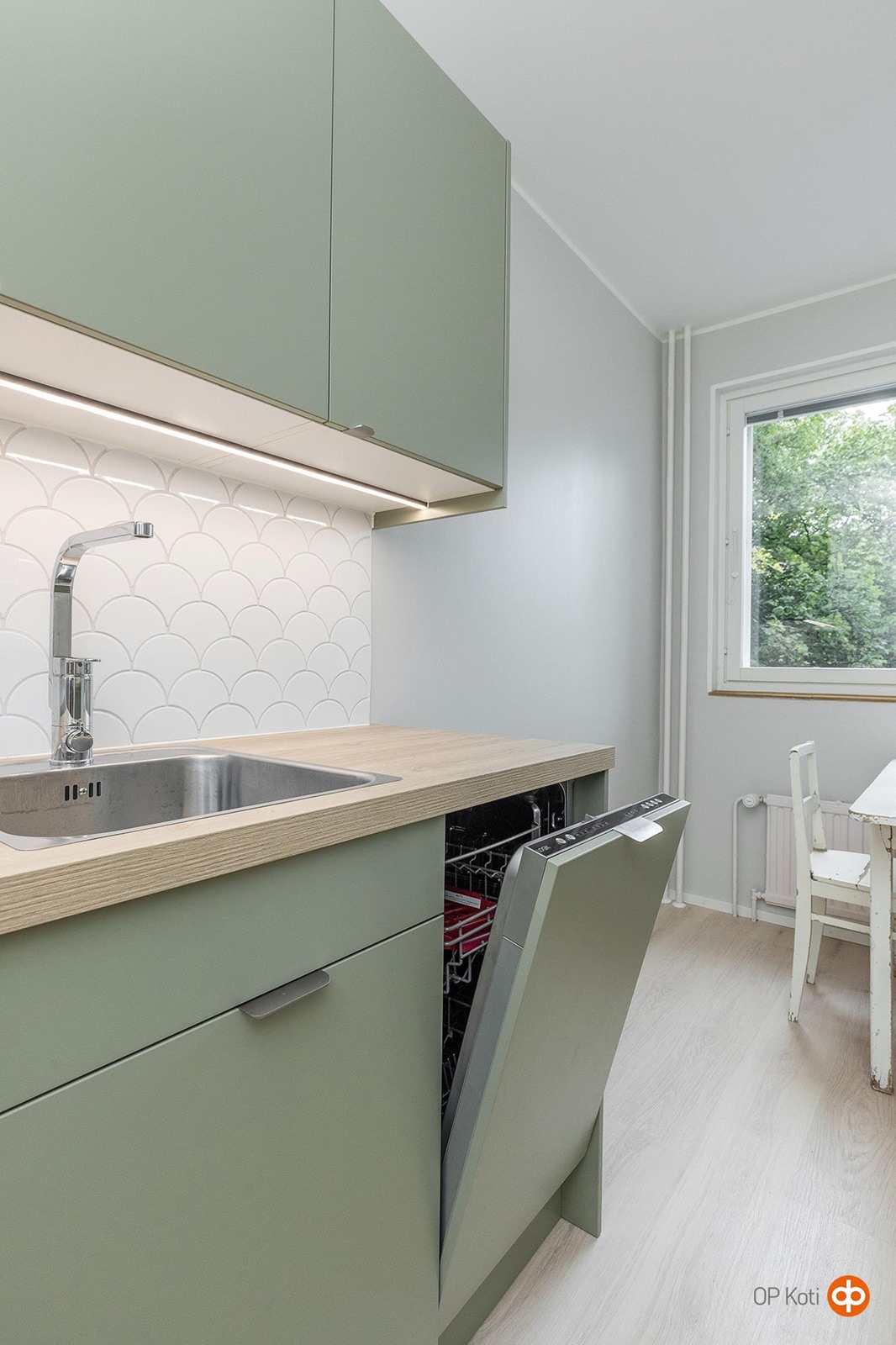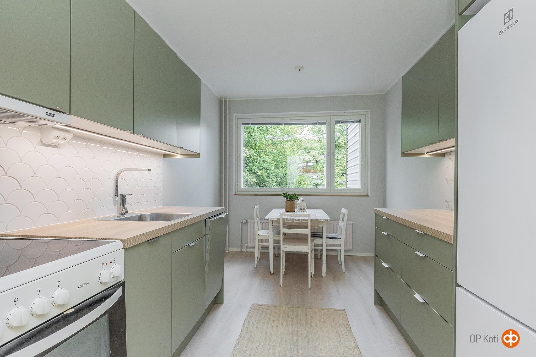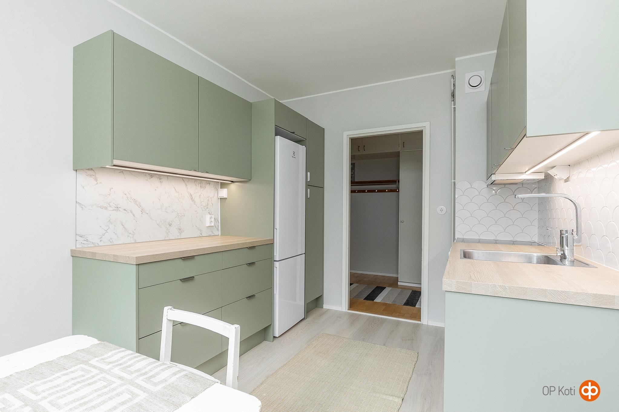 - Jääkaappipakastin uusittu 2022, sähköliesi, astianpesukone uusittu 2025, kaapistot, kiinteät valaisimet. Vuonna 2025 remontoitu tyylikäs keittiö. Kaapistojen rungot, ovet ja tasot sekä välilaatoitukset uusittu. Samalla vaihdettu lattiamateriaali laminaatiksi ja seinäpinnat maalattu. Kaapistot kahdella seinustalla. Keittiö omana tilanaan erillään olohuoneesta. Keittiössä hyvä tila arkiruokapöydälle ja reilunkokoisessa olohuoneessa paikka suuremmalle vierasruokapöydälle. Keittiön ikkunasta näkymä Salon torille johtavalle Torikadulle.
