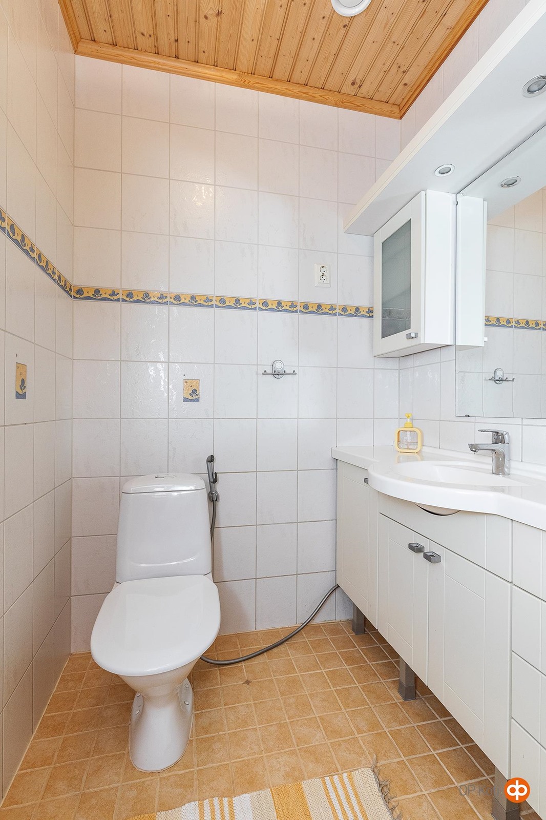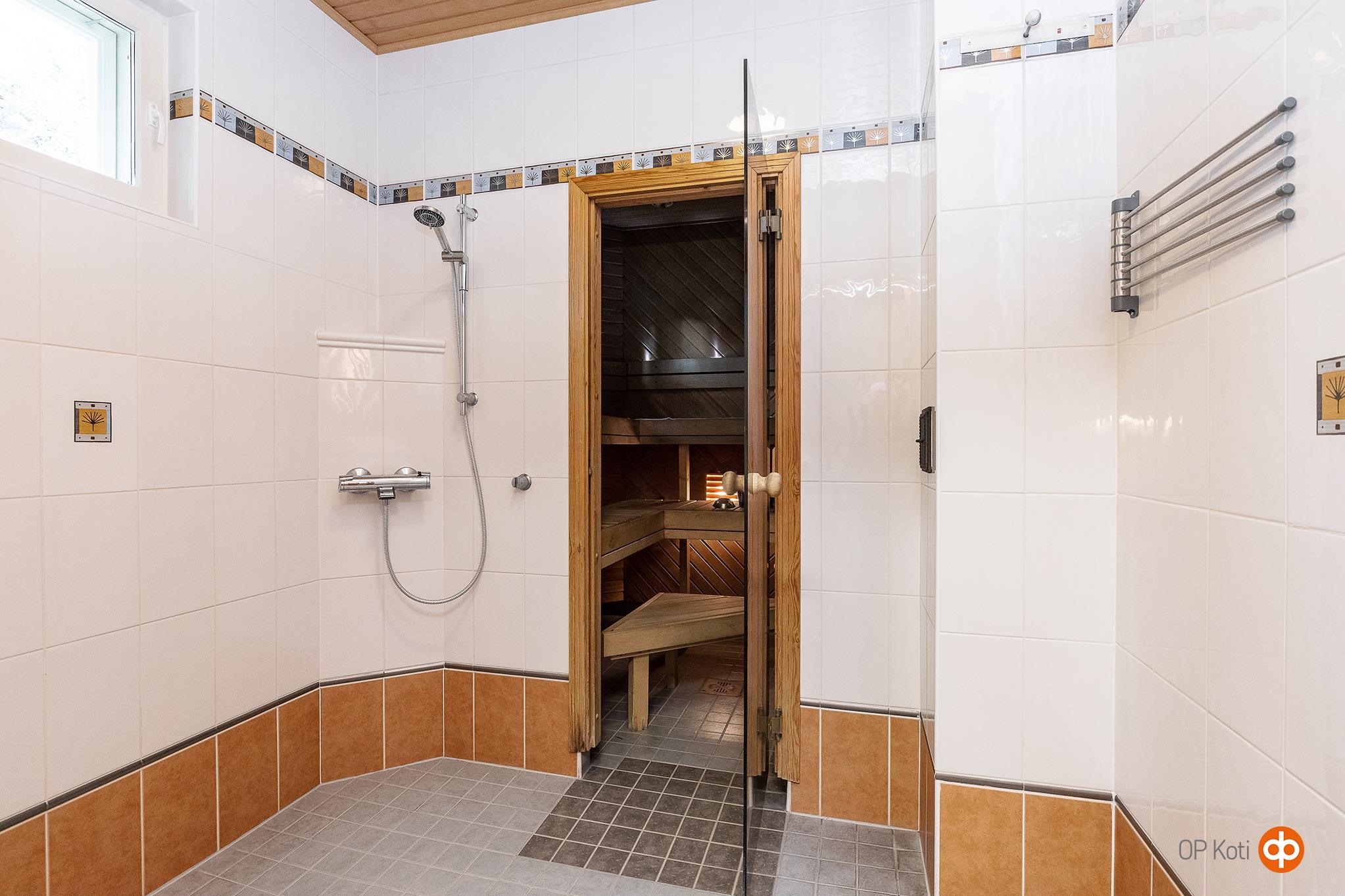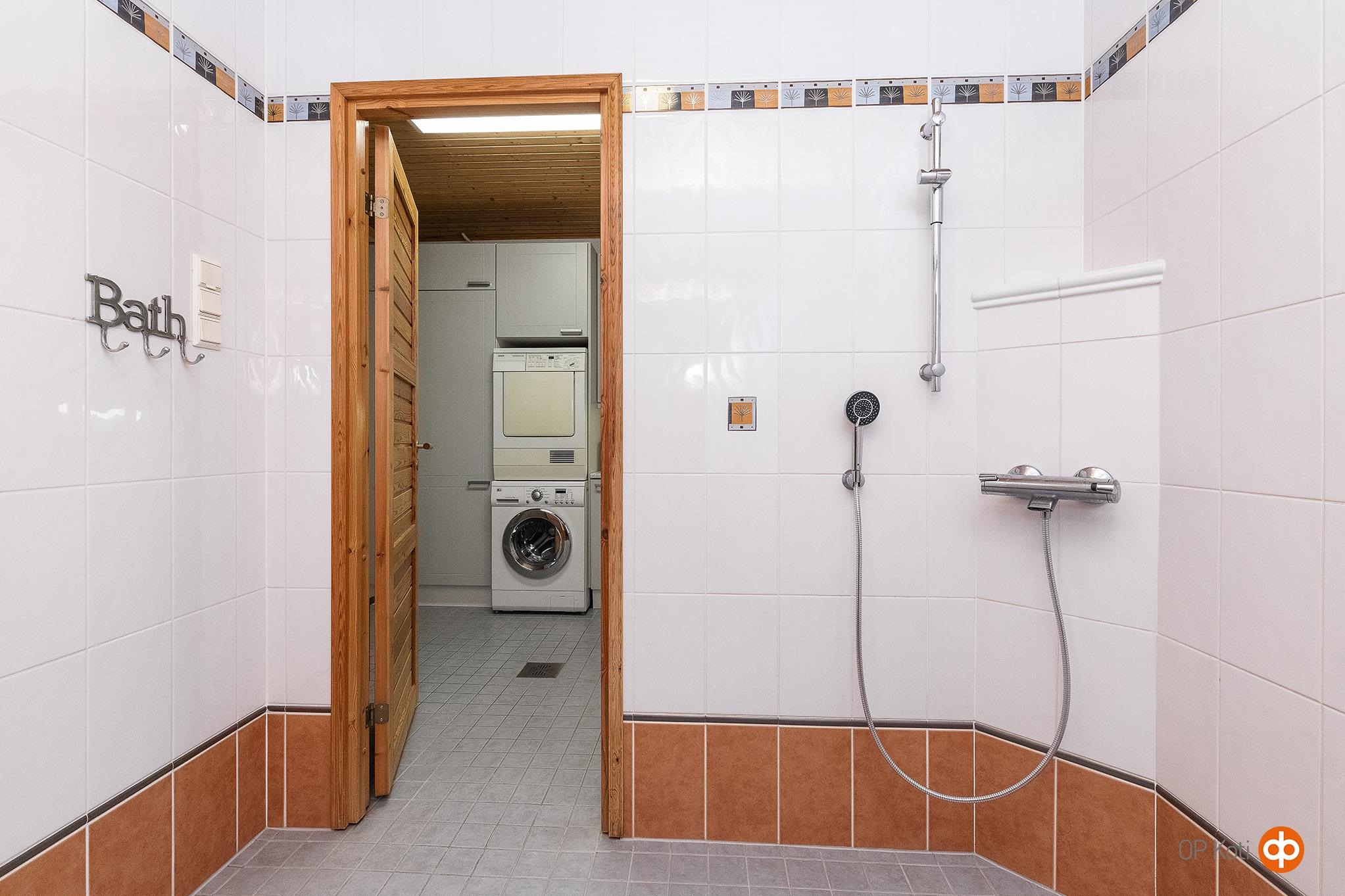 - Kylpyhuoneessa kaksi suihkua. Saunassa puulämmitteinen kiuas. Tilavasssa kodinhoitohuoneessa paikka- ja liitäntä pesutornille sekä kaappi- ja tasotilaa pyykkihuollolle. Tilasta uloskäynti. Kaksi erillistä wc:tä. Molemmissa peili- ja allaskaappi.