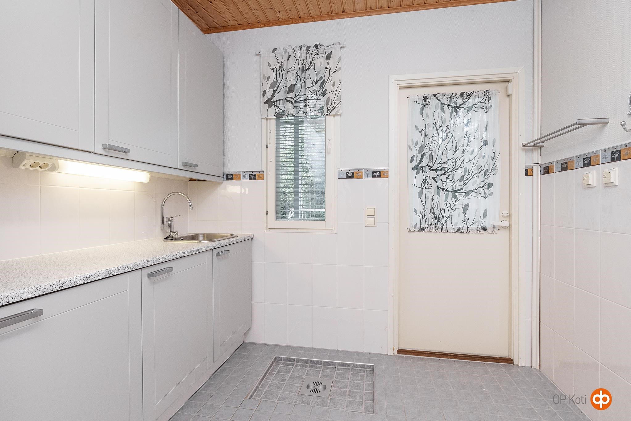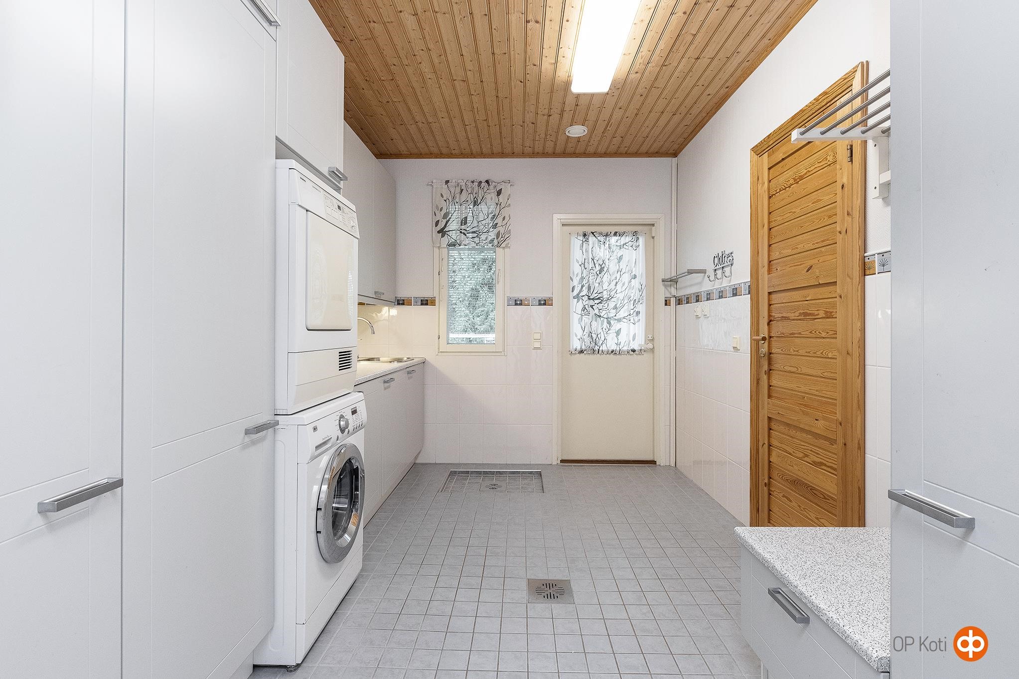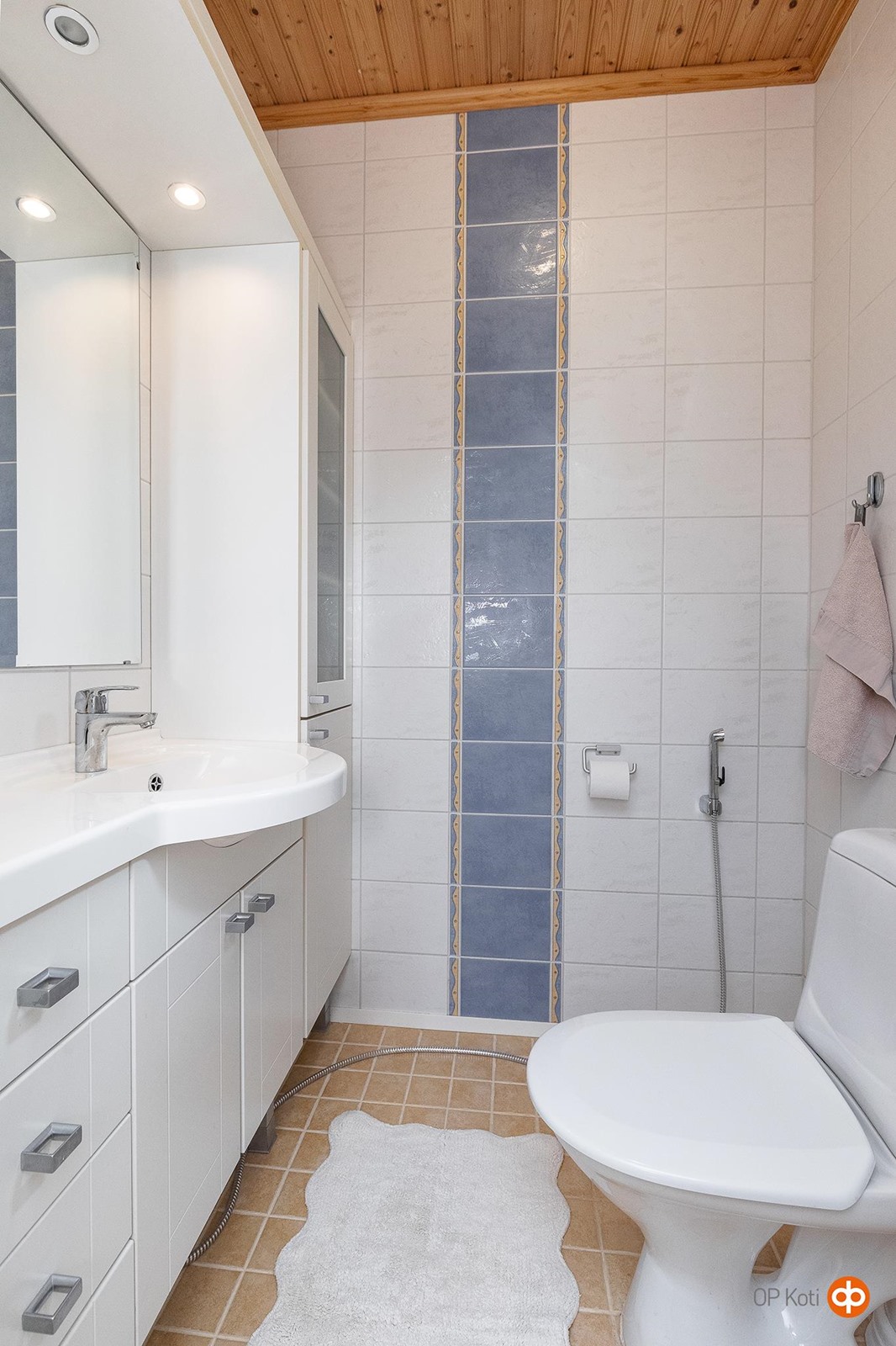 - Kylpyhuoneessa kaksi suihkua. Saunassa puulämmitteinen kiuas. Tilavasssa kodinhoitohuoneessa paikka- ja liitäntä pesutornille sekä kaappi- ja tasotilaa pyykkihuollolle. Tilasta uloskäynti. Kaksi erillistä wc:tä. Molemmissa peili- ja allaskaappi.
