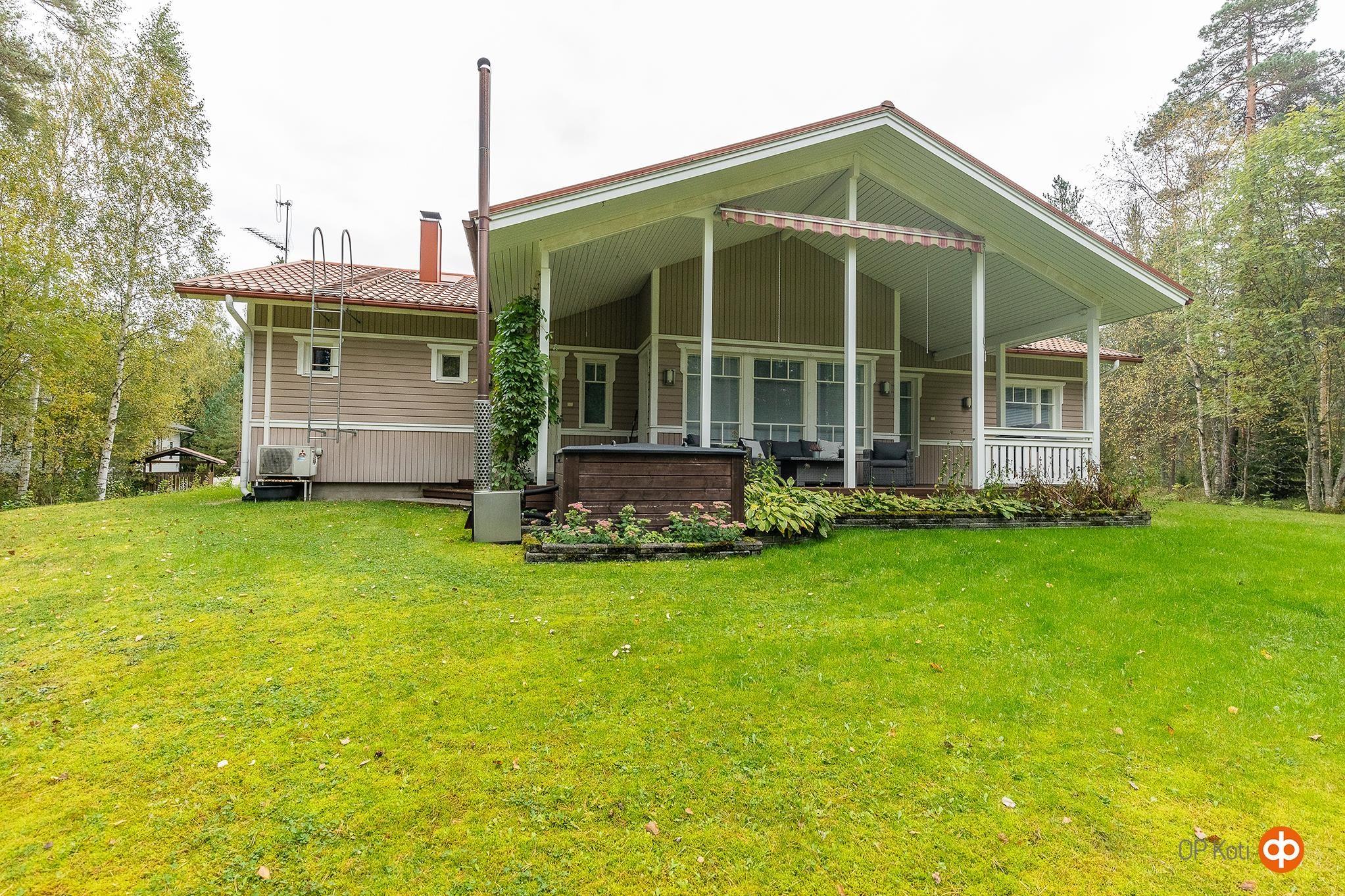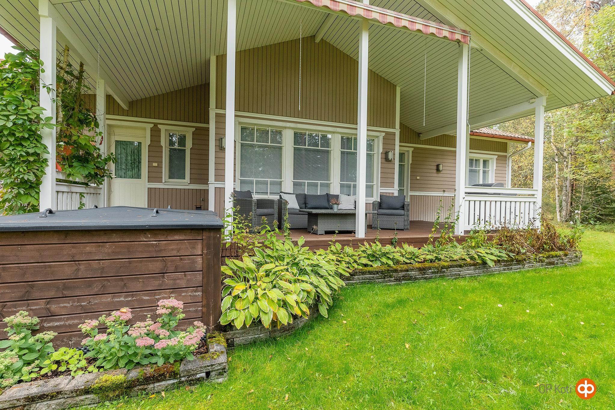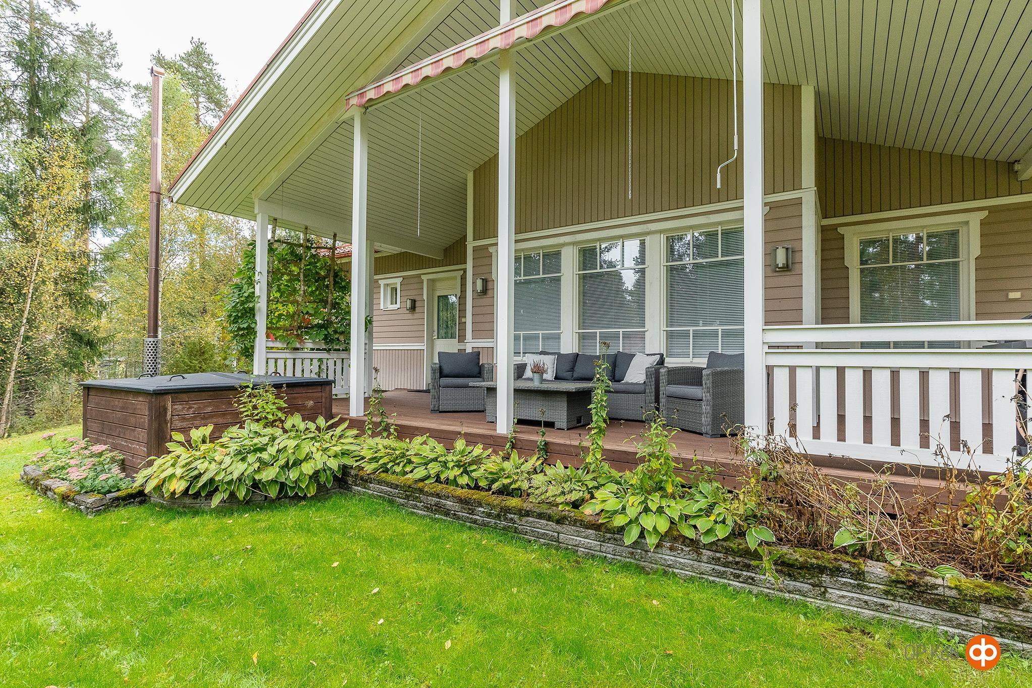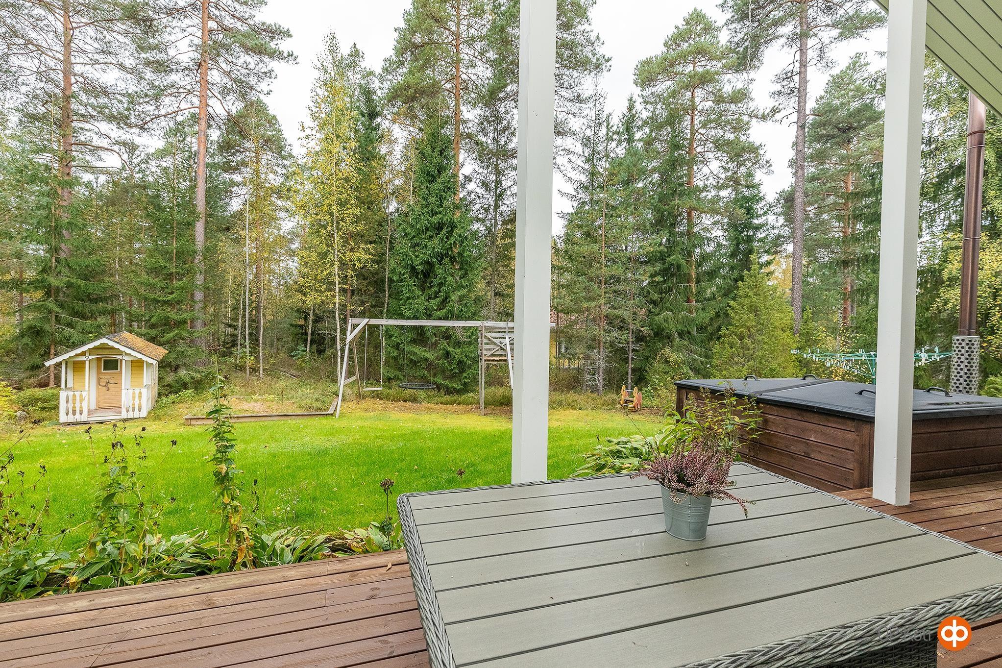 Suojaisa takapiha ja tilava katettu terassi kutsuvat rentoutumaan, grillaamaan ja nauttimaan ulkoilmasta. Saunan jälkeen voit pulahtaa paljuun ja jatkaa rentoutumista. Ulkoilun ystäville Hähkänän pururata alkaa aivan talon vierestä.