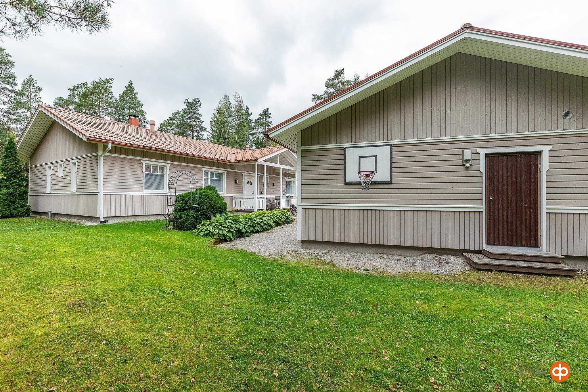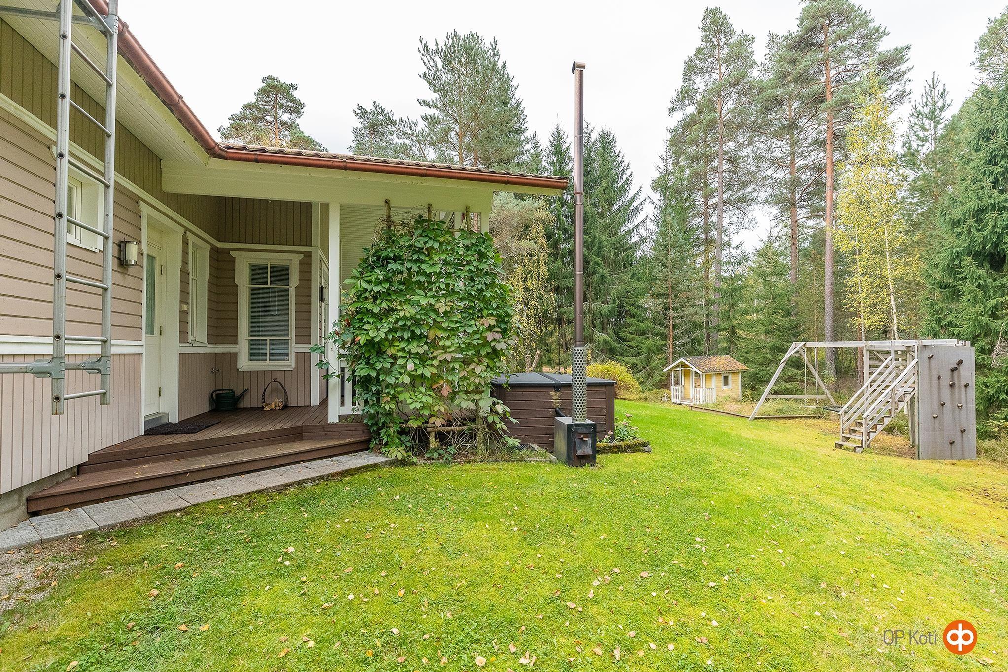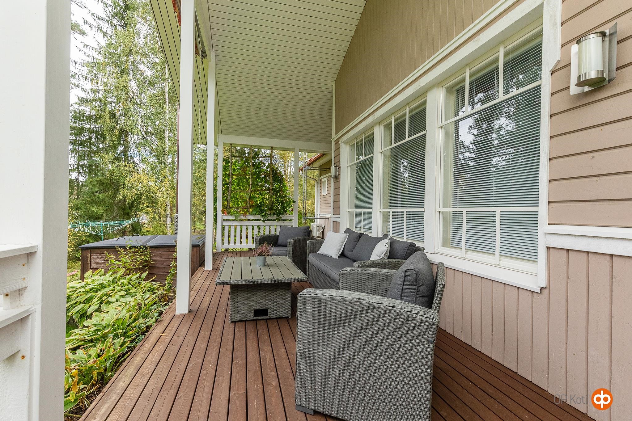 Suojaisa takapiha ja tilava katettu terassi kutsuvat rentoutumaan, grillaamaan ja nauttimaan ulkoilmasta. Saunan jälkeen voit pulahtaa paljuun ja jatkaa rentoutumista. Ulkoilun ystäville Hähkänän pururata alkaa aivan talon vierestä.