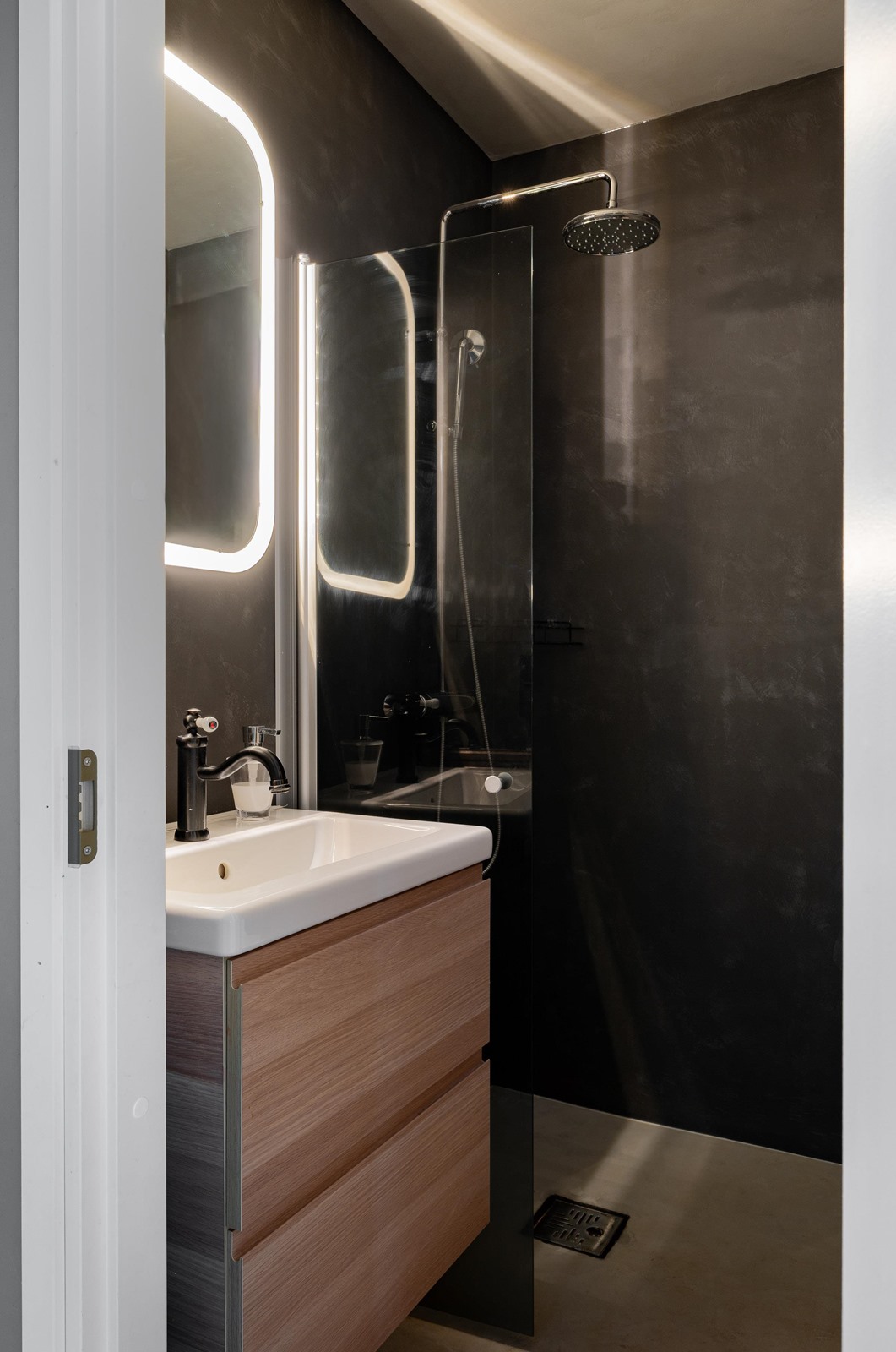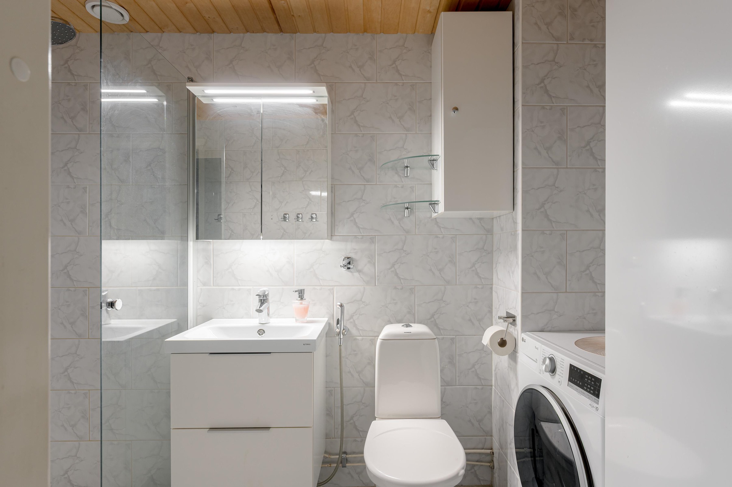 - Sauna, sähkökiuas. Alakerta kylpyhuone: Suihku, suihkuseinä, alaskaappi, peilikaappi, pesukoneliitäntä, vesikiertoinen lattialämmitys. Yläkerta erillinen wc: suihku, suihkuseinä, peilikaappi, allaskaappi. Kiinteät valaisimet.