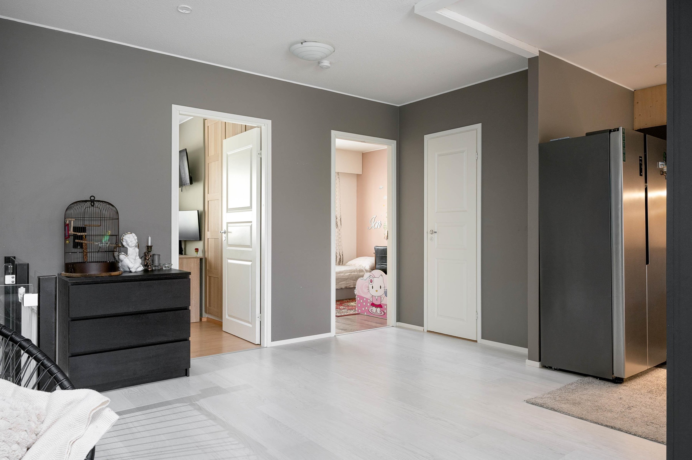 Keittiö: Laminaatti ja seinät maalattu. Olohuone: Laminaatti ja seinät maalattu. Makuuhuone 1: Laminaatti ja seinät maalattu. Makuuhuone 2: Laminaatti ja seinät maalattu. Makuuhuone 3: Laminaatti ja seinät maalattu. Sauna: Laattalattia ja seinät paneloitu. Kylpyhuone: Laattalattia ja seinälaatta. Eteinen: Laminaatti. Yläkerta Wc: Laattalattia ja seinät mikrosementtiä.