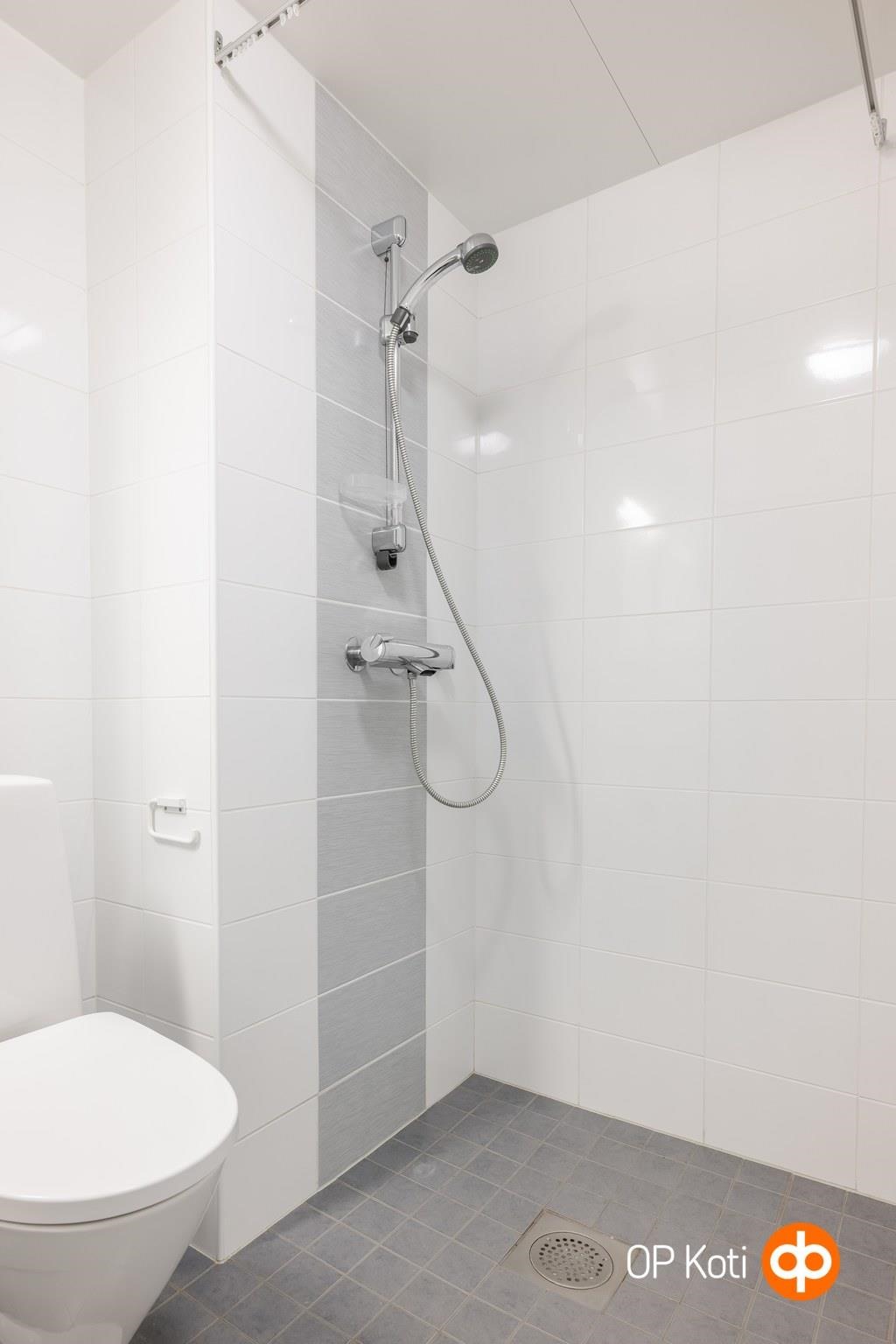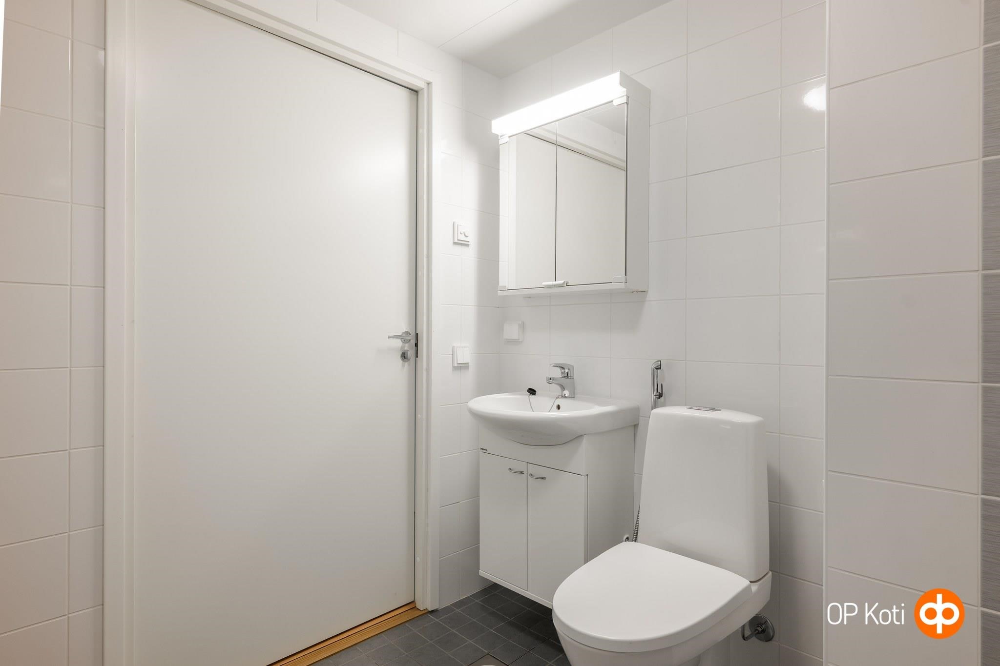- Kylpyhuone, suihku, peilikaappi, allaskaappi, pesukoneliitäntä, lattialämmitys, kiinteät valaisimet.