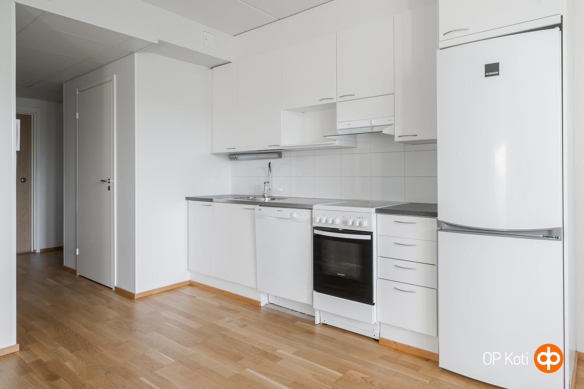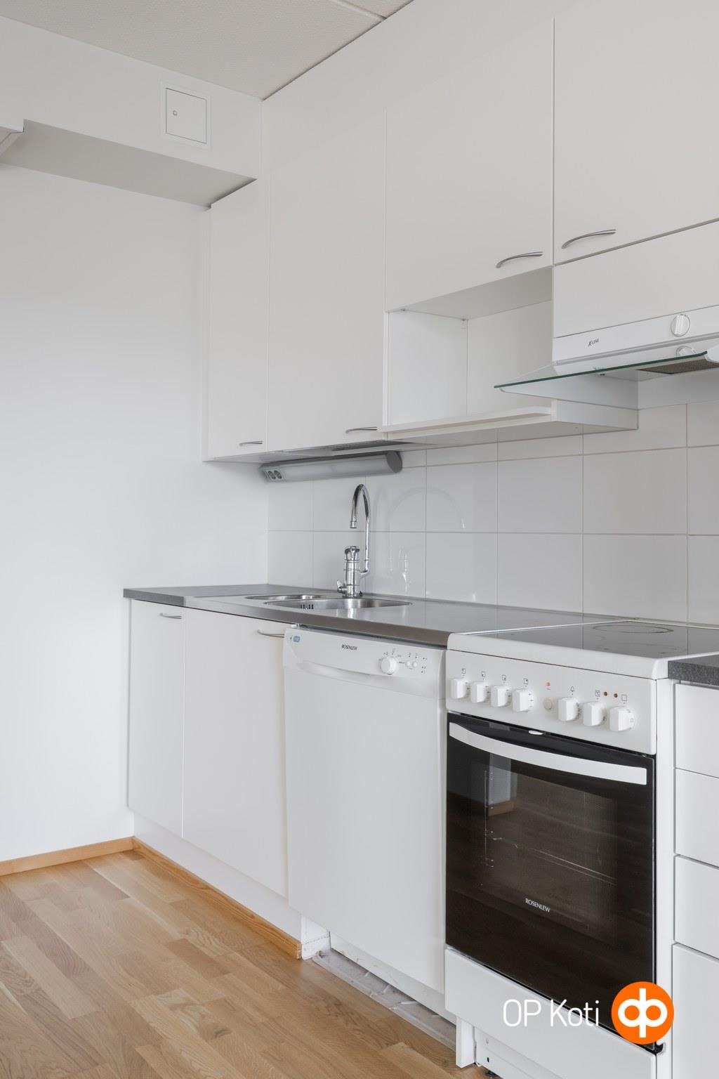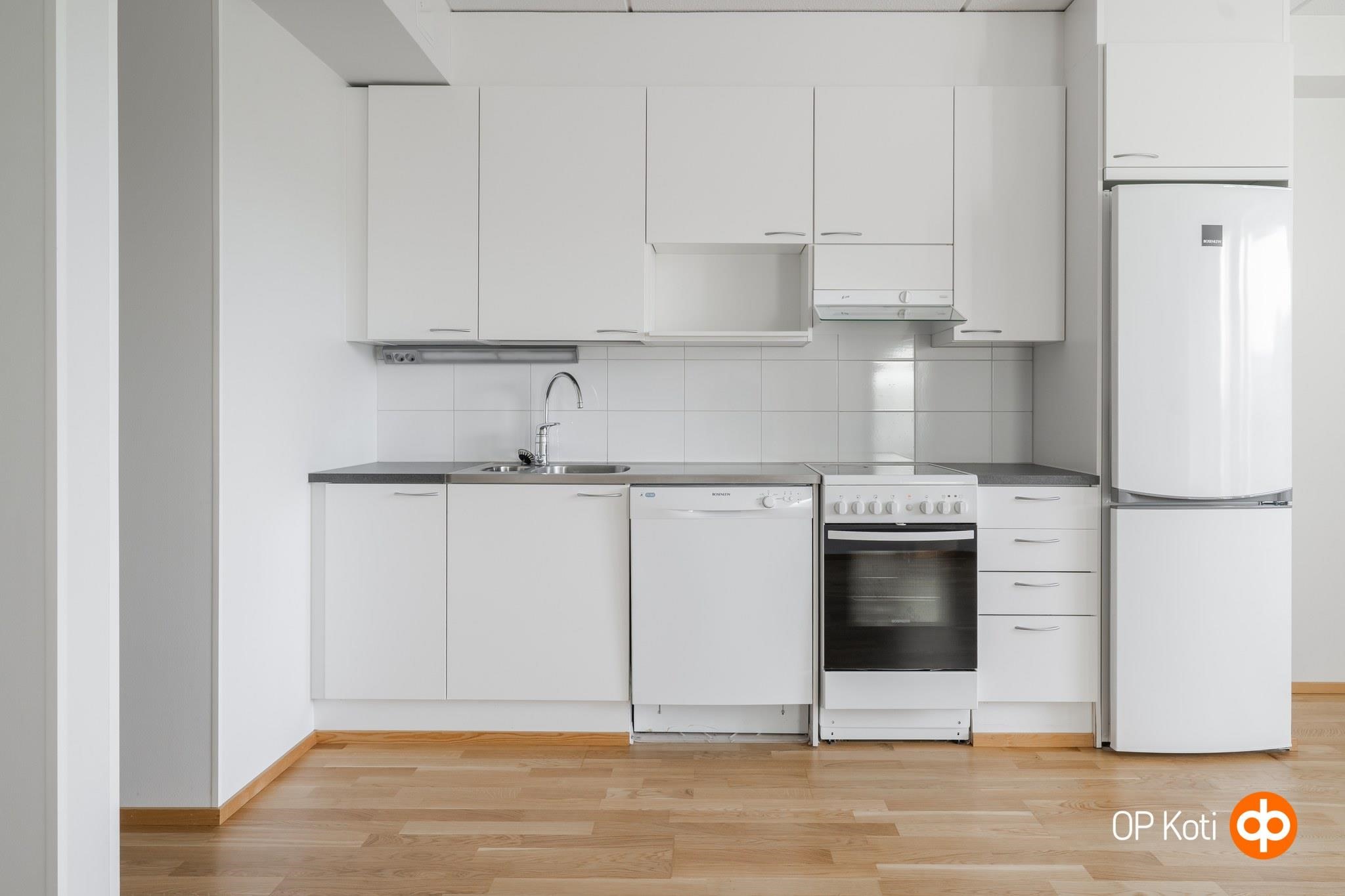 - Jääkaappipakastin, lattialiesi, keraaminen liesi, liesikupu, astianpesukone, kaapistot, kiinteät valaisimet.