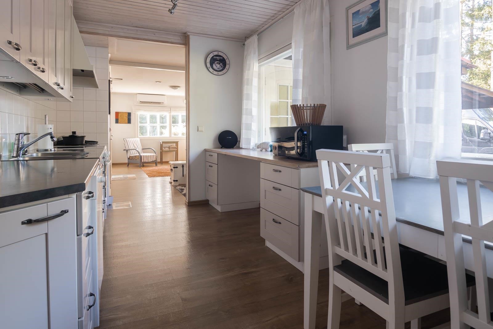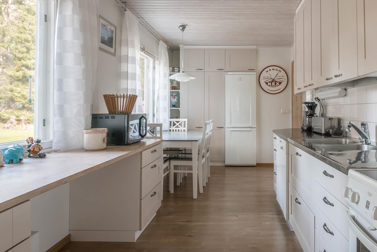 - Jääkaappipakastin, sähköliesi, liesituuletin, astianpesukone, kaapistot, kiinteät valaisimet. Puuhella