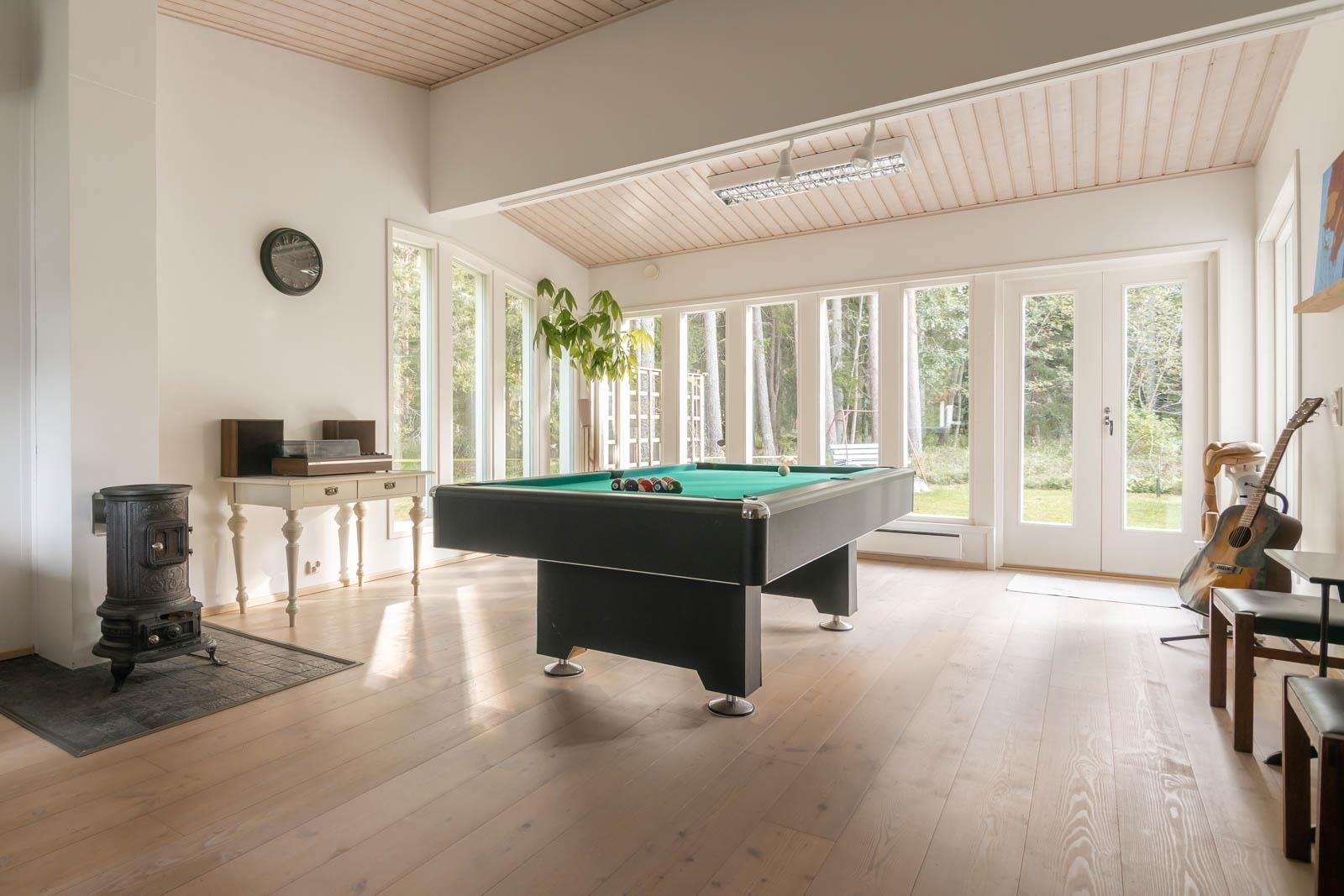 Keittiö: aminaatti, maalattu. Olohuone: laminaatti, maalattu. Makuuhuone 1: laminaatti, maalattu. Makuuhuone 2: laminaatti, maalattu. Sauna: laattalattia, maalattu, paneeli. Kylpyhuone: laattalattia, kaakeliseinät. Wc: laattalattia, paneeli. Ateljee: puulattia (Timberwise), maalattu. Kirjasto: laminaatti, maalattu..