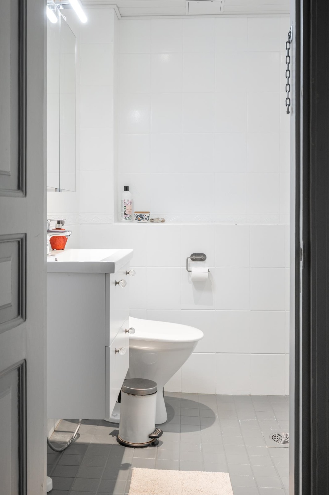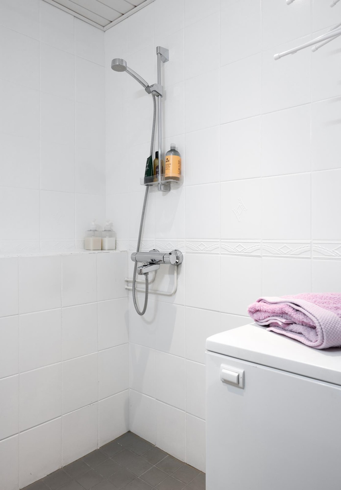 - Kylpyhuone kph+wc, suihku, peilikaappi, allaskaappi, pesukoneliitäntä, lattialämmitys, kiinteät valaisimet.