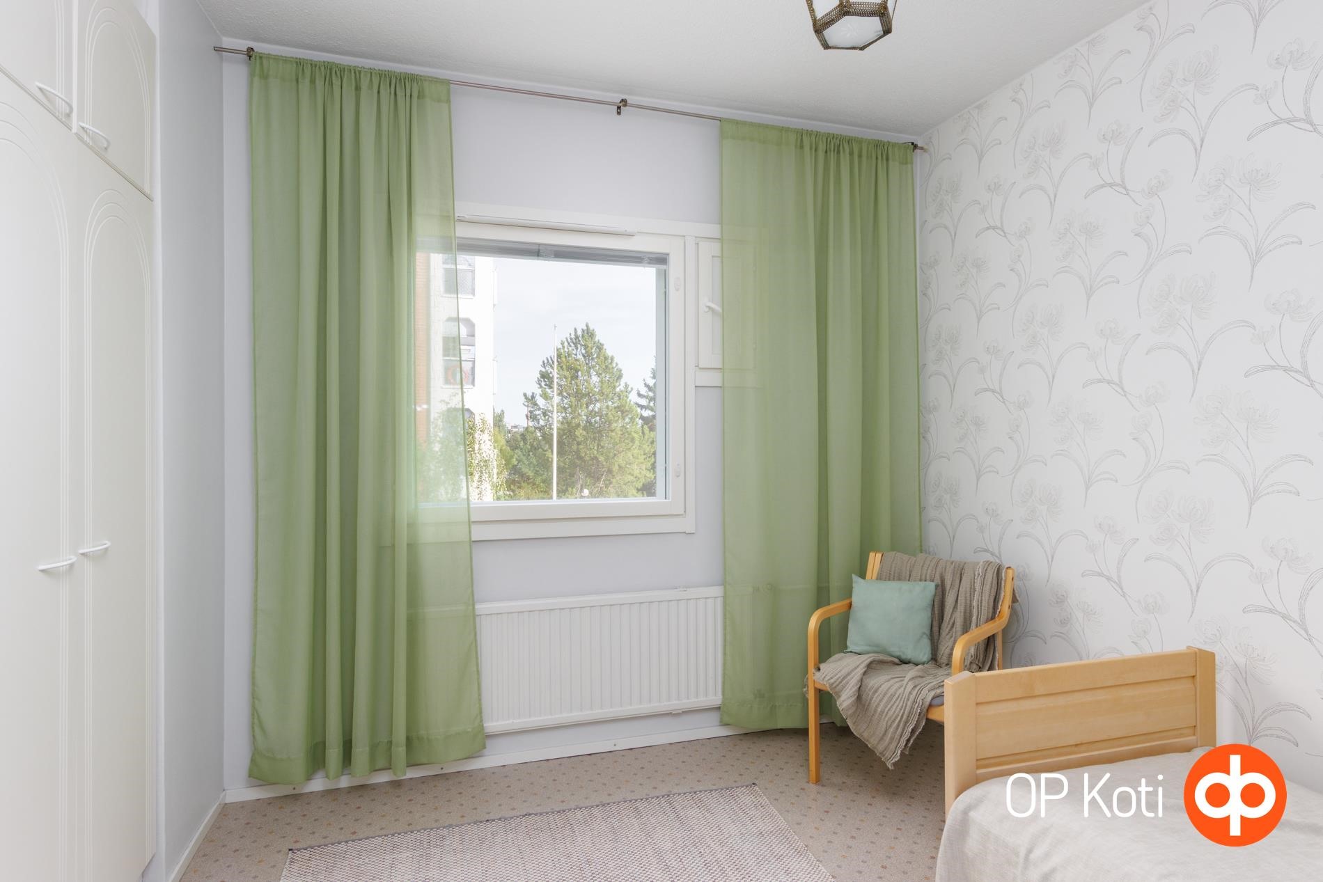 - Parvekkeen näkymät pohjoinen, muut ikkunat luoteeseen. Ikkunoista puistomaiset näkymät ja taloja vieressä.