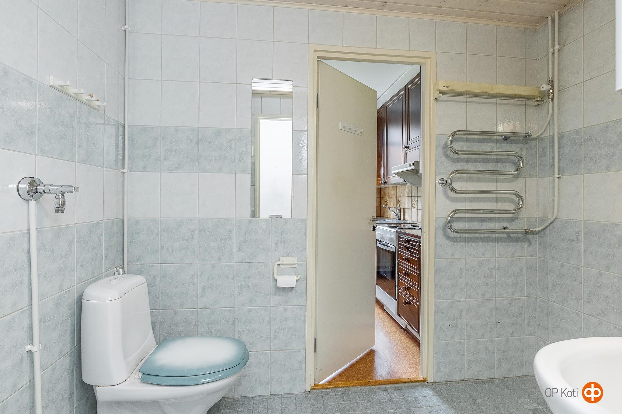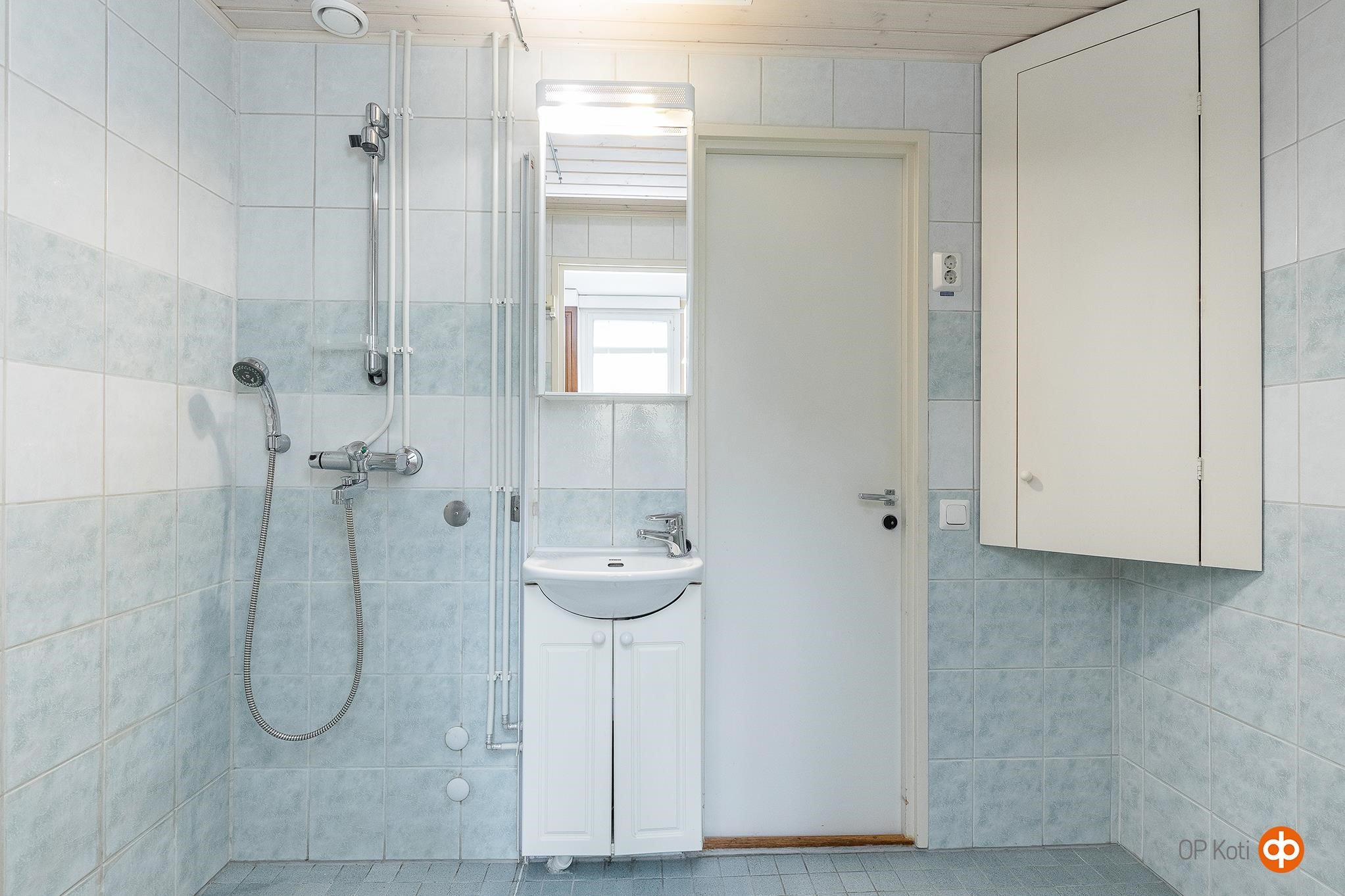 - Kylpyhuone, suihku, peilikaappi, allaskaappi, pesukoneliitäntä, kiinteät valaisimet.