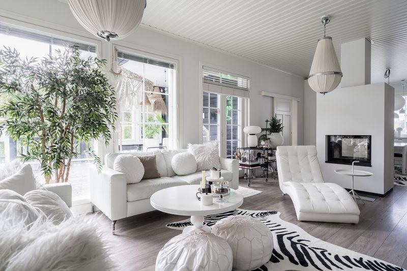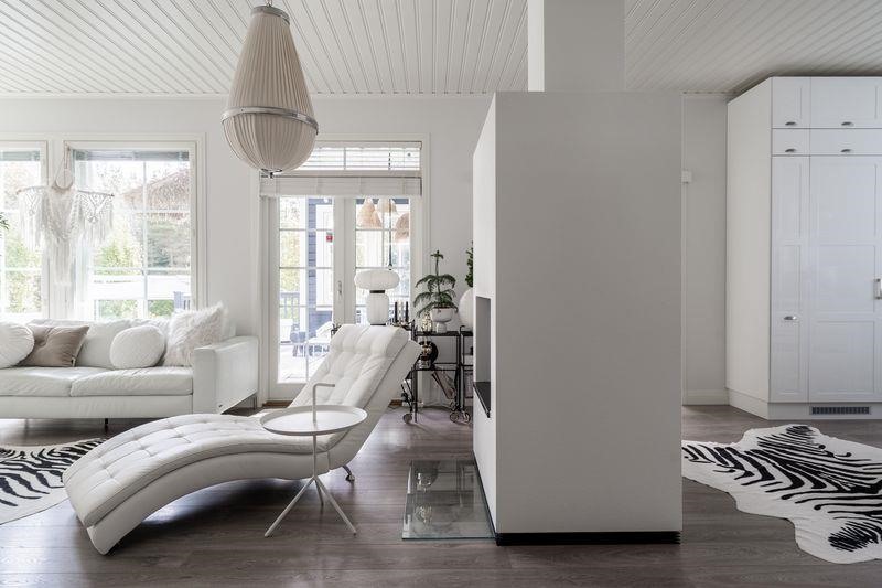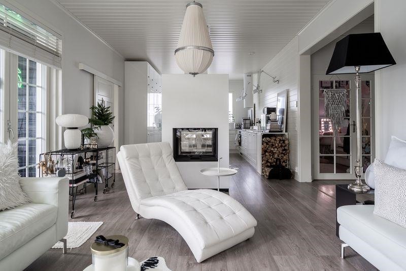 Keittiö: Maalatut seinät ja laminaattilattia. Olohuone: Maalatut seinät ja laminaattilattia.. Makuuhuone 1: Maalatut seinät ja laminaattilattia. Makuuhuone 2: Maalatut seinät ja laminaattilattia. Makuuhuone 3: Maalatut seinät ja laminaattilattia. Tämä huone toimii tällä hetkellä vaatehuoneena. Kodinhoitohuone: Maalatut seinät ja laattalattia. Sauna: Seinät puupaneelia ja laattalattia. Kph:een ja saunan välinen seinä on lasia.. Kylpyhuone: Seinät kaakeloitu ja laattalattia. Eteinen: Maalatut seinät ja laminaattilattia.. Wc: Tapettia ja laattalattia. Kirjasto: Maalatut seinät ja laminaattilattia. Lasipariovet terassille..