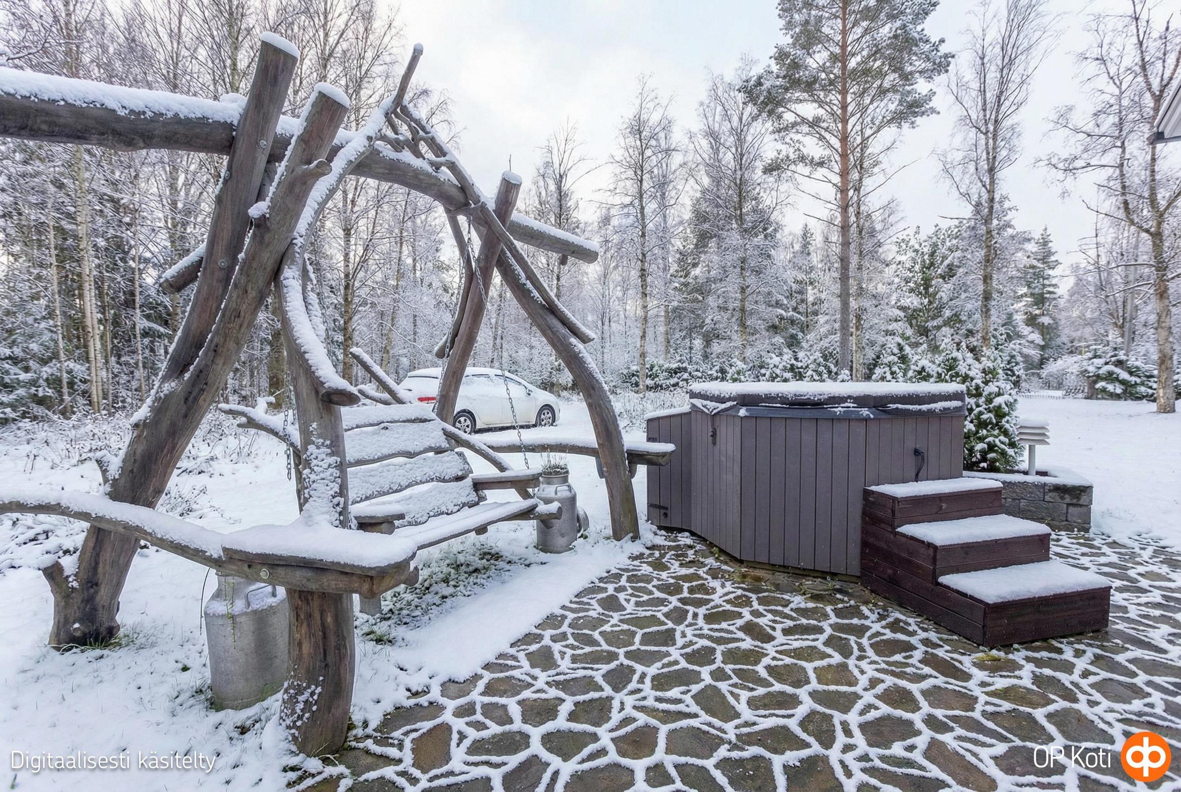 Kodissa on mukavasti tilaa olohuoneen, keittiön ja 2 makuuhuoneen lisäksi työhuoneessa ja askartelutilassa, jotka soveltuvat mainiosti makuuhuoneiksi tarvittaessa. Vaaleat, ajattomat sisustusmateriaalit ja korkeat huoneet luovat valoisan ja rauhallisen tunnelman.Olohuoneesta avautuu ovi tilavalle katetulle terassille, joka on arkena ja viikonloppuisin perheen suosikkipaikka oleilluun ja paljun lämmöstä nauttimiseen.