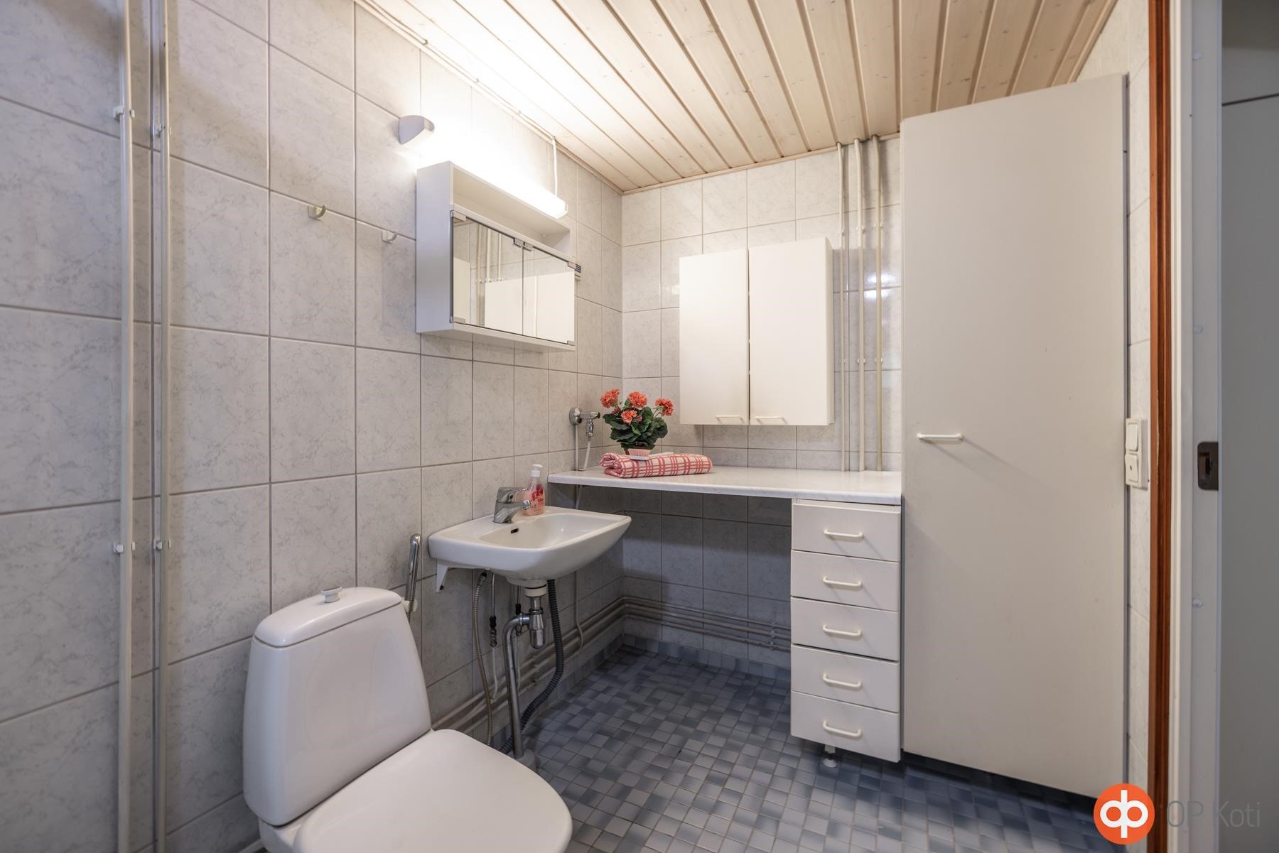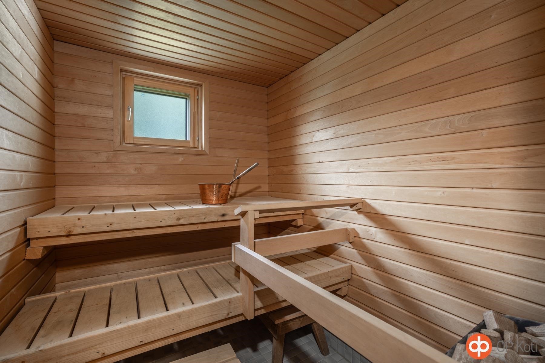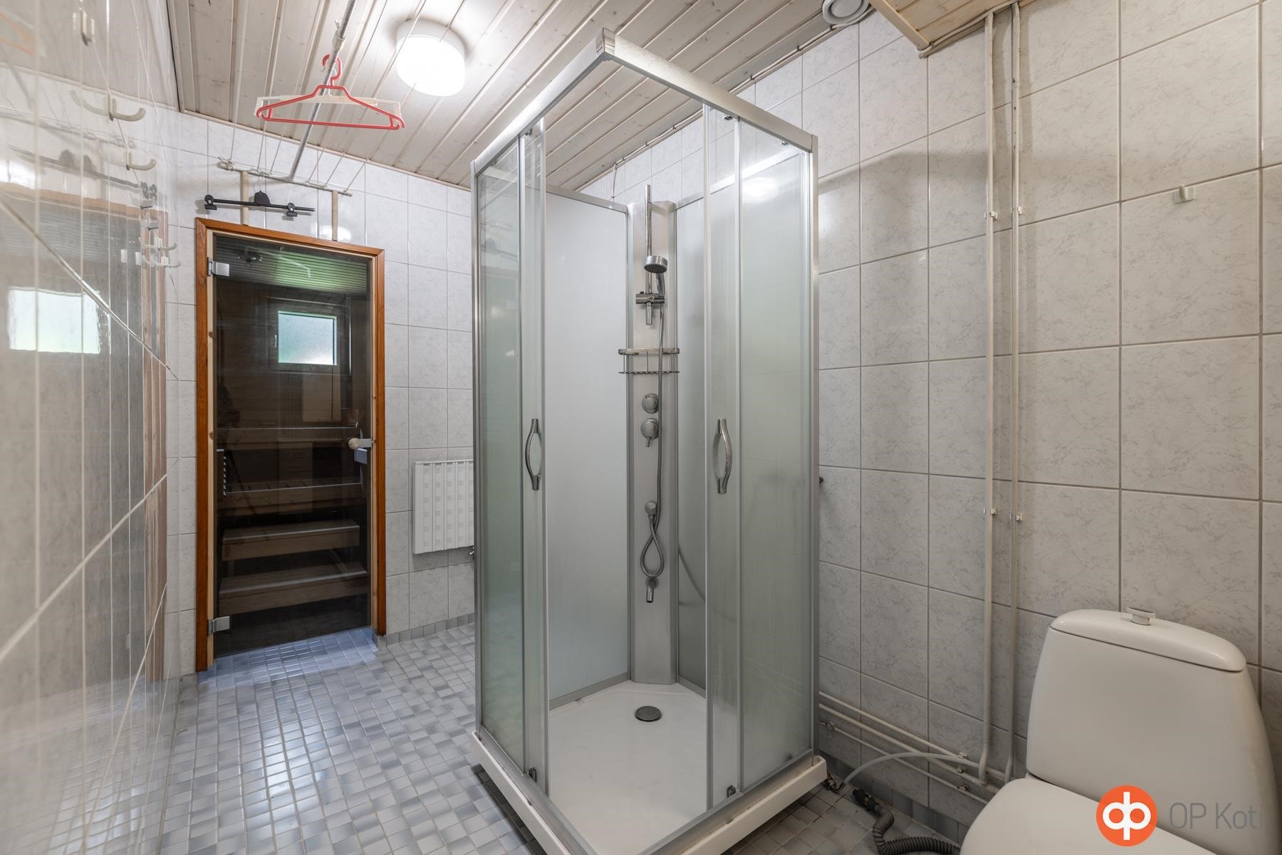 - Sauna, sähkökiuas, kylpyhuone, suihku, suihkukaappi, peilikaappi, kaapit, pesukoneliitäntä, kiinteät valaisimet.