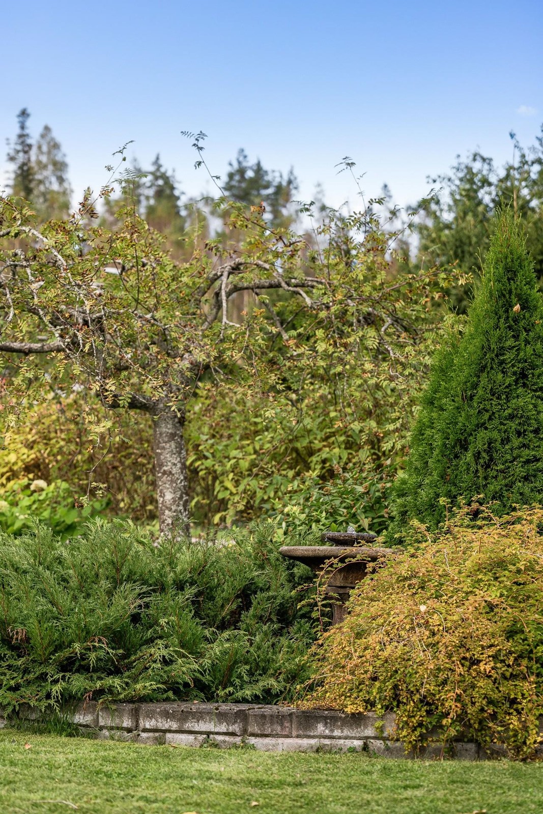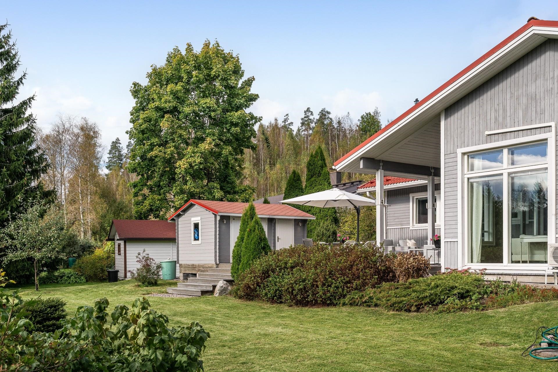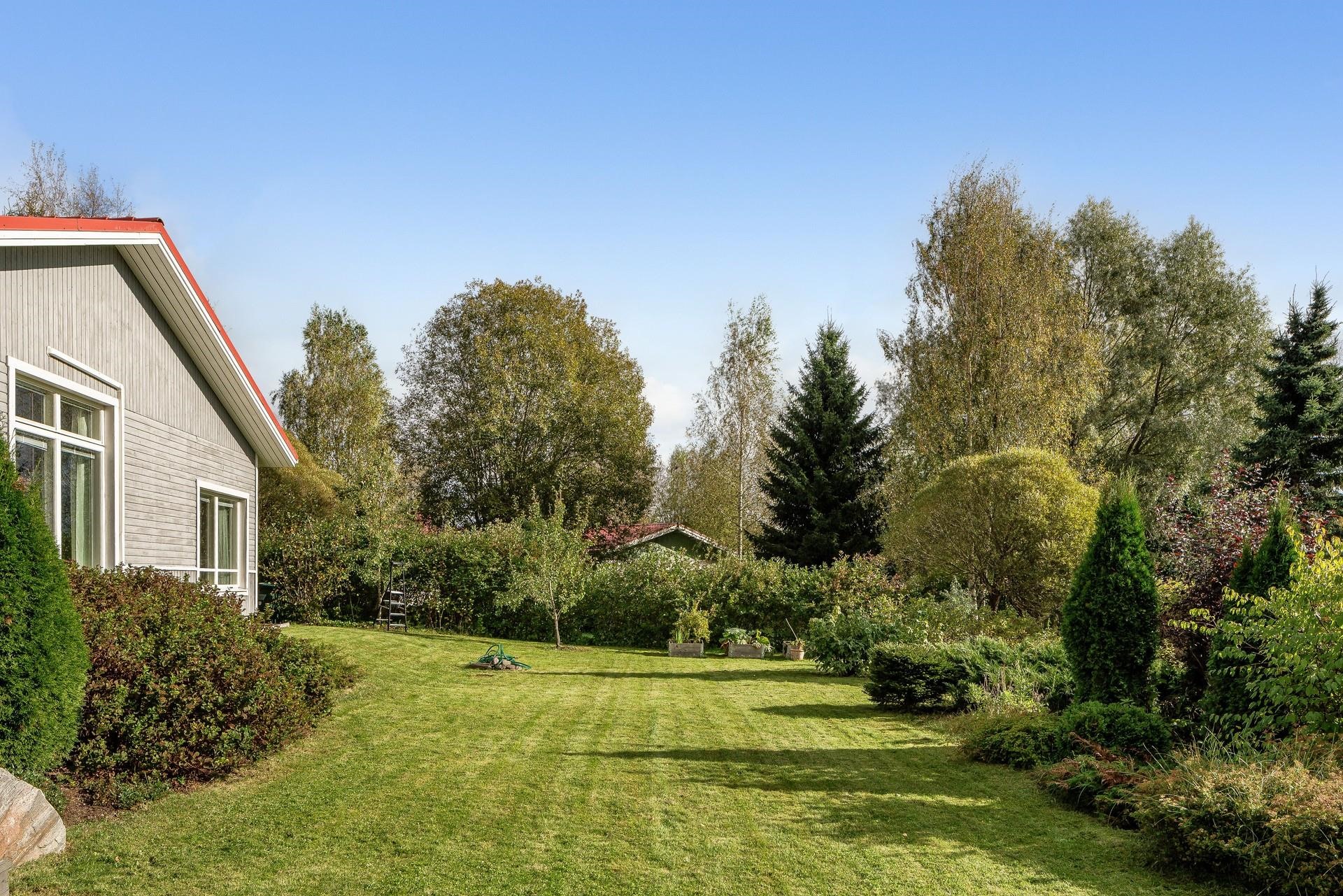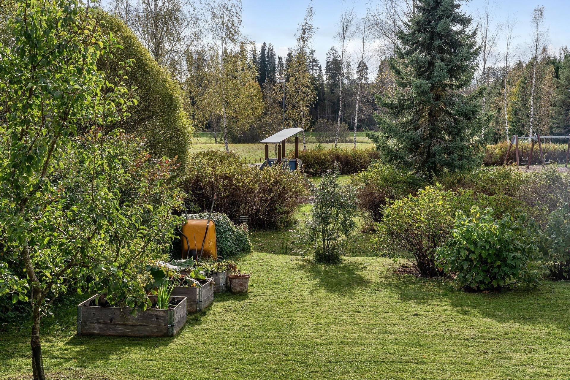 Puutarha: marjapensaita, hedelmäpuita ja viihtyisä piha-alue.