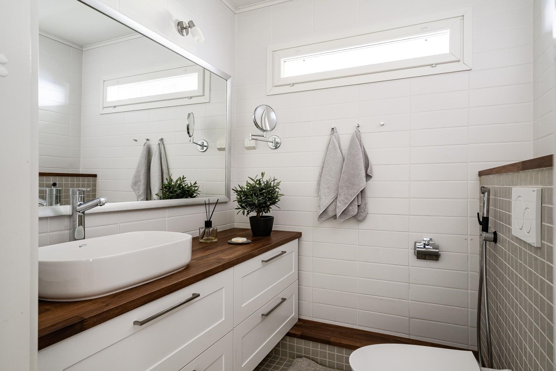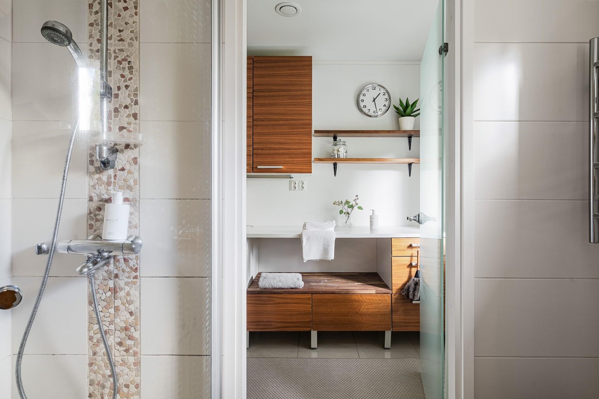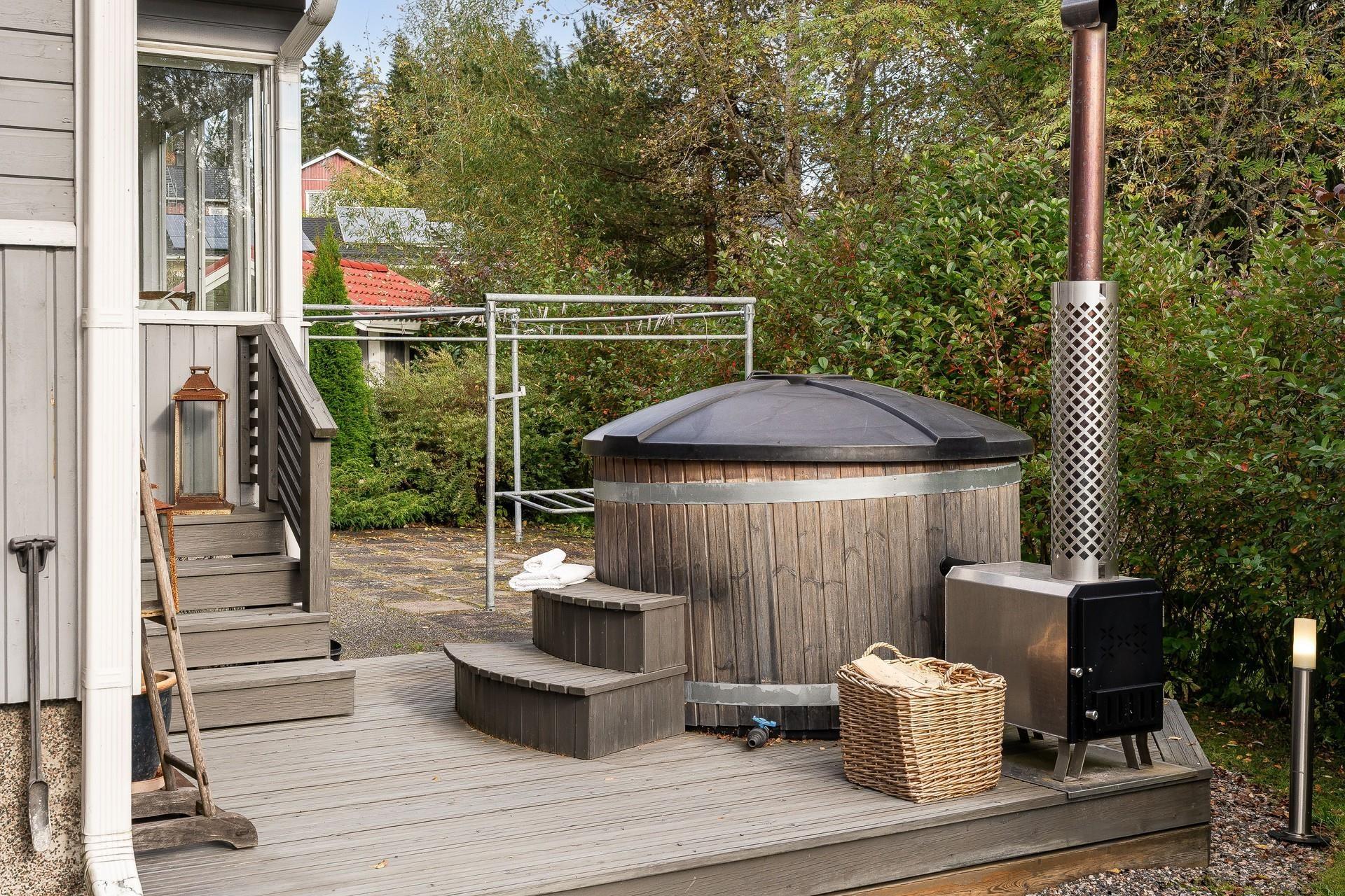 - Sauna, sähkökiuas heti valmis, kylpyhuone, erillinen wc, suihku, suihkuseinä, peilit, peilikaappi, kaapit, pesukoneliitäntä, lattialämmitys, kiinteät valaisimet. Puulämmitteinen palju saunan vieressä terassilla.
