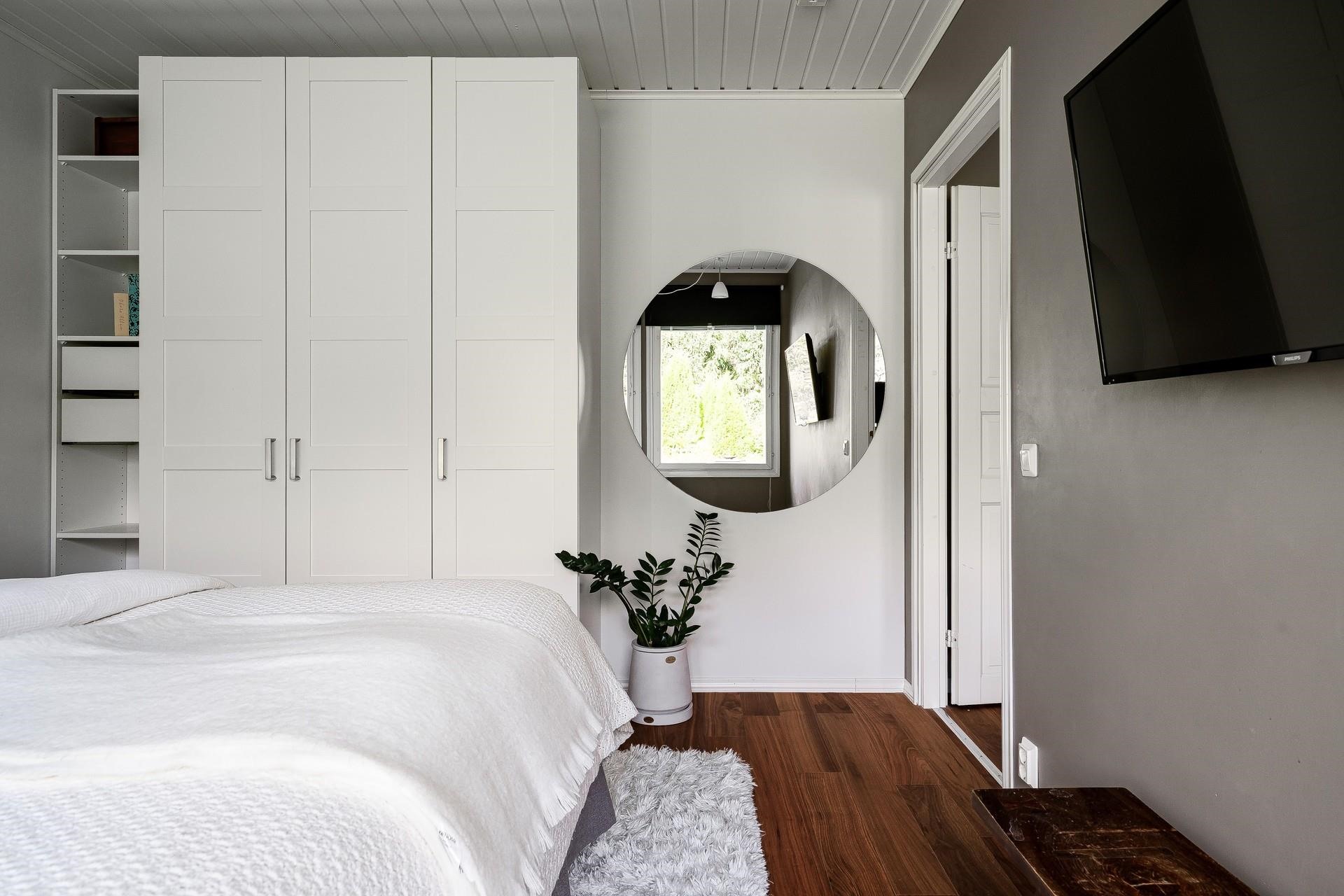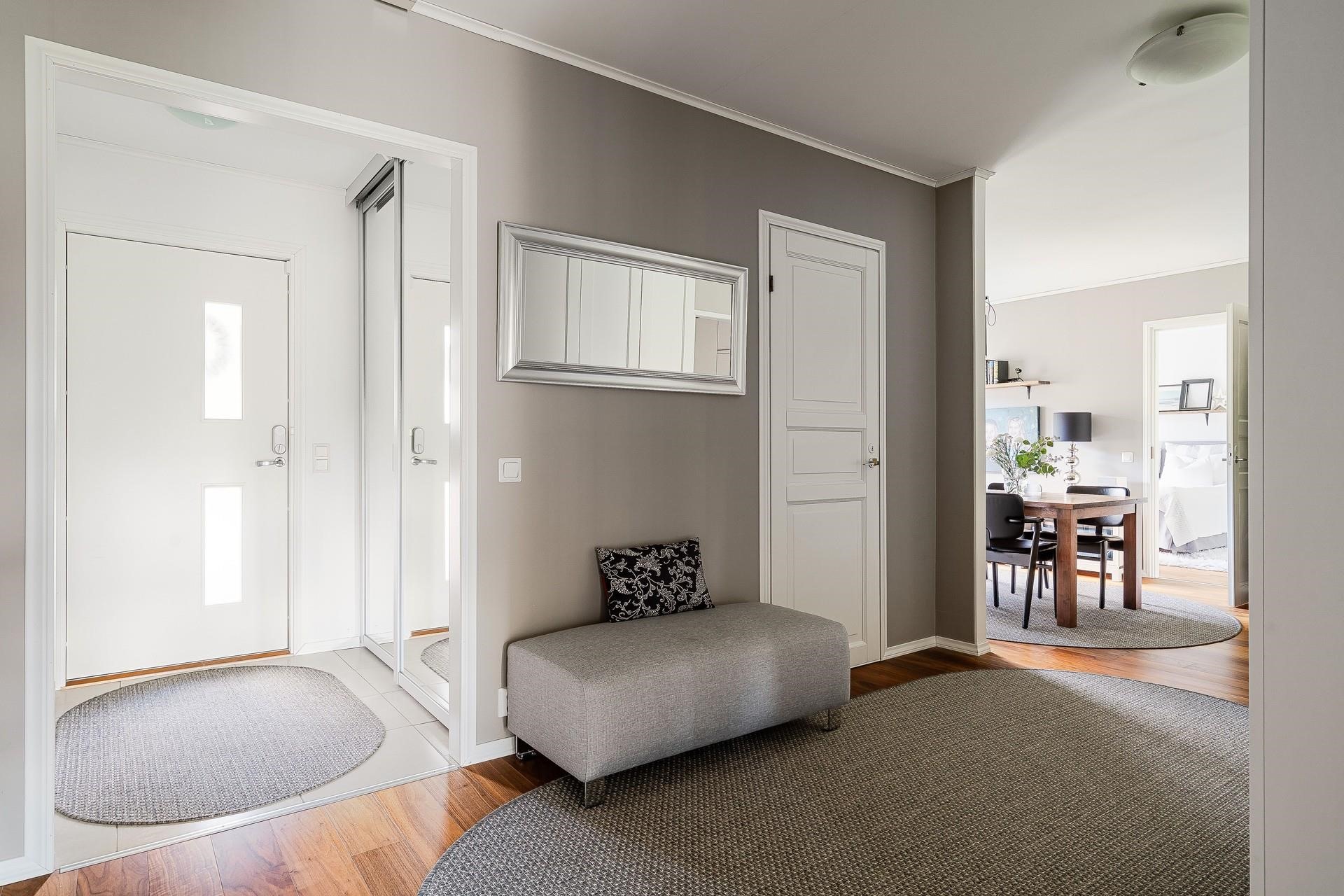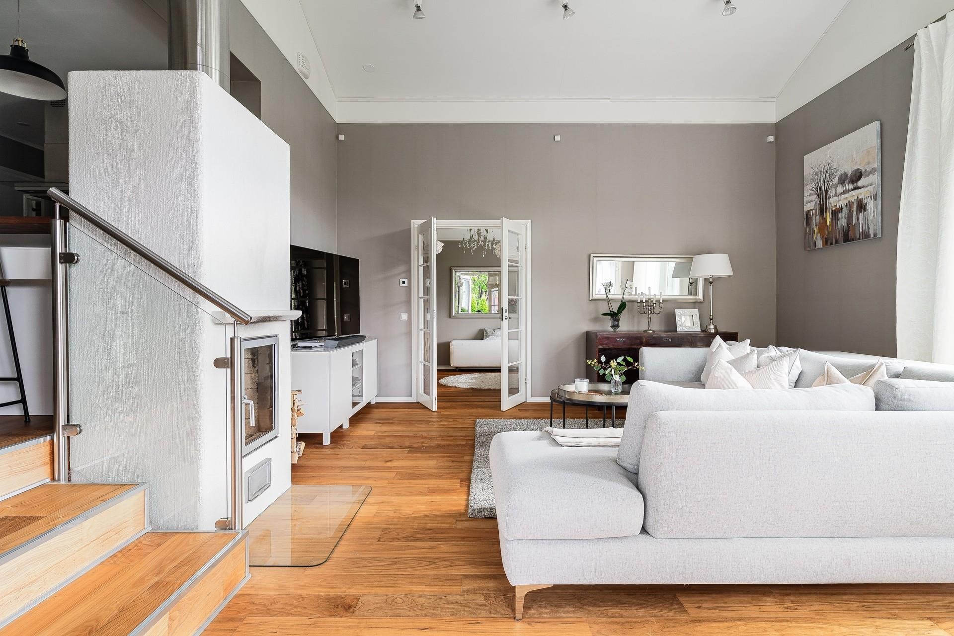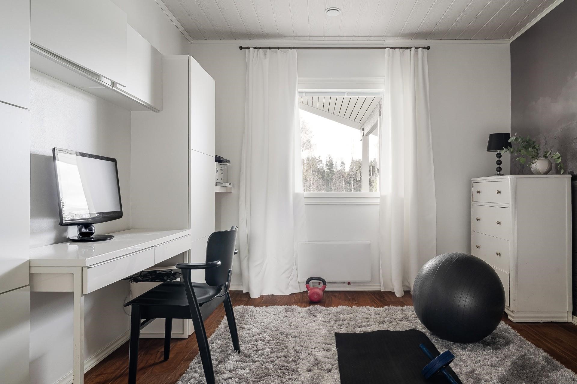 - Keittiö: Kaakelilattia lämmityksellä, tapettiseinät, valkoiseksi maalattu kipsilevykatto. Olohuone: Kovapuuparketti lattialämmityksellä, tapettiseinät ja valkoiseksi maalattu kipsilevykatto. Makuuhuone 1: Kovapuuparketti, tapettiseinät ja valkoiseksi maalattu kipsilevykatto. Makuuhuone 2: Kovapuuparketti, tapettiseinät ja valkoiseksi maalattu kipsilevykatto. Makuuhuone 3: Kovapuuparketti lattialämmityksellä, tapettiseinät ja valkoiseksi maalattu kipsilevykatto. Kodinhoitohuone: Kaakelilattia lämmityksellä, valkoiseksi maalattu seinä ja valkoiseksi maalattu kipsilevykatto. Sauna: Kaakelilattia lämmityksellä, lämpökäsitelty haapalauteet ja seinien+kattojen laudat. Kylpyhuone: Kaakelilattia lämmityksellä, kaakeliseinät ja valkoiseksi maalattu kipsilevykatto. Eteinen: Kaakelilattia lämmityksellä, maalattu seinä, valkoiseksi maalattu kipsilevykatto. Wc: Kaakelilattia lämmityksellä, kaakeliseinät ja valkoiseksi maalattu kipsilevykatto. Työhuone: Laminaattiparketti, maalattu seinä ja MDF paneelikatto.
