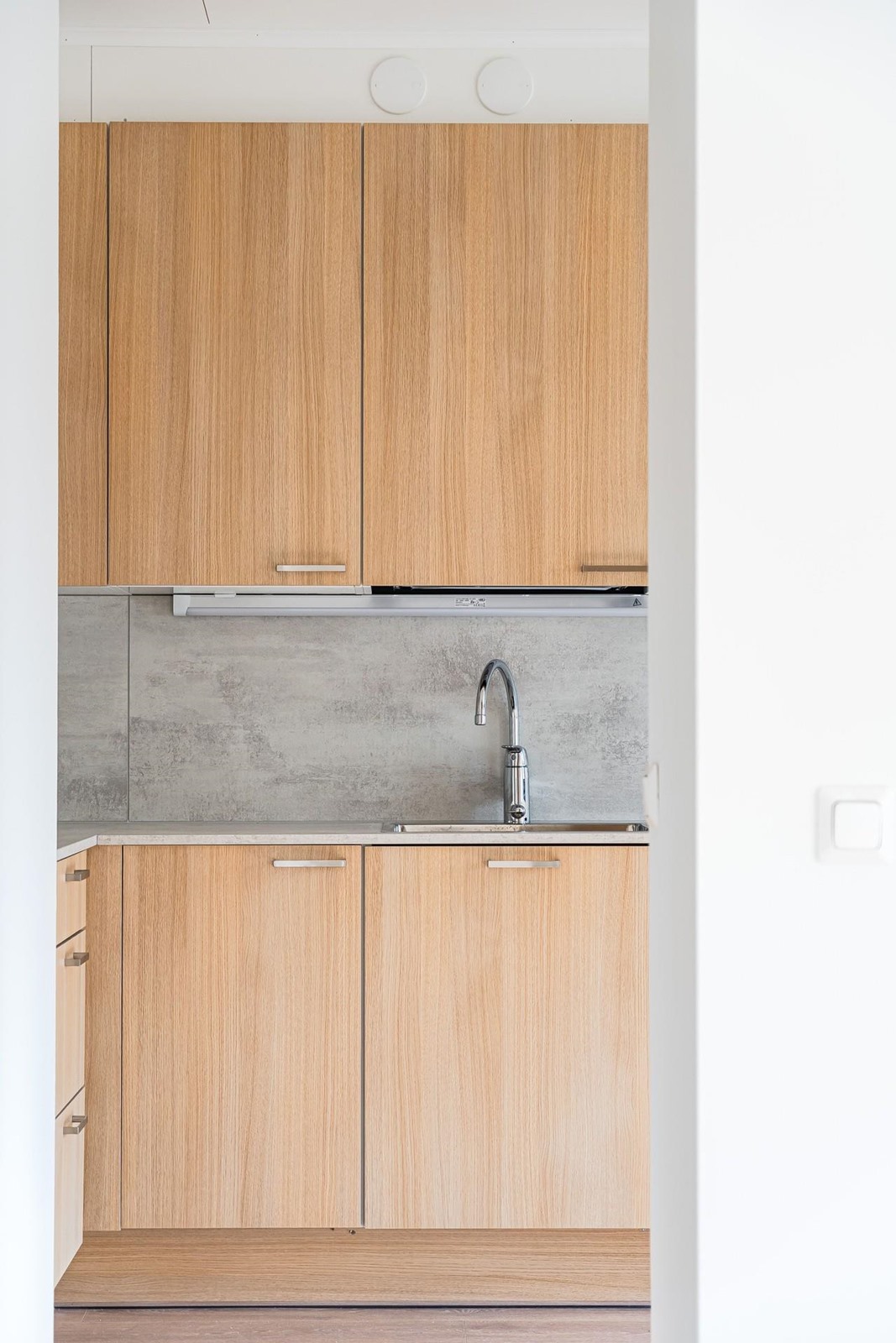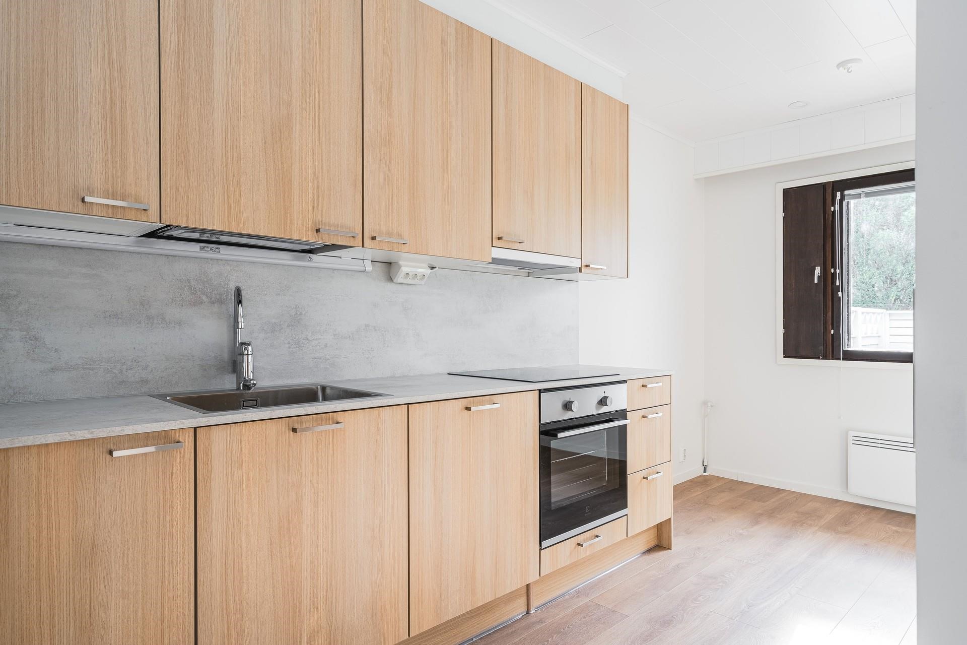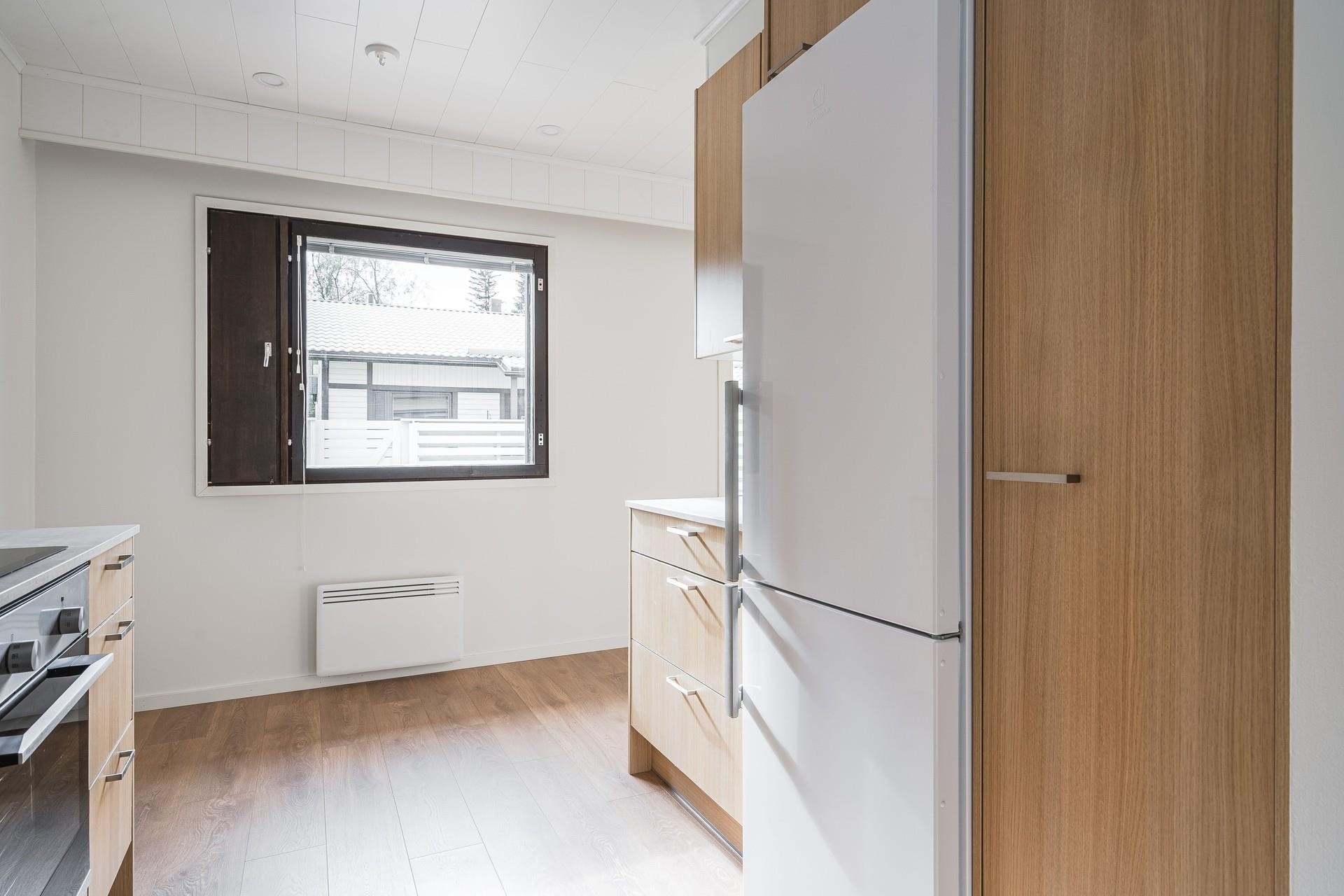 - Jääkaappipakastin, erillisuuni, liesitaso, liesituuletin, astianpesukone integroitu, kiinteät valaisimet. Keittiö on uusittu 2025