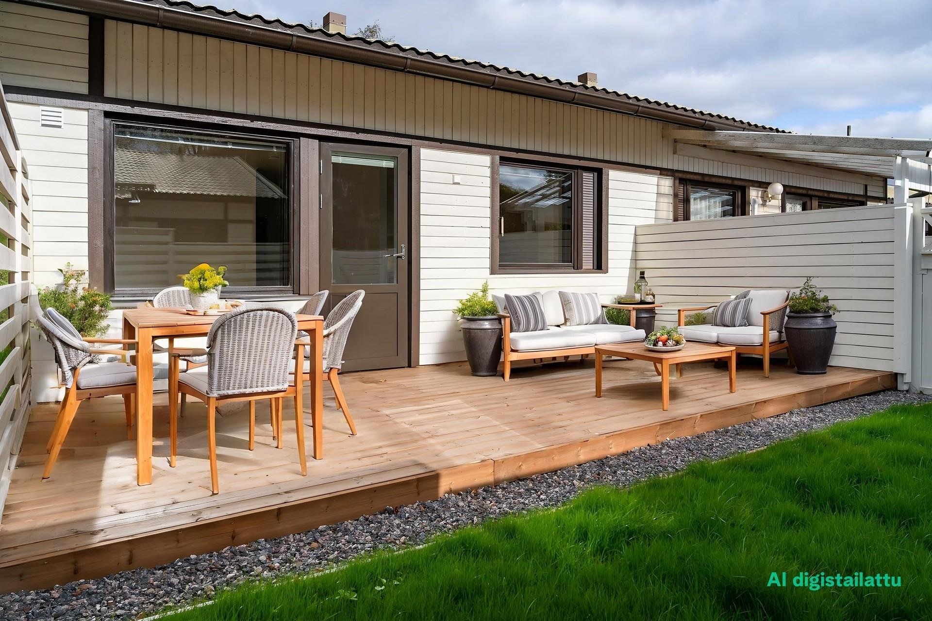 Asunnon keittiö on Puustellin mallistoa, ja se tarjoaa erinomaiset puitteet ruoanlaittoon integroidulla. Kylpyhuoneessa on laatoitettu lattia ja seinät, lattialämmitys sekä moderni sauna sähkökiukaalla. Asuintiloissa vinyylilattia ja maalatut seinät luovat tyylikkään kokonaisuuden. Terassi ja piha on hiljattain uudistettu, mikä mahdollistaa viihtyisän oleskelun ulkona.