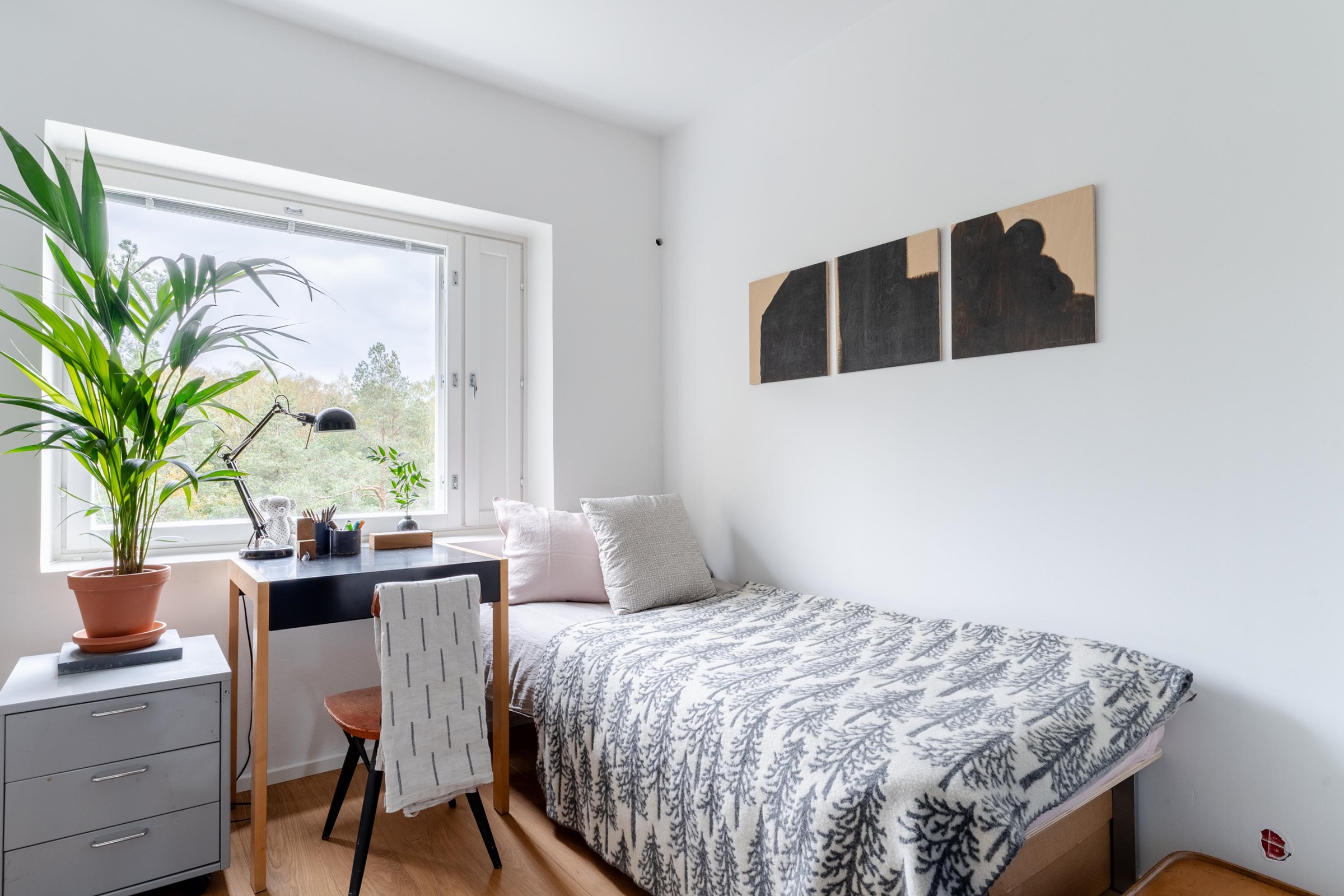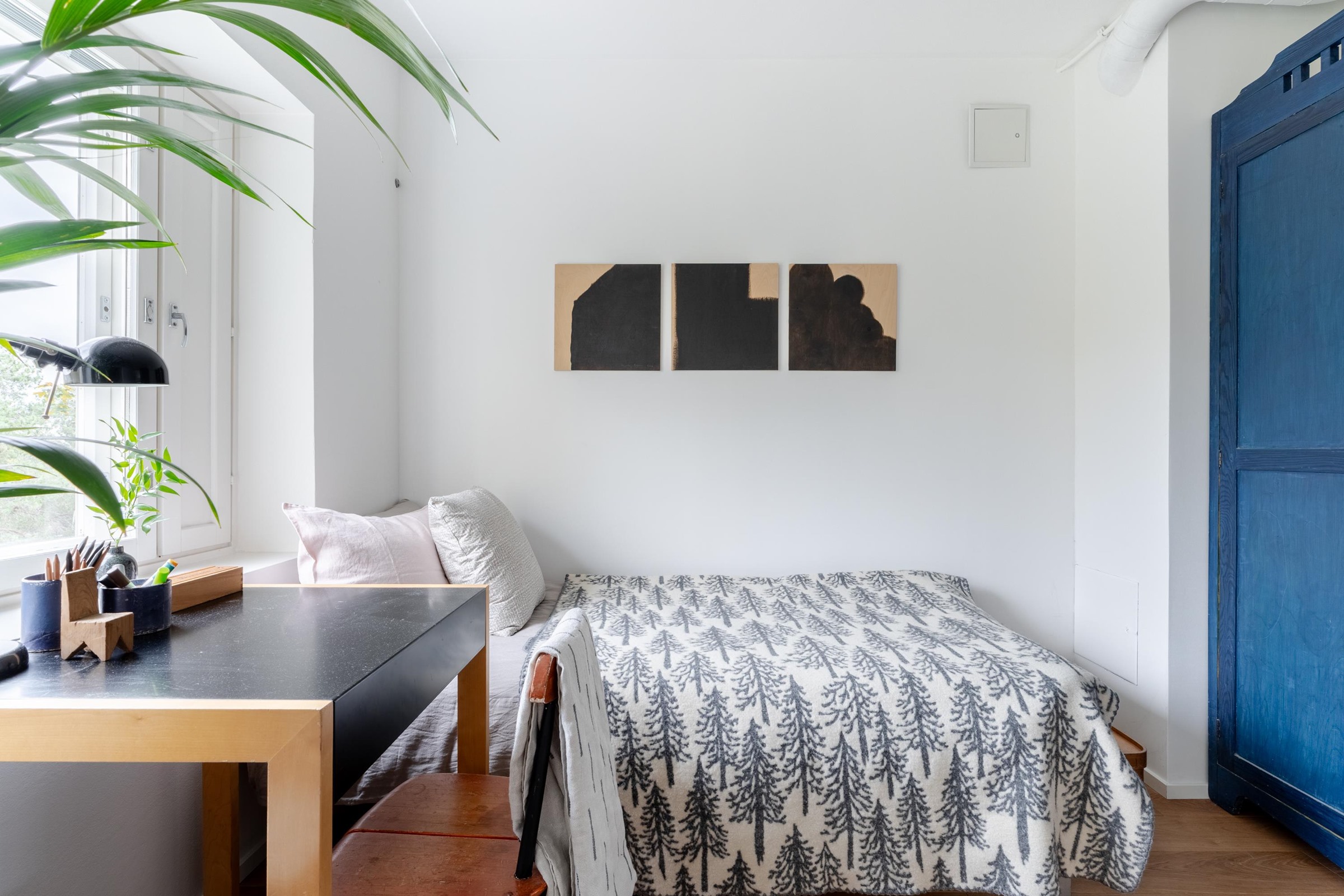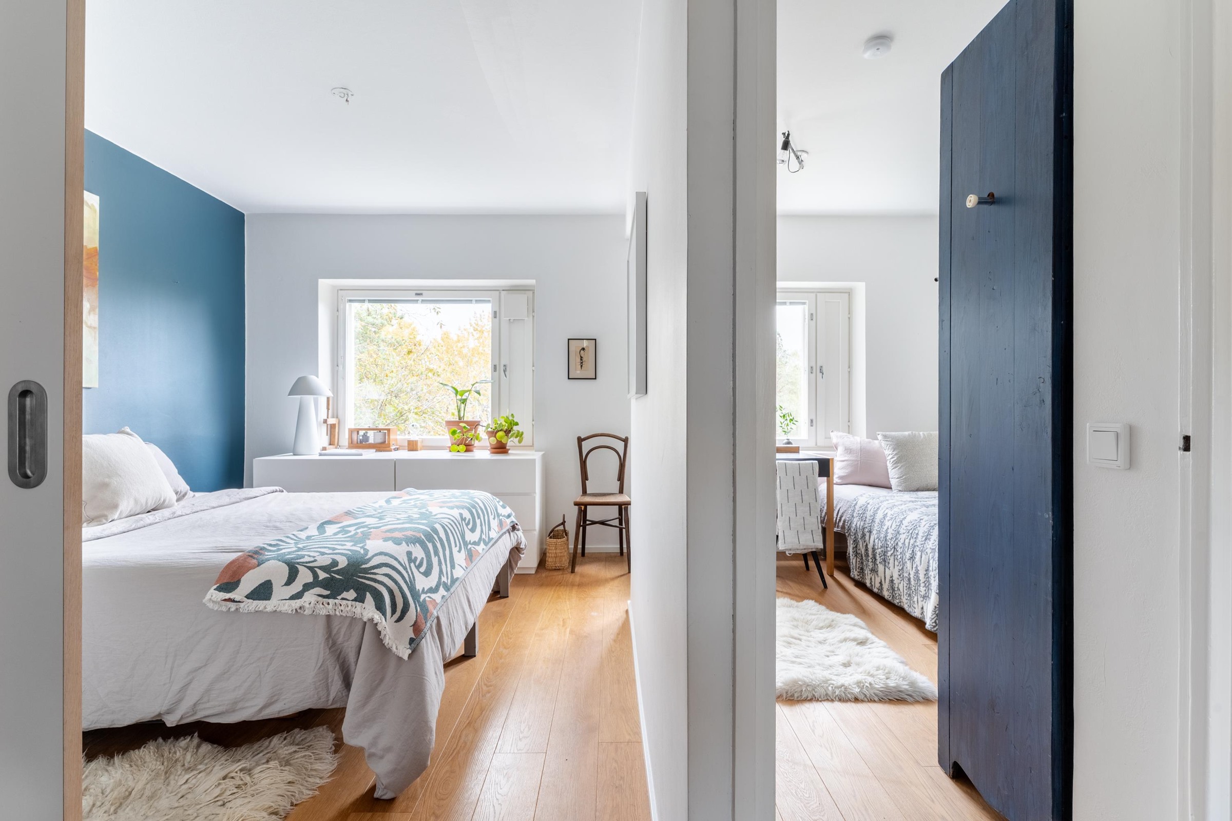 Molemmat makuuhuoneet sijoittuvat metsän puolelle, mikä tekee niistä seesteisiä ja rauhallisia. Tilaa rytmittävät liukuovet luovat monia mahdollisuuksia muuntaa kotia avonaiseksi ja ilmavaksi tai yksityiseksi tarpeen mukaan. Taitava tilasuunnittelu sitoo koko asunnon yhdeksi harmoniseksi kokonaisuudeksi.
