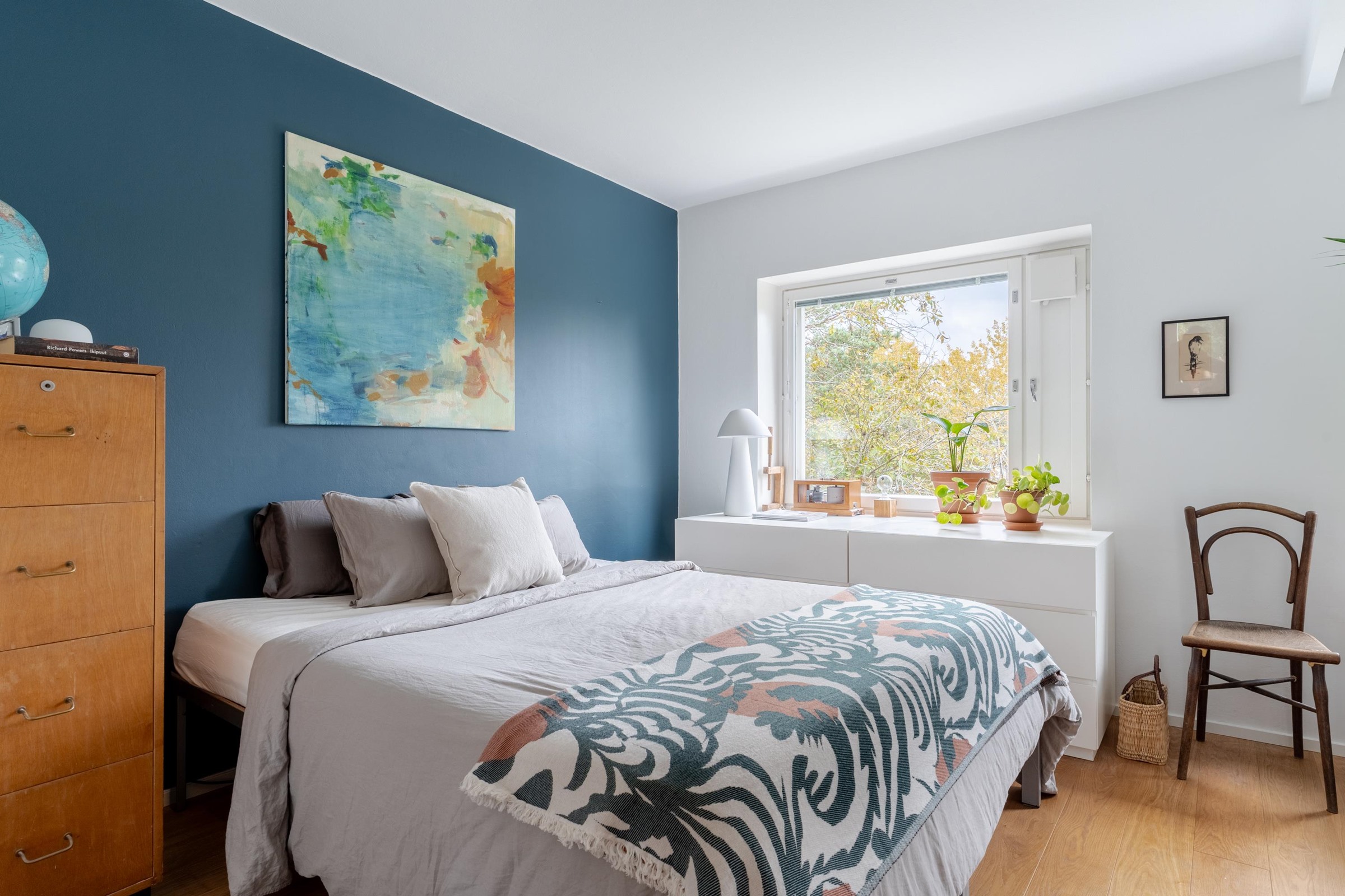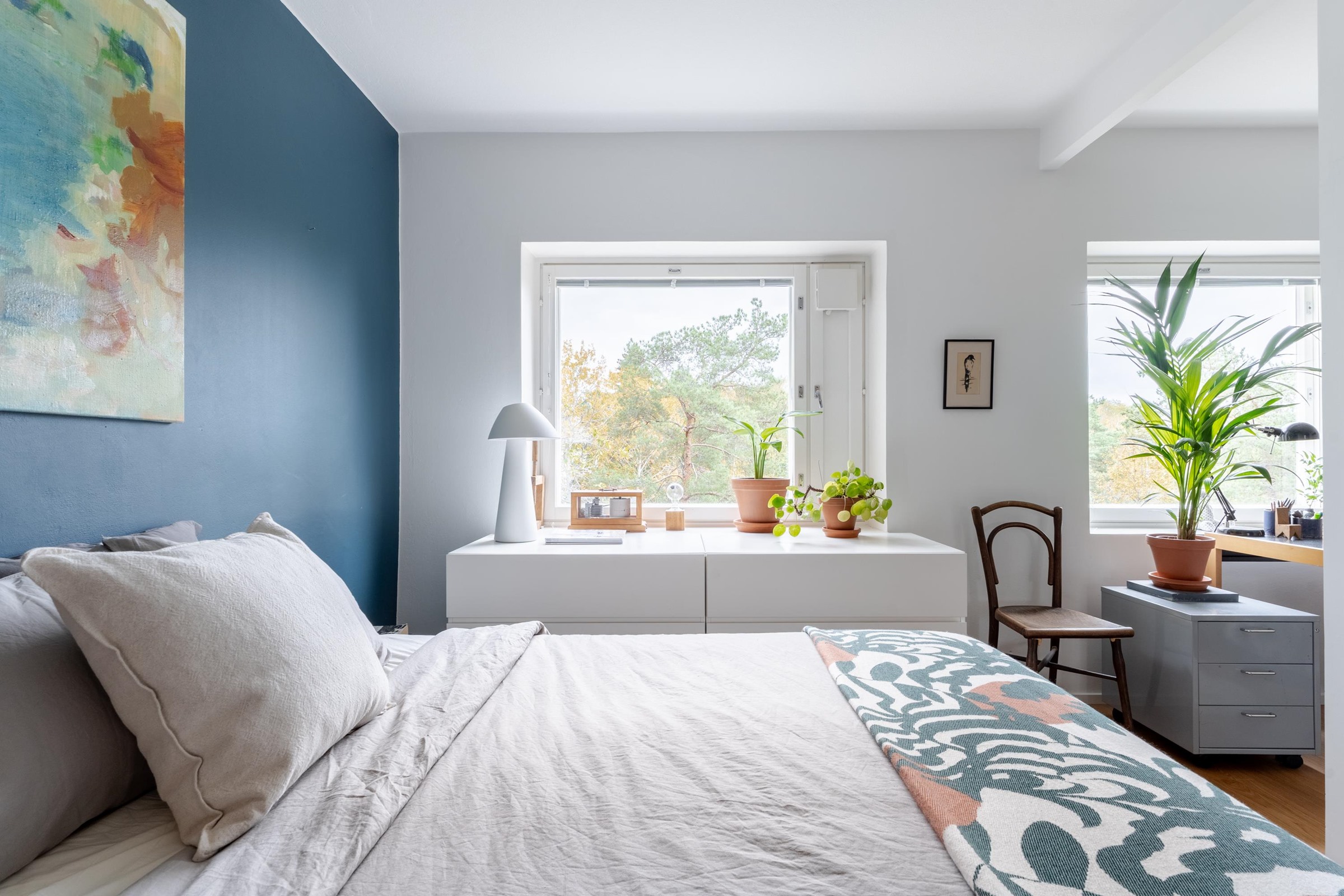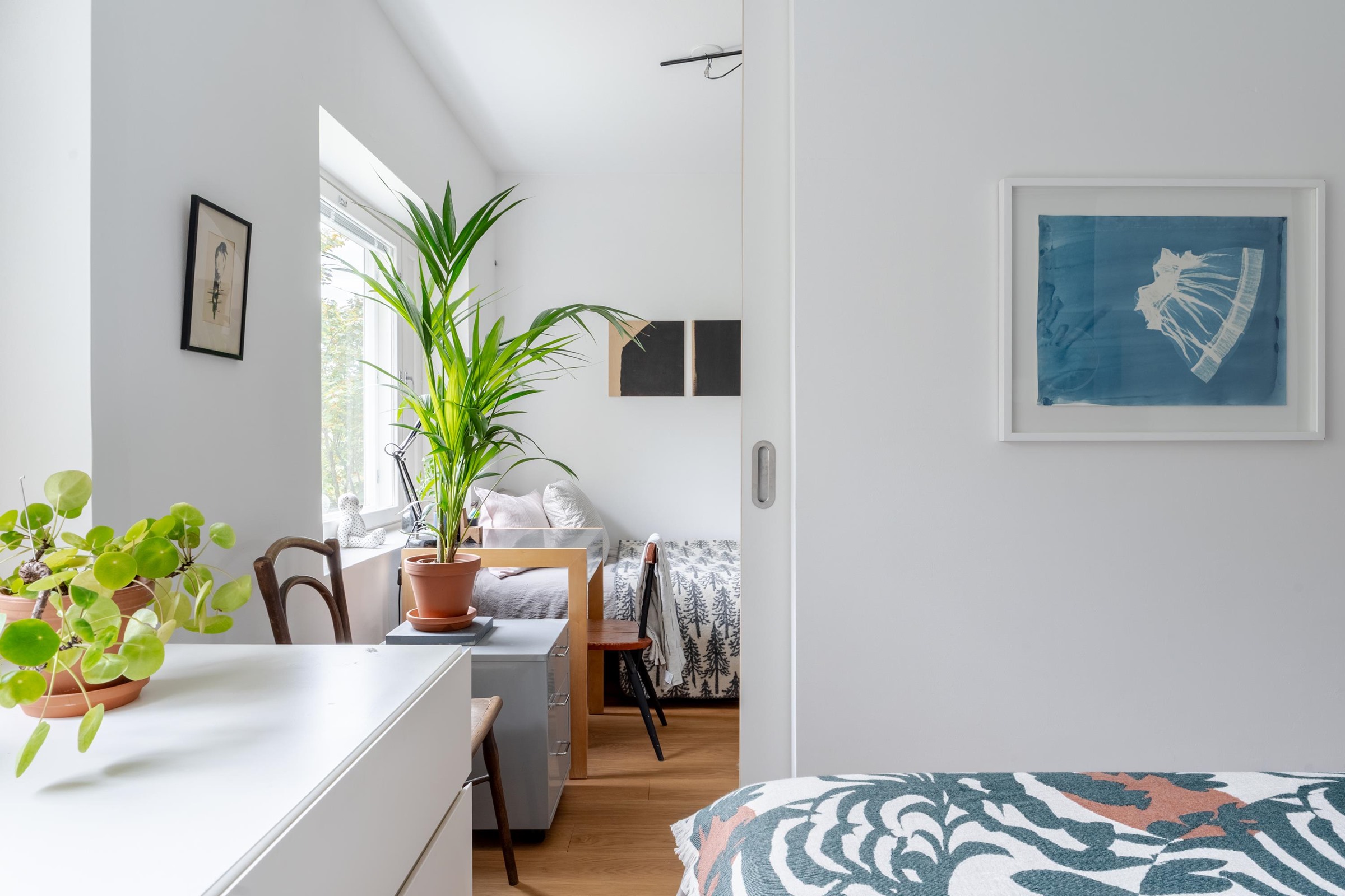 Molemmat makuuhuoneet sijoittuvat metsän puolelle, mikä tekee niistä seesteisiä ja rauhallisia. Tilaa rytmittävät liukuovet luovat monia mahdollisuuksia muuntaa kotia avonaiseksi ja ilmavaksi tai yksityiseksi tarpeen mukaan. Taitava tilasuunnittelu sitoo koko asunnon yhdeksi harmoniseksi kokonaisuudeksi.