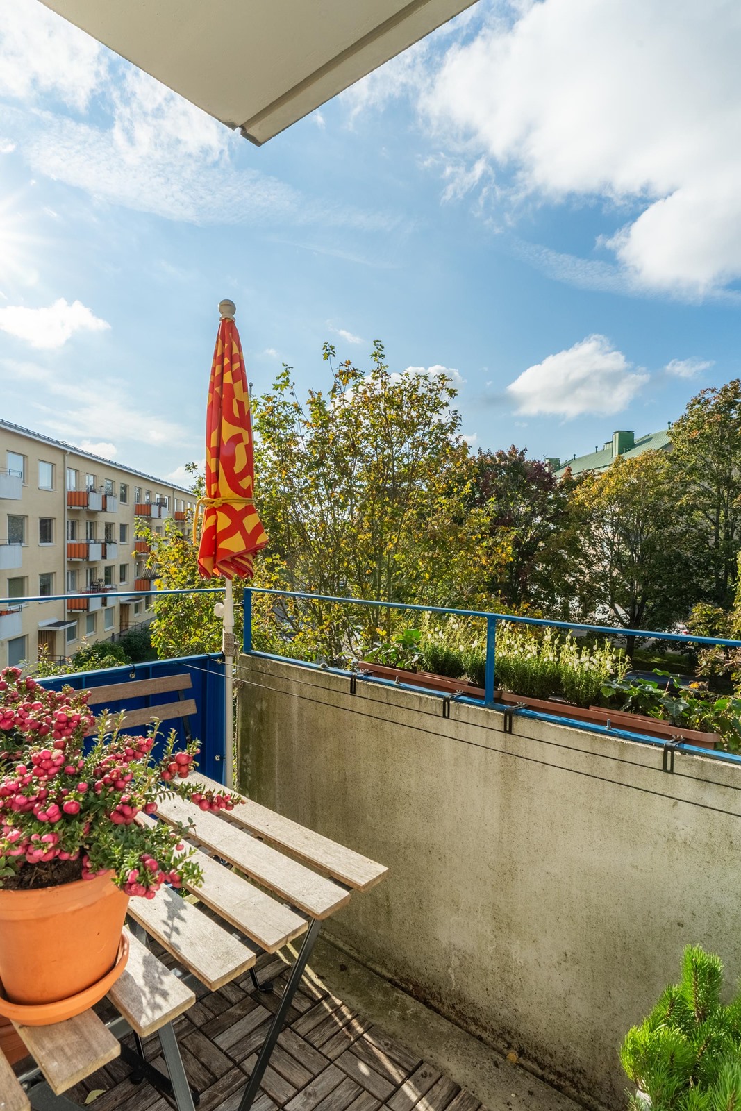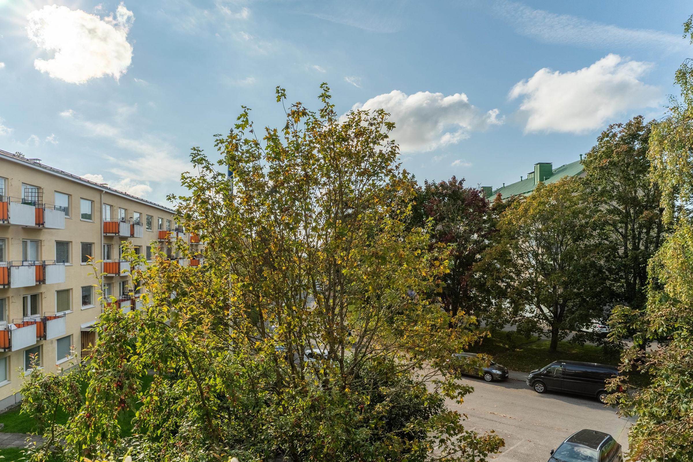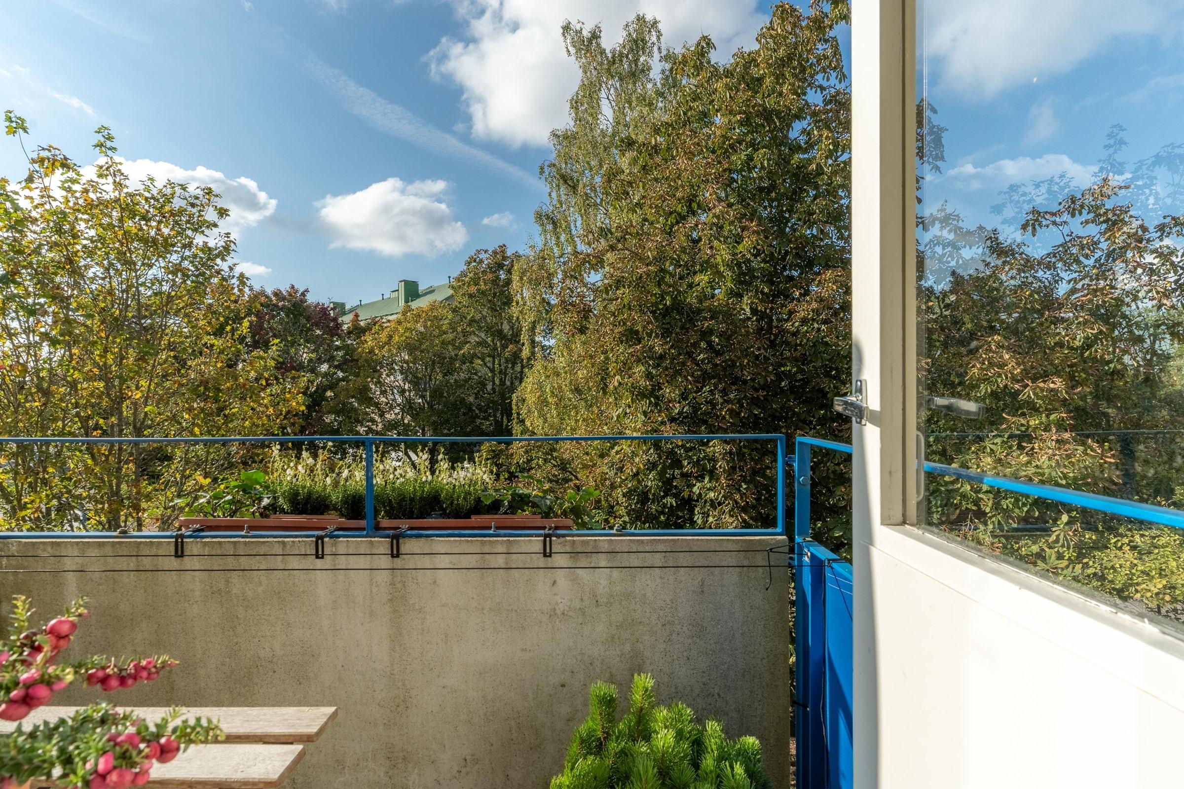 Suurista ikkunoista avautuvat puiden verhoamat esteettömät näkymät, ja parvekkeelta näkymä jatkuu kauniisti pitkin katua alas vehreässä ympäristössä.